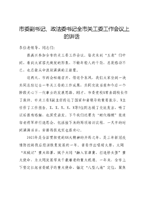 市委副书记、政法委书记全市关工委工作会议上的讲话各位老领导、同志们:很高兴参加全市的关工委工作会议。每次来到五老们中间,看到大家容光焕发的形象、不输年轻人的干劲,总是感动不已,也总能从中汲取满满的正能量。这两天,市两会相继召开,借这个东风,我们大家坐到一块共同总结过去一年关工委的工作成果,共同交流当前和今后一个阶段关心下一代事业的发展思路。刚才,市委党校X常务副校长作了致辞。市关工委X副主任传达了国家和省领导的重要批示。X主任作了工作报告。X、X、X、X、X等5位同志做了交流发言,听了以后很有感触,也深受启发。下午我们还要为时代楷模张连印老将军举行追思会,包括接下来的两项培训议程,一天半的时间满满当当,安排得很充实也很有心。2023年是全面贯彻党的XX大精神的开局之年,是三年新冠疫情防控转段后经济恢复发展的一年。省委作出唱好太原、大同双城记重大部署,赋予大同融入京津冀、打造桥头堡重大使命,为大同发展带来千载难逢的重大机遇。一年来,全市上下坚定扛起省委赋予的重大使命,锚定八型八地定位,聚焦八链合作路径,深耕科技(先进制造业)、能源、农业、文旅消费四大赛道,持续深化全方位转型,扎实推进高质量发展,经济社会保持向上向好的发展势头,各项工作取得了新进展开创了新局面。2023年也是全市关心下一代事业取得显著成效的一年。在市委、市政府的坚强领导和省关工委有力指导下,全市各级关工委急党政所急、想青少年所需、尽关工委所能,不断丰富教育内容创新关爱手段、拓展工作载体,各项工作都走在全省前列,有不少成效、经验、亮点,得到了国家和省关工委领导的充分肯定。一年来,我们活动开展有声有色。围绕讲好开学第一课,广大五老深入各类学校开展道德法制、红色革命教育,引导广大青少年听党话、感党恩、跟党走,开学第一课已经成为全省关工委系统的示范亮点。一年来,我们品牌创建有质有效。聚焦红色、法治、优秀传统文化教育积极创建品牌教育基地,青少年法治教育和三爱教育社会实践基地先后成功挂牌,全市7处红色场馆分别被国家和省关工委授予党史国史教育基地,基地覆盖面和品牌影响力持续扩大。一年来,我们典型引领有力有为以时代楷模张连印、全国最美五老岳忠、大同大学副教授张日升、广灵县关工委副主任刘吉合等为代表的五老先进典范,或拖着病体、挥洒余热,或敬业担当、笔耕不辍,他们的文可居文库——海量学习资料,手机电脑均可下载www.wenkeju.com事迹得到国家关工委的高度评价。特别是张连印老将军,退休后脱下军装换农装,绿化荒山、防风治沙,改善生态、造福村民,同时身体力行弘扬党和军队的优良作风,面向干部群众和青少年宣讲党和军队的光辉历史,即使身患癌症,依然奋斗不止。我来大同后,因为分管关工委工作,有更多的机会去接触老将军,每一次接触都会被老将军身上的那一股子劲、那种精气神所打动、所感染。老将军病重期间,市委卢书记一直非常挂念,专门委托我前去看望。老将军逝世后,遵照其生前所愿,亲属将骨灰带回故乡,撒到他倾心耕耘20载的土地。左云县千余名干部群众和社会各界人士自发走上街头,含泪送别老将军最后一程。老将军虽然走了,但他的事迹和精神将永远留在我们心中,激励我们不断前行。和老将军一样,全市广大五老,从工作岗位、领导岗位退下来之后,革命意志不衰、工作热情不减,继续在关心下一代的广阔舞台上默默耕耘、发光发热,彰显的是大爱情怀,展现的是责任担当,最终赢得的是全社会的尊重和爱戴。市委对关工委和五老的工作是充分肯定的。前期,省委常委、市委卢东亮书记多次就关工委工作作出批示指示,市委常委会两次研究关工委工作,并将每年的8月5日作为大同市关爱五老日,去年我们在市慈善总会建立五老关爱基金,进一步激发五老传承红色基因的使命感、荣誉感,特别是市委市文可居文库——海量学习资料,手机电脑均可下载www.wenkeju.com政府对标中办国办《意见》,去年4月份制定出台《关于加强新时代关心下一代工作委员会工作的若干措施》,为我们做好工作指明了方向、提供了遵循。会前,我就关工委和其他群团组织2023年的工作向卢书记做了汇报,卢书记肯定了我们过去一年来的工作,要求我们再接再厉、站稳站牢全省第一方阵,并特意叮嘱要把他的问候给大家带到,也借此机会代表市委向广大五老致以崇高的敬意,向全市从事关心下一代事业的工作者表示衷心的感谢!今年是新中国成立75周年,是实施十四五规划的关键一年,市委十六届六次全会暨经济工作会议上,我们立足过去一年良好发展态势,提出转型四步走战略目标。实现好既定目标需要全市上下只争朝夕、久久为功,作为社会主义事业的建设者和接班人,青少年是将来支撑大同发展的主力军。但随着经济社会的发展,青少年成长过程中面临许多新的