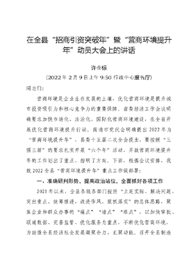 在全县招商引资突破年暨营商环境提升年动员大会上的讲话金许标(2022年2月9日上午9:50 行政中心告)报厅同志们:营商环境是企业生存发展的土壤,优化营商环境是提升城市投资吸引力和核心竞争力的重要保障。省委经济工作会议明确要求加快市场化、法治化、国际化营商环境建设,在全省开展优化营商环境提升行动。南通市党代会明确提出2022年为营商环境提升年,县委十五届二次全会提出,要按照三强三新的要求扎实开展六个年活动,并就营商环境提升年的工作划出了重点、指明了方向。下面,根据会议安排,我就2022全县营商环境提升年重点工作做部署:一、准确研判形势,提高政治站位,全面抓好各项工作2021年以来,全县各级各部门按照立足实际、解决问题,突出重点、统筹推进,改进作风、狠抓落实的总体思路,聚焦企业和群众办事的痛点堵点难点,以加快审批、联通数据、完善监管、优化服务为重点,不断优化营商环境,为助推全县经济社会发展凝聚合力、汇聚动能。召开全县制造业创新发展暨优化营商环境大会,印发了《关于进一步优化营商环境的实施意见》等一系列文件,为营商环境持续优化提供的政策支撑;成立企业登记一站式服务专区,惠及全县13349家新设市场主体;建立工业项目拿地即开工模式,确保企业在取得不动产权证后3个工作日内领取施工许可证;在全省率先实现不动产登记跨省通办,开启了互联网+不动产登记新里程碑;持续开展金牛奖评选活动,大力营造爱护企业、尊重企业家的浓厚氛围;严格落实减税降费政策措施,四大行业减税面超过98%,全年减免税金约40亿元,其中新增减税降费7亿元。虽然我县营商环境持续改善,但与经济社会发展的新形势新要求相比,与广大企业、群众的需要期盼相比,仍然存在较多不足和短板。个别部门靠前服务意识还不强,还处在企业群众需要、我们尽力提供的阶段,想在前、做在前的靠前服务意识还不强;社会信用信息评价和应用机制还不完善,信用应用场景还比较狭窄;基层政务服务体系短板还比较突出,下放的行政权力事项还存在接不住、用不好、办不了的情况;政务服务全程网办占比不高,实现群众少跑路、数据来跑腿目标任重道远。对此,各镇(区、街道)、各有关部门务必高度重视,直面存在的问题和不足,永葆闯的文可居文库——海量学习资料,手机电脑均可下载www.wenkeju.com精神、创的劲头、干的作风,上下联动破难题,步调一致抓落实,推动全县优化营商环境工作取得新的进展和成效。二、聚焦工作重点,瞄准目标发力,全速提升营商环境(一)公正有力,积极营造竞争有序的市场环境。一是提高市场开放程度。全面实施市场准入负面清单制度,除法律禁止的范围外一律开放。全面规范市场准入程序,除法律法规规定的审查环节外一律不得设定市场准入障碍。二是提高政务公开程度。合理引导投资方向,及时发布中长期规划和年度计划、产业政策、宏观经济走势分析等,加强宣传解读。公开透明配置公共资源,及时发布重要基础设施建设、重大投资项目计划、国有产权交易、工程建设项目招标投标等信息。三是提高市场监管效能。加快实现双随机、一公开监管全覆盖,实施差异化监管,实现联合抽查常态化。加强知识产权保护,完善知识产权保护机制,探索知识产权质押融资,研究制定我县知识产权质押融资的政策意见,进一步激发市场主体活力,助推企业高质量发展。四是提高信用服务水平。加快信用体系建设,加强重点领域政务诚信建设,建立健全以信用为基础的新型监管机制。(二)靶向精准,积极营造便捷高效的政务环境。一是优化审批服务。全面推行一站式拿地即开工住所与经文可居文库——海量学习资料,手机电脑均可下载www.wenkeju.com营场所分离登记证照分离等改革举措。工程建设一站式办理,深化规划用地多审合一、多证合一改革,推进多评合一、区域评估、联测联验工作,不断简化项目审批或核准手续,重点聚焦重大项目,紧盯项目审批中关键领域、重点环节和难点问题,进一步畅通项目报审最先一公里。二是优化不动产登记服务。强化互联网+不动产登记,推广不动产登记信息共享集成做法,实行登记、交易、缴税一体化受理,全面实现1个工作日办结,积极推进一证通办常态化,加快提升跨省通办便利度。三是健全代办帮办服务体系。研究出台《如东县加快推进政务服务代办帮办工作的指导意见》,以便民利企为出发点,紧盯政务服务痛点、难点、堵点,提供全县域、全领域、全覆盖的代办帮办服务,常态化开展代办人员培训,编制代办事项操作细则。四是优化办税服务。深化推广办税服务一次成改革,拓展一次成事项范围,实现税费服务一口进、一口出,解决纳税人多头跑、多次跑问题。加强数据分析,完善企业纳税人画像,建立税费政策享受条