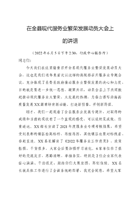 在全县现代服务业繁荣发展动员大会上的讲话(2022年6月5日下午2:30,行政中心报告厅)同志们:今天我们在这里隆重召开全县现代服务业繁荣发展动员大会,这也是我们近年来首次以这样的高规格召开服务业专题会议,充分体现了县委县政府推动服务业繁荣发展的决心和力度,目的就是要进一步统一思想、凝聚共识,动员全县上下共同掀起推动现代服务业大繁荣、大发展的热潮,为奋力谱写沿海高质量发展XX篇章培育新动能、打造新引擎、开创新局面。刚才,我们一起观看了全县服务业发展专题片,对取得的成绩和当前的现状有了一个直观的感受,可以说初见成效、任重道远。XX部长宣读了2021年度服务业专项考核结果,希望受到表彰的镇区抬高标杆、再接再厉,其他镇区也要对标找差、奋起直追。XX县长解读了《2022年服务业工作意见》,政策性强、干货很多,大家会后要加强学习消化。6家单位作了很好的交流发言,思路清晰、举措务实,特别是2位企业家代表信心满满、干劲很足,期待你们大展宏图、再创佳绩。XX县长就具体工作进行了全面系统的部署,我完全同意,希望大家抓好落实。下面,就做好现代服务业繁荣发展相关工作,我再讲三个方面的意见。一、加快发展现代服务业其时已至、其势必行,必须在把握大势上保持定力现代服务业是分工和专业化发展到一定阶段的产物,是衡量一个地区经济发展水平的重要标志,更是我们优化经济结构、转换增长动力、更好满足人民美好生活需要的现实需求,必须着眼长远、站位全局、顺应规律,进一步增强加快发展现代服务业的思想共识和行动自觉。我们要充分认识到,加快发展现代服务业是政策导向,更是时代机遇。近年来,为应对错综复杂的宏观环境和前所未有的疫情挑战,各级都出台了关于繁荣市场、刺激消费、保障民生的一系列政策文件,为服务业发展营造了良好环境。特别是今年以来,国家发改委等14个部门联合印发了《关于促进服务业领域困难行业恢复发展的若干政策》,省里也出台了《先进制造业和现代服务业融合发展标杆引领工程实施方案》等文件,帮助服务业企业纾难解困、加快发展。3月份,市里高规格召开现代服务业繁荣发展动员大会,明确提出加快建设具有国际竞争力的长三角现代服务业高地,吹响了全面推进现代服务业振兴发展的号角。对XX来说,在一带一路倡议、长三角一文可居文库——海量学习资料,手机电脑均可下载www.wenkeju.com体化、向海发展等战略机遇的叠加下,在XX等一大批重大项目的支撑下,在XX新机场、XX等重大交通工程的利好下,在众多政策的激励支持下,我们即将迈上城市集聚发展、产业融合发展的快车道,服务业也将迎来前所未有的发展环境和千载难逢的发展机遇。我们要充分认识到,加快发展现代服务业是发展所需,更是大势所趋。从当前我们的经济结构来看,服务业已经成为经济发展的重要支撑、重要增量(去年全县实现服务业增加值543.4亿元,占GDP比重为42.7%,拉动了3.9个百分点,对全县经济增长贡献率达到43.4%)。但我们也要清醒看到,XX服务业起步晚、底子薄,几个亮眼的数据并不等于整体发展水平的领先(比如,服务业应税销售达到1532亿元,同比增长13.7%,总量全市排名第4,增幅全市排名第3,但是LNG的数据占比近35%,在里面作出了巨大贡献;比如,社消零同比增长17.41%,增幅排全市第1,但是477.8亿元的总量却只位居全市第5;再比如,我们应税销售千万元以上的服务业企业只有735家,在全市也处于落后的位置,等等,这些都表明我们的服务业还处在发展的起步期)。要加快经济社会全面发展、加速追赶超越,就必须在服务业发展中寻求更多动能。从更广视角来看,无论是欧美发达国家,还是苏南、浙江这些先进地区,文可居文库——海量学习资料,手机电脑均可下载www.wenkeju.com当工业经济发展到一定程度、一定阶段,必然会对服务业提出更高的需求和要求,两者之间将形成一种相辅相成、相互促进的良性循环,发达的服务业必然是发达经济体的重要板块和重要标志(尤其近几年,随着短视频等平台的爆发式成长,西安、成都、苏州、杭州等城市借助网红城市的热度推动服务业实现了再繁荣、再发展,可以说重视服务业、发展服务业已经成为大家促进经济发展的统一共识和大势所趋)。我们要充分认识到,加快发展现代服务业是重要支撑,更是必由之路。现代服务业连接着生产和消费,渗透于工业和农业,涵盖广泛、外延丰富,对调整经济结构