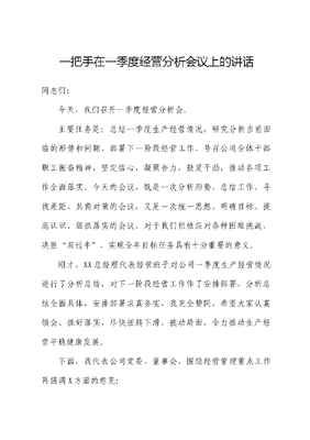 一把手在一季度经营分析会议上的讲话同志们:今天,我们召开一季度经营分析会。主要任务是:总结一季度生产经营情况,研究分析当前面临的形势和问题,部署下一阶段经营工作,号召公司全体干部职工振奋精神,坚定信心,凝聚合力,鼓足干劲,推动各项工作全面落实。今天的会议,既是一次分析形势、总结工作、寻找差距、共商对策的会议,又是一次统一思想、明确目标、提高认识、狠抓落实的会议,对于我们积极应对各种困难挑战,决胜双过半,实现全年目标任务具有十分重要的意义。刚才,XX总经理代表经营班子对公司一季度生产经营情况进行了分析总结,对下一阶段经营工作作了安排部署,分析总结全面具体,安排部署求真务实,我完全赞同,希望大家认真领会、抓好落实,尽快扭转下滑、被动局面,全力推动生产经营平稳健康发展。下面,我代表公司党委、董事会,围绕经营管理重点工作再强调X方面的意见:一、正视问题、认清形势,始终坚定发展信心今年以来,面对严峻复杂的国际环境和艰巨繁重的改革发展稳定任务,XXXX坚持以A新时代中国特色社会主义思想和党的XX大精神为引领,全面落实党中央、国务院决策部署和国资委、集团公司党委各项工作要求,坚持稳中求进、以进促稳、先破后立工作总基调,紧紧围绕全年经营目标,以管理提升为牵引,聚焦高质量发展主线,统筹发展和安全,积极克服国内外复杂形势带来的不利影响,站位全局、攻坚克难,扎实推进各项工作落实落地。总体来看,一季度经营工作呈现以下特点:一是从主要经营指标层面看,经济运行开局平稳。一季度在多重风险挑战下,全体干部职工勇挑重担,迎难而上,生产经营开局平稳,实现营业收入XX亿元,同比增长XX%,再创历史同期新高,但利润相关指标完成情况与时间进度存在较大差距,盈利能力较去年同期进一步下降,创效能力有待提高,恢复势头尚不明显。面对下行压力,实现全年目标任务,需要我们付出更大的努力。文可居文库——海量学习资料,手机电脑均可下载www.wenkeju.com二是从可持续发展层面看,市场拓展成效显著。公司上下认真贯彻落实集团公司市场拓展千亿目标总要求,聚焦国家重大区域发展战略,积极构建网格化市场体系,强化市场龙头作用。一季度,累计新签合同额XX亿元,完成年度目标的XX%,其中,XX公司新签XX设计施工项目,合同额XX;XX分公司新签XX项目,合同额XX;XX新签XX项目,同额XX亿元。三是从内部运营层面看,经营质量有效改善。XXXX深入开展提质增效各项工作,启动对标世界一流价值创造行动,聚焦法人压减、两金清收、亏损企业治理、成本费用压降等重点工作,着力抓重点、补短板、强弱项,业务结构和经营质量得到进一步改善。一季度,全集团回收两年以上应收账款XX亿元,压减法人企业XX户,亏损企业同比减少XX户。集团总部带头压降管理费用XX万元,较预算压降XX%,为各级企业做出了示范和表率。四是从企业管理层面看,精细化水平有效提升。公司上下深入贯彻管理提升年部署要求,聚焦提升精细化管控水平。文可居文库——海量学习资料,手机电脑均可下载www.wenkeju.com对所属单位逐一开展经营预算穿透式重审工作,全面挖潜增效,推动经营理念层层传导,经营责任层层压实,有效提升了各单位经营管理能力,使得精细化、精益化管理理念得到有效贯彻,进一步提升了经营预算的科学性和可行性,为全年经营工作开展奠定了良好基础。五是从各单位运营情况层面看,两极分化依然严重。XX、XX、XX分公司、XXX等X家单位营业收入超过X亿元,占公司合并营业收入的X%;XX等X家单位贡献利润超过XX,是所属单位总利润的XX%。同时,我们也看到,还有近一半的单位营业收入和利润总额完成进度均低于XX%。这些单位,要想方设法克服困难,补齐欠账、尽快迎头赶上。四是创新能力不断增强。XXXX坚持把科技创新作为推动公司高质量发展的首要驱动力,深入实施科技强企战略,夯实制度基础,加快平台建设,加大研发投入,狠抓技术攻关,强化产学研用协同和科技成果转化,全面提升关键核心技术创新能力。一季度,实现研发投入强度XX%,同比增加XX个百分点五是深化改革全面推进。XXXX全面贯彻落实国企改革三年文可居文库——海量学习资料,手机电脑均可下载www.wenkeju.com行动部署,党委前置研究事项清单、董事会应建尽建、外部董事占多数、经理层任期制和契约化管理等重点任务均已完成。积极推进董事会授权管理,董事会建设和运行日趋规范。各单位、各部门严格按照对标提升清单任务逐项梳理落实,一季度末完成进度达到XX%,经营管理水平不断增强。今年以来,面对日益复杂严峻的国内外经济形势,公司上下攻坚克难,奋勇争先,以实际行动响应党中央、国资委、集团公司关于改革发展的号召要求。党委班子靠前指挥,聚焦主业,主动出击,紧盯重