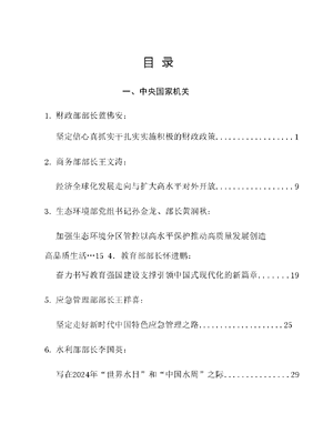 目录一、中央国家机关1.财政部部长蓝佛安: 坚定信心真抓实干扎实实施积极的财政政策1 2.商务部部长王文涛: 经济全球化发展走向与扩大高水平对外开放9 3.生态环境部党组书记孙金龙、部长黄润秋: 加强生态环境分区管控以高水平保护推动高质量发展创造高品质生活…15 4.教育部部长怀进鹏: 奋力书写教育强国建设支撑引领中国式现代化的新篇章.19 5.应急管理部部长王祥喜: 坚定走好新时代中国特色应急管理之路..25 6.水利部部长李国英: 写在2024年世界水日和中国水周之际29 7.中国气象局局长陈振林: 加快推进气象科技能力现代化和社会服务现代化.32 8.国家市场监督管理总局局长罗文:深刻领会XXXXXX关于党的建设 的重要思想以高质量党建引领小个专高质量发展..36 9.中国气象局局长陈振林: 以高质量气象文化建设助推气象高质量发展..41 10.中央广播电视总台台长慎海雄: 深学细悟第二个答案笃行实干推进自我革命45 11.全国社会保障基金理事会党组书记丁学东: 坚定不移走中国特色金融发展之路推动社保基金事业高质量发展……49 12.中央农办主任韩文秀: 巩固和增强经济回升向好态势.54 文可居文库——海量学习资料,手机电脑均可下载www.wenkeju.com13.全国党建研究会会长李智勇: XXXXXX关于党的自我革命的重要思想的哲学意蕴和时代意义……58 14.国家数据局局长刘烈宏: 加快构建全国一体化算力网推动建设中国式现代化数字基座.66 15.故宫博物院院长王旭东: 在故宫感受中华文明的深厚底蕴和万千气象.72 二、省委书记16.江西省委书记尹弘:聚焦走在前、勇争先、善作为目标要求 加快打造革命老区高质量发展高地79 17.江西省委书记尹弘: 聚焦走在前、勇争先、善作为奋力谱写中国式现代化江西篇章..81 18.湖南省委书记沈晓明: 文可居文库——海量学习资料,手机电脑均可下载www.wenkeju.com牢固树立和践行正确政绩观在推动高质量发展上闯出新路子.87 19.辽宁省委书记郝鹏: 乘势而上攻坚必胜续写全面振兴新篇章..90 20.浙江省委书记易炼红:在打造高素质干部队伍、高水平创新型人才和 企业家队伍、高素养劳动者队伍大会上的讲话..93 21.浙江省委书记易炼红:持续推动八八战略走深走实 在高质量发展中打开稳进立新局面..102 22.云南省委书记王宁: 在省委农村工作会议上的讲话.105 23.陕西省委书记赵一德: 发挥科教优势培育新质生产力走好依靠创新驱动内涵型增长之路……112 24.山西省委书记唐登杰: 文可居文库——海量学习资料,手机电脑均可下载www.wenkeju.com奋力书写高质量发展和现代化建设山西答卷.115 25.甘肃省委书记胡昌升: 深入学习贯彻XXX文化思想加快建设繁荣兴盛的文化强省118 26.福建省委书记周祖翼: 实施新时代民营经济强省战略促进福建民营经济发展壮大121 27.吉林省委书记景俊海: 在全省优化营商环境加快项目建设大会上的讲话124 28.吉林省委书记景俊海: 推动全面振兴率先实现新突破让新时代吉林更加丰富多彩…135 29.河北省委书记倪岳峰: 加快建设经济强省美丽河北扎实推进高质量发展向上突围文可居文库——海量学习资料