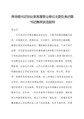局党组书记与处室直属事业单位主要负责纪委书记廉政谈话提纲同志们:今天我们召开集体廉政谈话会议,主要目的就是提醒大家进一步提高认识,明确任务,压实责任,始终保持头脑清醒、增强纪律意识和规矩意识、绷紧廉洁自律这根弦,干净干事不出事,切实担负起抓好党风廉政建设和本职工作的双重责任,不辜负组织的信任与重托。2023年,全局深入贯彻XXX新时代中国特色社会主义思想,全面学习贯彻党的XXX精神,坚持党要管党、全面从严治党,从严正风肃纪反腐,较好地完成了党风廉政建设工作的目标任务。党组把方向、管大局、保落实的领导作用得到充分发挥。XX工作得到了省委省政府的充分肯定,2023年我们局绩效考核,再次获得优秀档次,党建引领作用得到了充分体现。但是我们也必须清醒认识到存在的问题和不足,近年来,一些党员领导干部抵挡不住诱惑,利用职务上的便利索取好处,越过了法律的高压线;党建和党风廉政建设工作依然存在上冷下热的现象,党员干部作风、纪律和规矩意识不强,个别党员干部违规违纪问题还时有发生。在座的各位都是我们局的中坚力量,承担着具体工作的落实和党员干部教育管理的重要职责。因此,大家对工作中存在的问题,必须高度重视、高度警醒,自觉强化责任担当,以坐不住的责任感、慢不得的紧迫感、等不起的使命感,以身作则、以上率下,当好标杆、作好示范,为今年能源工作有效开展提供坚强的保障。我作为能源局落实全面从严治党主体责任的第一责任人,有责任同大家一起座谈交流,传递信号、统一思想、达成共识。结合今天的会议,我谈以下几点意见,和大家一起交流,一起共勉。一、提高认识,坚持政治立身。思想上松一寸,行动就会散一尺。作为领导干部要自觉用XXX新时代中国特色社会主义思想武装头脑,要坚持学而信、学而用、学而行,真正做到知行合一、言行一致、表里如一,全力推动全面从严治党落地生根。要严明党的政治纪律和政治规矩,自觉遵守和敬畏党规党纪,深刻认识各类腐败问题的政治本质和政治危害,始终绷紧全面从严治党这根弦,以永远在路上的坚韧和执着,坚决文可居文库——海量学习资料,手机电脑均可下载www.wenkeju.com贯彻中央、省委新部署新要求,推动管党治党,党风廉政建设取得新成效。要严格遵循坚定信念、为民服务、勤政务实、敢于担当、清正廉洁的好干部标准,自觉做到心中有党、心中有民、心中有责、心中有戒,恪守廉洁从政的准则,秉持克己奉公的操守,时刻保持高度的政治自觉和政治清醒,真正做政治上的明白人。二、加强学习,坚持本领立身。认清大势,方能顺势而为。面对当前能源工作领域的新挑战,工作阶段的新转换,工作要求的新标准,我们要更加自觉地把学习作为提高素质的重要途径,有效抓手,不断突破自我、完善自我、提升自我,努力拓宽视野,提高领导水平,增强廉洁自律意识。一要在学习党内法规上下功夫。落实局党组(委)理论学习中心组、各支部周学习等制度,要把学习党规党纪作为首要的政治任务,带头学习好党规党纪,特别是要结合今年即将开展的集中性纪律学习教育等活动,深入学习《党章》《廉洁自律准则》《关于新形势下党内政治生活的若干准则》和新修订的《中国共产党纪律处分条例》等党内法规,要原原本本地学,逐条逐文可居文库——海量学习资料,手机电脑均可下载www.wenkeju.com句地学,深入具体地学,决不能满足于一般的了解和掌握,产生丝毫厌学情绪,真正把党规党纪学深、学透、学出心得。二要在学习规章制度上下功夫。近年来,中央和省出台了以八项规定为重点的一系列规章制度,对依法行政、财经纪律、重大事项报告等作出明确规定,但在具体的执行中还是有这样那样的问题。原因虽然是多方面的,但思想意识不够、制度意识不强,对制度的学习不深、不透、不细、不实是主要原因。大家要站在全面从严治党的新形势下,静下心来、挤出时间,认真系统地学习相关规章制度,包括局内部的规章制度,要结合工作学、带着问题学、反复思考学,坚持学以致用,用以致学,切实提高制度的执行力,强化制度的约束力,自觉规范权力运行。三要在学习业务理论上下功夫。要采取学习XXX新时代中国特色社会主义思想读书班和能源大讲堂等形式,结合今年能源工作的实际,全面学习中央、省各种会议精神和部署要求,特别是要把学习贯彻XXXXXX关于党的自我革命的重要思想和中央纪委及省纪委三次全会精神作为重中之重,抓紧抓实抓到位,真正把上级的要求部署体现在工作思路里,落实在工作措文可居文库——海量学习资料,手机电脑均可下载www.wenkeju.com施上,贯彻于工作实践中。尤其我们近期工作岗位新调整的一些干部,面对新岗位、新业务、新任务,必须要静下心来加强自身业务知识的学习,尽快成为能独挡一面的行家里手,对自己工作业务和相关方面的政策要学懂吃透,掌握工作规律,打开工作局面