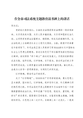 在全市司法系统主题教育读书班上的讲话同志们:党的XX大报告指出,全面依法治国是国家治理的一场深刻革命,关系党执政兴国、关系人民幸福安康,关系党和国家长治久安。必须更好发挥法治固根本、稳预期、利长远的保障作用,在法治轨道上全面建设社会主义现代化国家。当前,根据中央部署在市委领导下,市司法局正深入开展学习贯彻XXX新时代中国特色社会主义思想主题教育,推动全体党员干部全面贯彻落实党的XX大精神,深刻领悟两个确立的决定性意义,用党的创新理论武装头脑、指导实践,以学铸魂、实干担当,推动司法行政工作取得明显成效,以高质量法治服务保障X高质量发展。借此机会,由我为大家作一堂党课报告,与同志们共同交流。以学铸魂,锻造司法行政铁军。关于以学铸魂,XXXXXX在广东考察时强调,要从思想上正本清源、固本培元,以学铸魂,筑牢信仰之基、补足精神之钙把稳思想之舵。市司法局把开展主题教育作为当前和今后一个时期最重要的政治任务,牢牢把握学思想、强党性、重实践、建新功的总要求,紧紧锚定目标任务,全面落实重点措施,加强组织领导,在思想上来一次升华,在精神上来一次洗礼。一是通过学习使广大党员干部增强对党的价值追求和前进方向的高度政治认同。坚定对马克思主义的信仰、对中国特色社会主义的信念对实现中华民族伟大复兴中国梦的信心。二是通过学习进一步加强党的领导。坚定维护党中央权威和集中统一领导,不断提高政治判断力、政治领悟力、政治执行力,始终在政治立场、政治方向、政治原则、政治道路上同以XXX同志为核心的党中央保持高度一致。三是通过学习扎根本职工作。进一步提升党员干部的马克思主义修养,引导树立踏实肯干的工作作风,营造学习先进、崇尚典型、甘于平凡的良好氛围,做党信得过、靠得住、能战斗的司法行政铁军。以学增智,锤炼干事创业能力。XXXXXX指出:中国共产党历来重视学习、善于学习。干部特别是年轻干部要提高政治能力、调查研究能力、科学决策能力改革攻坚能力、应急处突能力、群众工作能力、抓落实能力等七种能力。主题教育为市司法局干部队伍提供了非常好的学习机会,我们要克服本领恐慌,学深悟透,以学增智,持续提升素质,不断增强履职本领,锤炼干事创业能力。一是提升政治能力。把握正确的政治方向,辨别政治是非、保持政治定力、防范政治风险,对党的政治纪律和政治规矩怀有敬畏之心。二是提升调查研究能力。当前,市司法局全面深化改革工作点多面广、任务重、难度大,要坚定群众路线,通过调查研究,搞清楚目前工作中的问题是什么、症结在哪里,拿出破解难题的实招、硬招。三是提升科学决策能力。不科学的决策,非但解决不了问题,还容易衍生出新的问题,高质量发展,很大程度上取决于决策水平要培养战略思维,锤炼战略眼光,勇于担当,发挥集体智慧,科学决策。四是提升改革攻坚能力。推进全面依法治市工作,改革任务重,攻坚难度大,要发扬越是艰险越向前的斗争精神,坚持实事求是,坚持问题导向,坚持群众路线,坚持系统思维和顶层设计。五是提升应急处突能力。目前市司法局监狱(戒毒)、社区矫正、律师公证、综合行政执法、立法等工作在开展过程中因为工作性质都有较高的风险隐患,要提高风险研判、应急准备、突发处置、风险沟通、反思学习等各方面的能力。六是提升群众工作能力。比如今年市司法局将未成年人法律援助工作纳入了全市为民办实事事项,这就要求相关部门的同志要有想法、有方法有办法,集中力量服务好群众。七是提升抓落实能力。会不会抓落实,是检验干部的试金石,要发扬求真务实、艰苦奋斗的优良作风,知难而进、锲而不舍地坚决落实好市委决策部署。以学正风,铭刻司法为民本色。党的XX大报告指出:中国共产党领导人民打江山、守江山守的是人民的心。要想做好工作,首先风气要正,以学正风,要求我们把纠治形式主义、官僚主义摆在更加突出的位置,做到公正用权、依法用权、为民用权、廉洁用权,把新时代政法干警十个严禁作为铁的纪律,深入落实中央八项规定精神,全面从严纠治顽瘴痼疾,营造风清气正的工作环境,铭刻司法为民本色。司法为民,核心是要将司法行政工作为了谁、依靠谁、保障谁这一根本问题深深扎根于每一位干部心中。要牢记问题导向,以人民群众满意为目标,大兴调查研究之风,走好新时代党的群众路线,扑下身子、沉到一线,问计于民、问需于民,找到解决矛盾问题的方法。2023年,我们全力以赴重点做好以下十项为民工作。一是深化综合行政执法改革,完善制度、加强培训、严格管理,全面提升综合行政执法人员素质,更好为人民服务;二是提升行政复议应诉工作质量,实现行政机关主要负责人出庭应诉全覆盖,推动各级行政机关依法行政;三是推进法治社矫平安社矫精准社矫建设,完善刑满释放人员安置帮教衔接工作机制;四是建设更高质量的现代化公共法律服务体系,加强公共法律服务实体、热线、网络三大平台建设,整合法