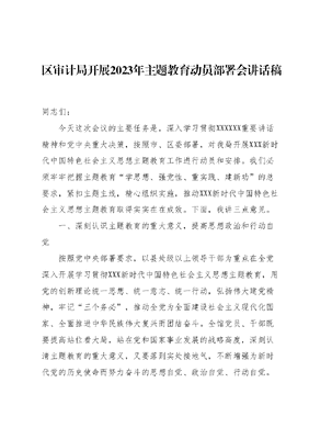 区审计局开展2023年主题教育动员部署会讲话稿同志们:今天这次会议的主要任务是,深入学习贯彻XXXXXX重要讲话精神和党中央重大决策,按照市、区委部署,对我局开展XXX新时代中国特色社会主义思想主题教育工作进行动员和安排。我们必须牢牢把握主题教育学思想、强党性、重实践、建新功的总要求,紧扣主题主线,精心组织实施,推动XXX新时代中国特色社会主义思想主题教育取得实实在在成效。下面,我讲三点意见。一、深刻认识主题教育的重大意义,提高思想政治和行动自觉按照党中央部署要求,以县处级以上领导干部为重点在全党深入开展学习贯彻XXX新时代中国特色社会主义思想主题教育,用党的创新理论统一思想、统一意志、统一行动,弘扬伟大建党精神,牢记三个务必,推动全党为全面建设社会主义现代化国家、全面推进中华民族伟大复兴而团结奋斗。全馆党员、干部既要提高站位看大局,站在党和国家事业发展的战略高度,深刻认清主题教育的重大意义,又要落到实处接地气,不断增强为新时代党的历史使命而努力奋斗的思想自觉、政治自觉、行动自觉。所有党员、干部务必要深刻领会、全面贯彻,充分认识这次主题教育的重大意义,切实增强做好主题教育的政治责任感和现实紧迫感,切实做到三个深刻认识:(一)深刻认识目前我们部分党员、干部在理论学习上同党中央要求还存在不小的差距。有的思想政治学习浮于表面,讲政治口号化,学习上不入脑入心;有的大局意识不强站位不高;有的履行一岗双责打折扣、散慢拖;有的工作本领不足心态不正方法不当。站在新的历史起点上,全体党员、干部必须以高标准、严要求、踏实的作风自觉参加主题教育,以饱满的热情,迎接新挑战,全面、准确诠释XXX新时代中国特色社会主义思想伟大的真理力量和实践力量。(二)深刻认识全面从严治党永远在路上。XXXXXX强调,我们党面临的四大考验是长期的、复杂的,面临的四种危险是尖锐的、严峻的,党内存在思想不纯、政治不纯、组织不纯、作风不纯等突出问题尚未得到根本解决。开展这次主题教育就是要我们广大党员、干部认真贯彻新时代党的建设总要求,以披荆斩棘、碰真逗硬的精神,旗帜鲜明地同一切影响党的先进性弱化党的纯洁性等问题作坚决斗争,推动党的建设全面进步、全面过硬、全面从严。(三)深刻认识本次主题教育的重大意义。XXX新时代中国特色社会主义思想是当代中国马克思主义、二十一世纪马克思主义是中华文化和中国精神的时代精华,是党和人民实践经验和集体智慧的结晶,是中国特色社会主义理论体系的重要组成部分,是全党全国各族人民为实现中华民族伟大复兴而奋斗的行动指南,必须长期坚持并不断发展。开展主题教育,是推动贯彻党的XX大战略部署的有力举措,是深入推进新时代党的建设新的伟大工程的重大部署,对于贯彻新发展理念、构建新发展格局、推动高质量发展,推进中国式现代化,推进党的自我革命、时刻保持解决大党独有难题的清醒和坚定,始终与人民同心,保持党的先进性和纯洁性,使全党更加紧密地团结在以XXX同志为核心的党中央周围,完成党在新时代新征程的使命任务,具有十分重大的意义。二、准确把握主题教育的目标任务,高质量推进主题教育工作为高质量推进主题教育的各项工作,确保取得预期效果,全体党员、干部务必要高度重视、深刻领会、准确把握,重点做到以下三点:(一)要把总要求贯穿主题教育始终。开展主题教育,总要求是学思想、强党性、重实践、建新功,根本任务是坚持学思用贯通、知信行统一,努力在以学铸魂、以学增智、以学正风以学促干方面取得实实在在的成效。一要凝心铸魂筑牢根本。全面、系统、深入学习XXX新时代中国特色社会主义思想,真学真懂真信真用,推动学习往深里走、往实里走、往心里走,提高思想觉悟,切实做到筑牢信仰之基、补足精神之钙、把稳思想之舵。二是锤炼品格强化忠诚。深刻领悟两个确立的决定性意义,不断提高政治判断力、政治领悟力、政治执行力,,真心爱党、时刻忧党、坚定护党。三是实干担当促进发展。突出实践导向,真抓实干、务求实效,以时时放心不下的责任感、积极担当作为的精气神为党和人民履好职、尽好责。四是践行宗旨为民造福。坚持一切为了人民、一切依靠人民,把惠民生、暖民心、顺民意的工作做到群众心坎上,不断增强人民群众的获得感、幸福感、安全感。五是廉洁奉公树立新风。严格落实中央八项规定及其实施细则精神,持续纠治四风,坚决反对特权思想和特权现象,做到公正用权、依法用权、为民用权、廉洁用权。(二)要着力解决6个方面的问题。主题教育坚持目标导向和问题导向相统一,着力解决6个方面的突出问题。1.理论学习方面。主要是学风不纯不正,学习主动性不强,不走心不深入不系统,存在推着学、被动学的现象,用党的创新理论指导实践、解决问题存在差距和不足;2.政治素质方面。主要是政治判断力、政治领悟力、政治执行力不够强,信仰信念淡化,贯彻落实