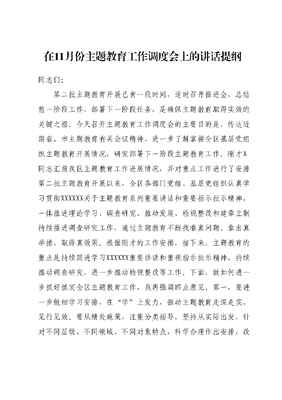 在11月份主题教育工作调度会上的讲话提纲同志们:第二批主题教育开展已有一段时间,适时召开推进会,总结前一阶段工作,部署下一阶段任务,是确保主题教育取得实效的关键之招。今天召开主题教育工作调度会的主要目的是,传达近期省、市主题教育有关会议精神,进一步了解掌握全区基层党组织主题教育开展情况,研究部署下一阶段主题教育工作。刚才X同志汇报我区主题教育工作进展情况,并对重点工作进行了安排第二批主题教育开展以来,全区各部门党组、基层党组织认真学习贯彻XXXXXX关于主题教育系列重要讲话和重要指示批示精神,一体推进理论学习、调查研究、推动发展、检视整改和建章立制持续推进调查研究工作,通过主题教育不断找准真问题、拿出真举措、取得真效果。根据刚才的工作安排,接下来,主题教育的重点是持续跟进学习XXXXXX重要讲话和重视指示批示精神,持续推动调查研究,进一步推动检视整改等工作。下面,就如何进一步抓好抓实全区主题教育工作,我再强调四点意见。第一,要进一步做细学习安排,在学上发力,推动主题教育走深走实、见行见效。要从精处施策,注重分类指导,坚持从实际出发,针对不同层级、不同领域、不同对象特点,科学合理作出安排,改进组织指导方式,确保学习教育更精准、问题整改更有效。要抓好不同类别党员教育,合理区分不同党员群体的特点,把各种类型党员的情况摸清、特征找准,分层分类指导,精准施策,真正实现主题教育全覆盖,增强指导针对性和实效性。要从细处着手力求深入具体,下足绣花功夫,合理划分理论学习、调查研究、推动发展、检视整改不同重点措施的具体内容,找准着力点和切入点,沉下心去,抓细节抓具体抓深入,切实做到有机融合一体推进,不知不扣把规定动作和自选动作落实到位。注重过程纠偏,针对主题教育中暴漏出的问题,既要及时纠正偏向,避免政治大方向上南辕北辙,又要尽快纠正偏差,找准问题根源、彻底整改解决。要从实处推进,力求落实有效。坚持思想上不放松、标准上不下降、力度上不减弱,充分运用第一批主题教育的好经验好做法,慎终如始把各项任务落实到位,切实把学习成果转化为推动高质量发展的强大动力。力戒形式主义,坚决防止理论学习浮光掠影、调查研究走马观花、推动发展拖泥带水、检视整改浅尝辄止,确保主题教育取得实实在在成效。坚持开门抓主题教育,善于倾听群众意见、自觉接受群众监督,从群众期盼的事情做起、最不满意的地方改起,着力解决群众的急难愁盼,以群众笑脸来检验主题教育成效第二,要进一步做深调查研究,在做上发力,推进主题教育走深走实、见行见效。作为我们党的传家宝,调查研究关乎信息和决策、联结党心与民心。调查研究成果几何,同高质量发展成色足不足、动力强不强紧密相连。在全党开展主题教育,深入调查研究,更是回答中国之问、世界之问、人民之问时代之问的有效途径。做深调查研究,要在切口上再精准。坚持问题导向与目标导向相统一,勤修见微知著的眼力,苦练解剖麻雀的功夫。聚焦主责主业调研,多往项目一线去、多到背街小巷看、多与基层群众聊、多朝田间地头跑,在贴地行走中摸清制约高质量发展的难点堵点焦点,列出问题清单,拿出对策性思考建议。在方法上再优化。方法对头,能在有限时间内掌握更多第一手鲜活的资料,发现更多真民意、真问题,反之方法不当事倍而功半。党员干部理当紧盯调查研究事前事中、事后三个环节,用好用活事关全局的战略性调研、破解复杂难题的对策性调研、新时代新情况的前瞻性调研、重大工作项目的跟踪性调研、典型案例的解剖式调研、推动落实的督查式调研等调研方法论。在运用上再发力。调查研究的指向是实践见身影更要见行动,听民情更要有回声。必须把发现问题和解决问题有机结合起来,由表及里、由此及彼,推动解决一批发展所需、改革所急、基层所盼、民心所向的问题。同时,建立调研成果转化运用清单,对经过充分研究、比较成熟的调研意见,要及时转化为推动工作的思路办法和政策举措,进而在实践与认识的逐步深化中助力发展。在调研结果上要体现效的要求,在了解到问题之后,认真谋划解决办法和举措,以维护群众利益和社会经济发展大局需要为导向,制定出科学合理的政策,真正实现出实招、谋实效。第三,要进一步做实整治整改,在检上发力,推进主题教育走深走实、见行见效。敢于直面问题、认真解决问题,是我们党的显著特点和优势,也是抓实抓好学习贯彻XXX新时代中国特色社会主义思想主题教育的题中应有之义。我们必须奔着问题去、对着问题改,边学习、边对照、边检视、边整改,把问题整改贯穿主题教育全过程,让人民群众切实感受到主题教育带来的明显变化、实际成效。这次主题教育把抓好检视整改作为一项重点措施,再次彰显了强烈的问题意识和鲜明的问题导向。要切实提高政治站位,实实在在检视整改突出问题,努力以解决问题的实际成效赢得