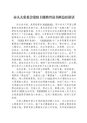 市人大常委会党组主题教育读书班总结讲话这次读书班,是贯彻落实XXXXXX、党中央关于开展主题教育决策部署的具体行动,是发挥领导干部关键少数示范带动作用的重要举措,为市人大常委会及机关高质量开展主题教育打下了坚实基础。期间,大家紧扣学习贯彻XXX新时代中国特色社会主义思想这一主题,认真研读党的XX大报告和党章、《XXX著作选读》、《XXXXXX对广东系列重要讲话和重要指示精神摘编》等学习材料,带头学习、带头研讨,把自己摆进去、把职责摆进去、把工作摆进去,谈思想、谈认识、谈体会、谈举措,用实际行动展现了良好学风和优良作风。市委联络组和市人大常委会党组对开好读书班十分关心,给予了有力的支持和指导。市人大常委会及机关主题教育办精心组织、周密部署,迅速开班动员,科学设置专题日程,积极编印参阅资料,高效完成各项工作,确保了读书班的顺利进行。在这里,我代表市人大常委会及机关班子向大家表示衷心的感谢!总的来看,这次读书班主题鲜明、内容丰富、安排紧凑,是一次理论知识的再充电、理想信念的再补钙、思维视野的再拓宽、发展信心的再提振。大家聚精会神学理论,用心用情悟思想,深化了对XXX新时代中国特色社会主义思想基本观点、科学体系的理解和把握,加深了对这一伟大思想蕴含的世界观和方法论的思考和认识,增进了对党的创新理论的政治认同、思想认同、理论认同、情感认同,坚定了贯彻落实XXX法治思想、XXXXXX关于坚持和完善人民代表大会制度重要思想的信心和决心,达到了预期目的,取得了良好成效。开展主题教育是今年党的建设的重大任务,这次读书班为主题教育开了个好头,接下来还要持续发力,按照主题教育的实施方案,紧跟市委主题教育办的工作安排,在市委联络组的指导下逐步逐项抓好主题教育各项工作。借此机会,我讲四点意见。一、在以学铸魂上下功夫,进一步筑牢信仰之基这次主题教育把学思想摆在总要求的首位。我们要持续加强理论学习,进一步加深对XXX新时代中国特色社会主义思想的理解把握,从思想上正本清源、固本培元,切实筑牢信仰之基、补足精神之钙、把稳思想之舵。一要坚定理想信念。XXXXXX指出,理想信念是立党兴党之基,也是党员干部安身立命之本。我们要从两个结合的高度,紧密结合新时代10年伟大变革,结合高质量发展的生动实践,深刻认识这一重要思想的实践基础、真理伟力,不断增强政治认同、思想认同、理论认同、情感认同,把好世界观、人生观、价值观这个总开关。二要铸牢对党忠诚。坚持党的全面领导、坚定维护党中央权威和集中统一领导,在思想上政治上行动上同以XXX同志为核心的党中央保持高度一致,做到思想上认同核心、感情上信赖核心,始终与党同心同德,始终做到以党的旗帜为旗帜,以党的方向为方向,在忠诚捍卫两个确立、坚决做到两个维护中铸牢新时代人大工作者对党忠诚的政治品格。三要站稳人民立场。人民立场是中国共产党的根本政治立场,更是人大工作的出发点和立足点,要坚持以人民为中心的发展思想,紧密结合人大职能,充分发挥来自人民、扎根人民的特点优势,丰富联系人民群众的内容和形式,虚心听取人民群众意见建议,持续深化我为群众办实事实践活动,推动解决群众急难愁盼问题,做到民有所呼、我有所应。二、在以学增智上下功夫,进一步提升能力本领XXX新时代中国特色社会主义思想博大精深、系统全面,涵盖改革发展稳定各领域,为我们抓好工作提供了根本遵循。我们要学深悟透、准确把握XXX新时代中国特色社会主义思想的世界观、方法论和贯穿其中的立场观点方法,切实把学习成果转化为做好新时代人大工作的能力本领。一要提升政治能力。以学增智,最首要的是提升政治能力,要始终胸怀国之大者,善于从党和人民的立场、党和国家工作大局出发想问题、作决策、办事情,切实做到XXX、党中央关心什么、强调什么,人民群众关心什么、期盼什么,人大工作就要抓住什么、推进什么,真正成为政治上的明白人。二要提升思维能力。以学增智,最关键的是提升思维能力,要把马克思主义世界观、方法论和贯穿其中的立场观点方法转化为自己的科学思想方法,作为推动人大工作、解决实际问题的总钥匙,善于从全局出发想问题、作决策、办事情,善于把握事物本质、把握发展规律、把握工作关键、把握政策尺度,守正创新,依法履职,确保党中央决策和省委、市委工作部署在人大落地见效。三要提升实践能力。以学增智,最需要的是提升实践能力,要全面把握XXX新时代中国特色社会主义思想一系列新理念新思想新战略的实践要求,以强化理论学习指导发展实践,以深化调查研究推动解决难题,以扎实检视整改提升能力水平,推动法治引领、强化监督、践行民主见行见效,把学习成效转化为推动人大工作高质量发展的生动实践。三、在以学正风上下功夫,进一步涵养清风正气XXXXXX强调,人民群众看主题教育是否有成效,最直观的感受是看党