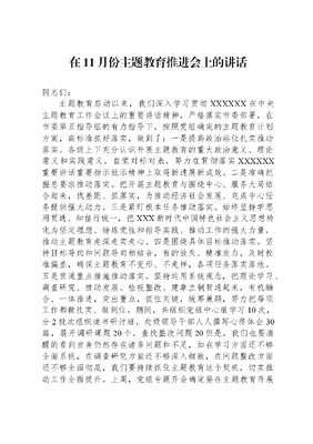 在11月份主题教育推进会上的讲话同志们:主题教育启动以来,我们深入学习贯彻XXXXXX在中央主题教育工作会议上的重要讲话精神,严格落实市委部署,在市委第五指导组的有力指导下,按照党组确定的主题教育计划方案,高标准抓好落实,做到了:一是提高政治站位扎实推动落实。各级上下充分认识开展主题教育的重大政治意义、理论意义和实践意义,自觉对标对表,努力在贯彻落实XXXXXX重要讲话重要指示批示精神上取得新进展新成效。二是准确把握总要求推动落实。把开展主题教育与围绕中心、服务大局结合起来,找差距、抓落实,为推动经济社会发展、完成中心任务提供强大动力。三是紧盯根本任务推动落实。始终坚持学思用贯通、知信行统一,把XXX新时代中国特色社会主义思想转化为坚定理想、锤炼党性和指导实践、推动工作的强大力量,推动主题教育走深走实走心。四是围绕具体目标推动落实。坚持目标导向和问题导向相结合,有的放矢、精准发力,及时校准偏差,确保主题教育不变形、不走样,各项任务落实落地。五是贯通重点措施推动落实。坚持运用系统观念,把理论学习、调查研究、推动发展、检视整改、建章立制贯通起来,有机融合、一体推进,突出重点,抓住关键,统筹兼顾,努力把每项工作都做扎实、做到位。期间,共组织党组中心组学习10次,分2批次组织读书研讨班,处级领导干部人人撰写心得体会30篇,展开调研课题20个,查找整改问题20但是,我们也要清醒的看到自身仍然存在诸多问题和不足,如在学习方面还不够全面系统,在调查研究方面还不够深入细致,在问题整改方面还不够全面彻底,我们要持续抓住主题教育这个契机,切实推动工作全面提升。上周,党组专题开会确定要在主题教育开展满月之际,择时召开专题推进会,目的就是再动员、再部署、再鼓劲,确保思想不松、热情不减、干劲不弱,持续推动主题教育走深走实。下面代表党组,提以下要求:一要进一步深刻领会开展主题教育的重大意义,切实增强思想自觉、政治自觉、行动自觉。做到三个深刻:一是深刻领会开展主题教育是统一全党思想意志行动、始终保持党的强大凝聚力、战斗力的必然要求。二是深刻领会开展主题教育是推动全党积极担当作为、不断开创事业发展新局面的必然要求。三是深刻领会开展主题教育,是深入推进全面从严治党、以党的自我革命引领社会革命的必然要求。四是深刻领会开展主题教育,是加快建设一流城市的必然要求。二要进一步聚焦主题教育目标要求、落实重点举措,高标准高质量开展主题教育。做到四个贯穿始终:一是把总要求贯穿始终。要系统理解、准确把握,把学思想、强党性、重实践、建新功这个总要求落实到主题教育的全过程,落实到各项工作的各环节。二是把目标任务贯穿始终。聚焦根本任务和具体目标开展工作,是保证主题教育取得实效、不走过场的关键。要把目标任务盯紧抓实,并作为衡量各级领导班子作风好坏、领导干部党性强弱的重要内容,作为督查工作开展、检验工作成效的重要标尺,贯穿主题教育始终。三是把解决问题贯穿始终。把解决理论学习、政治素质、能力本领、担当作为、工作作风、廉洁自律6个方面突出问题与理论学习、调查研究、推动发展、检视整改、建章立制衔接起来,把问题整改贯穿主题教育始终。四是把落实重点措施贯穿始终。要按照中央《意见》明确5个方面的规定动作,结合实际在工作方案中进行细化,抓好贯彻落实。着力抓好理论学习,着力抓好调查研究,着力破难题促发展,着力抓好检视整改,着力抓好建章立制。三要进一步提高政治站位,强化组织领导,确保主题教育取得扎实成效。抓实四个方面:一要落实领导责任。局党组成立主题教育领导小组,领导小组下设办公室,具体负责主题教育日常工作。各部门要密切配合、各尽其职,形成齐抓共管合力。各单位主要负责同志要亲自谋划、亲自研究、亲自推动,班子成员要落实一岗双责。党员领导干部要发挥示范带动作用,引领推动主题教育扎实开展。二要加强督促指导。按照上级要求,结合当前实际,总局将再成立3个指导组,采取调研访谈、参加学习研讨等方式,及时发现解决问题,持续传导压力,推动工作落实,确保主题教育工作质量。三要确保工作实效。局党组和各级党委要把开展主题教育与学习贯彻党的XX大精神、推动自身各项工作深度融合,做到两不误、两促进。四要营造良好氛围。要充分发挥各类媒体平台的宣传主渠道作用,及时传达学习XXXXXX有关重要讲话和重要指示批示精神,用XXX新时代中国特色社会主义思想凝心铸魂。广泛宣传主题教育的重大意义、目标任务和基本要求,注重提炼工作亮点,总结工作经验,宣传先进典型,营造浓厚氛围。会后,各参会人员要做好三个方面的工作:一是要迅速传达、统一思想。各级党组织要迅速组织党员干部学习贯彻市委第x指导组x组长的讲话要求和局主题教育推进会的部署,切实把思想和行动统一到党中央决策部署上来,统一到局党组确定的各项任务上来,增强贯彻落实的责任感使命感。二是要
