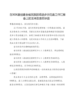 在XXX县创建全省民族团结进步示范县工作汇报会上的主持及表态讲话尊敬的XXX组长,各位领导和专家:从7月20日开始,省社科院评估调研组一行带着省社科院、省民宗委的关心和厚爱,顶着炎炎烈日莅临我县调研指导民族团结进步示范县创建工作,体现了XXX组长等各位领导和专家对我县创建工作的关心和重视,这是对我县工作的大力支持和鞭策。下面我向大家介绍出席今天会议的人员。省社科院评估调研组的领导是:省社科院(省政府发展研究中心)六级研究员、评估调研组组长XXX同志;省社科院(省政府发展研究中心)七级研究员XXX同志;省社科院(省政府发展研究中心)八级研究员XXX同志、八级研究员XXX同志、实习研究员XXX同志。让我们用热烈的掌声对XXX组长一行的到来表示热烈欢迎和衷心感谢!我县参加今天会议的同志有:县委常委、县委统战部部长XXX同志,县人大常委会副主任、县城创办执行副主任XXX同志、副县长XXX同志,以及县直相关单位和相关乡镇(街道)的负责同志。今天的会议共四项议程:一是观看XXX县创建全省民族团结进步示范县专题汇报片;二是汇报全省民族团结进步示范县创建工作情况;三是进行问卷调查和民族团结进步知识测试;四是XXX组长反馈评估调研情况。下面,我们依次进行。首先,进行第一项议程:请工作人员播放专题汇报片。······················接下来,进行第二项议程:请县委常委、县委统战部部长XXX作创建全省民族团结进步示范县工作汇报。······················接下来,进行第三项议程:进行问卷调查和知识测试,测试期间同志们要遵守会场纪律,认真做答。请工作人员发放调查问卷和测试试卷。······················接下来,进行第四项议程:请省社科院(省政府发展研究中心)六级研究员、评估调研组组长XXX反馈评估调研情况并做重要讲话。大家欢迎!会议总结表态讲话同志们,刚才XXX组长的讲话,深入分析了全省民族团结进步示范县创建的重要意义,指出了我县创建工作面临的形势和问题同时为我们下一步创建工作提出了明确的工作要求。讲话既有理论的高度、又有实践的深度,具有很强的针对性、指导性和可操作性,使我们受到了一次难得的党的民族理论、民族政策、民族法律法规的教育,更加明确了以铸牢中华民族共同体意识为主线全面深入持久开展民族团结进步创建工作的重大意义、重要内涵更加坚定了进一步做好示范县创建工作的信心和决心。在这里,我代表县委县政府郑重表态如下:一是坚持目标导向,力求工作高站位。我们将把创建为民作为工作目标,团结带领全县各族干部群众深入学习贯彻XXX新时代中国特色社主义思想,以铸牢中华民族共同体意识为主线统揽全县民族工作,把民族团结进步示范县创建工作摆在更加突出的位置,不折不扣地落实党中央、省委、市委关于加强和改进民族工作的决策部署,确保民族工作始终沿着正确政治方向前进。二是坚持问题导向,力求创建高标准。我们将认真落实评估调研组反馈的意见,进一步增强责任感和紧迫感,一定把创建的过程转化为解决问题的过程,不回避、不遮掩,以更有力的措施更强硬的手段抓好问题整改,有效防范民族工作领域的各种风险隐患,扎实推进XXX民族团结进步创建工作达到验收考核标准,使全县XXX个民族在交往交流交融中增进团结,手拉手、心连心,一起走向未来。三是坚持结果导向,力求发展高质量。我们将既做看得见、摸得着的工作,也做大量润物细无声的事情,确保有形、有感、有效。县委县政府一定科学统筹民族团结进步示范创建工作进一步把铸牢中华民族共同体意识的工作要求,贯彻落实到历史文化宣传教育、公共文化设施、旅游景观陈列等方面,着力抓好打基础、利长远、补短板、强弱项、堵漏洞的事情,打通堵点、解决难点、消除痛点,用实效来说话,以实绩论英雄,真正实现政治效果、经济效果、社会效果相统一,不断推动XXX经济社会高质量发展。最后,让我们再次用热烈的掌声,对XXX组长和评估调研组各位领导的精心指导,表示诚挚的感谢!今天会议就进行到这里。