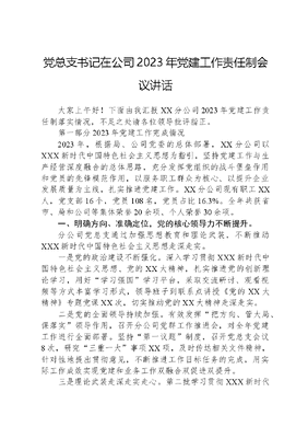 党总支书记在公司2023年党建工作责任制会议讲话大家上午好!下面由我汇报XX分公司2023年党建工作责任制落实情况,不足之处请各位领导批评指正。第一部分2023年党建工作完成情况2023年,根据局、公司党委的总体部署,XX分公司以XXX新时代中国特色社会主义思想为指引,坚持党建工作与生产经营深度融合的总体思路,充分发挥党组织的战斗堡垒作用和党员的先锋模范作用,以服务职工群众为核心、以提升企业发展质量为主线,扎实推进党建工作。XX分公司现有职工XX人,党支部16个,党员108名,党员占比16.3%。全年共获省市、局和公司等集体荣誉20余项、个人荣誉30余项。一、明确方向、准确定位,党的核心领导力不断提升。分公司党总支通过加强思想教育和理论武装,不断推动XXX新时代中国特色社会主义思想走深走实。一是党的政治建设不断强化。深入学习贯彻XXX新时代中国特色社会主义思想、党的XX大精神,扎实推进党的创新理论学习,用好学习强国学习平台,采取交流研讨、观看视频等方式丰富学习形式,领导班子到联系点讲授《党的XX大精神》专题党课XX次,切实推动党的XX大精神走深走实。二是党的全面领导持续加强。有效发挥把方向、管大局、保落实领导作用,召开分公司党群工作推进会,对全年党建工作进行全面部署。坚持第一议题制度,召开党总支会议8次,研究三重一大事项XX项,及时传达相关文件精神,针对性地提出贯彻意见,不断推进工作目标任务的完成,用实际工作成效实现党建和业务工作双融合双促进双提升。三是理论武装走深走实走心。第二批学习贯彻XXX新时代中国特色社会主义思想主题教育开展以来,分公司党总支按照公司党委部署要求,扎实推动主题教育走深做实,不断提升主题教育质效。制定主题教育一案一表一提示,编制《XX分公司党支部主题教育学习计划表》,明确时间节点和责任分工;下发周工作提示,实时通报开展情况。分公司领导班子成员以普通党员身份加入所在支部学习,聚焦企业高质量发展、城市更新、智能建造、廉政教育等主题,交流分享学习情况及体会,营造了良好学习氛围。各支部书记带领大家重点学习党的XX大报告、党章、《XXX新时代中国特色社会主义思想专题摘编》等重要内容,依托三会一课、主题党日等做到基层党组织和党员学习全覆盖,为重实践、建新功奠定理论基础。二、围绕中心、服务大局,党建保障力度不断加强。分公司党总支严格按照公司党委要求,扎实推进党建工作与生产经营深度融合,持续夯实党建基础。一是持续推进三大提升行动。分公司党总支着力推动三大提升行动,以党员三讲三比活动、创建五型五类党支部为抓手和载体,不断提升支部组织力和战斗力。举办分公司党务工作者素质能力提升培训班1期;围绕公司、分公司党建主品牌,打造XX项目党建品牌;到各支部开展支部扩大调研会议,帮助项目解决实际问题;持续推进XX项目保安全型、XX项目强履约型党支部创建,在建项目创建工作全覆盖,以主题党日活动+业务融合,促进支部堡垒作用发挥。全年各党支部累计召开党员大会XX余次、开展主题党日活动XX余次,支部书记讲授党课XX余次。与XX县住建局、XX区纪委、XX市建设档案馆、XX建设公司、XX杭州公司等12家党组织,围绕组织共建、活动联办、廉洁共建、发展共赢开展联建共建活动,签订党建联建协议书,促进党建和业务深度融合。二是深入推进专项行动。分公司党总支始终坚持党建工作和主业工作深度融合、同频共振。扎实推进艰苦奋斗开源节流三年行动,查摆问题XX条,制定整改举措XX项,按时间节点整改完成率为XX%。持续组织职工开展创新创效、金点子征集等活动,牢固树立过紧日子意识。全年总部层面会议费用同比支出降低XX%。项目层面现场经费占比XX%,控制在XX%的管控要求内。推进所有项目钢结构主材自采新模式,在XX项目均已落地。策划效益率XX、成本降低金额XX万。盘扣脚手架采用建筑面积包干模式取代传统租赁形式、减少材料损耗,先后落地XX等项目,成本降低金额XX万,成本降低率XX%。签订负流转正责任状,持续推动责任状负流项目治理工作,定期复盘分析阶段成效,持续以高压态势推动负流转正工作。落实资金和税务策划,新开项目资金策划完成率100%。对潜亏项目进行全面剖析,已完成XX项目潜亏销项。编制发布《XX分公司均质化安全管理提升实施方案》,定期对项目安全策划落地情况进行过程督查和过程纠偏,确保项目安全管理水平均质化提高,进一步压实安全责任。三是持之以恒加强作风建设。分公司党总支抓实作风建设巩固提升年专项行动,召开作风建设整改推进会,宣贯文件精神,对照公司党委巡察组总部作风建设问题清单XX项,各部门进行认领,逐条分解梳理,制定整改措施XX项,确保整改实效。针对公司作风建设巡察中期评估问卷调查所提出的问题,在领导班