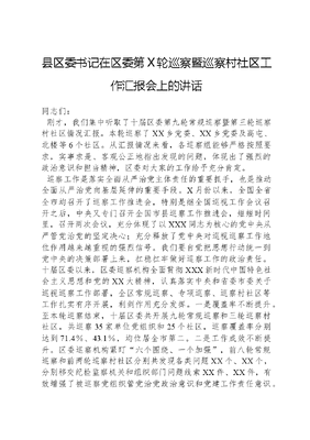 县区委书记在区委第X轮巡察暨巡察村社区工作汇报会上的讲话同志们:刚才,我们集中听取了十届区委第九轮常规巡察暨第三轮巡察村社区情况汇报。本轮巡察了XX乡党委、XX乡党委及高屯、北楼等6个社区。从汇报情况来看,各巡察组能够严格按照要求,实事求是、客观公正地指出发现的问题,体现出了强烈的政治意识和担当精神,区委对大家的工作给予充分肯定。巡察工作是落实全面从严治党主体责任的重要抓手,也是推动全面从严治党向基层延伸的重要手段。X月份以来,全国全省全市均召开了巡察工作推进会,特别是继全国巡视工作会议召开之后,中央又专门召开全国市县巡察工作推进会,短短时间里,召开两次会议,充分体现了以XXX同志为核心的党中央从严管党治党的坚定决心;充分释放了党中央对巡视巡察工作地位作用越来越重视的强烈信号。我们要自觉把思想行动统一到党中央的决策部署上来,扛稳扛牢做好巡察工作的政治责任。十届区委以来,区委巡察机构全面贯彻XXX新时代中国特色社会主义思想和党的XX大精神,认真落实中央和省委市委关于巡视巡察工作部署,全区常规巡察、专项巡察、巡察村社区等工作扎实有序开展,利剑作用充分发挥。一是覆盖率不断提升。至本轮巡察结束,十届区委共开展九轮常规巡察和三轮巡察村社区,共巡察35家单位党组织和25个社区,巡察覆盖率分别达到71.4%、43.1%,均位居全市第二。二是工作成效不断提升。区委巡察机构紧盯六个围绕、一个加强,前八轮常规巡察和前两轮巡察村社区分别共发现各类问题XX个、XX个,分别移交纪检监察机关和组织部门问题线索XX件、XX件,有效增强了被巡察党组织管党治党政治意识和党建工作责任意识。三是围绕中心不断提升。区委巡察机构先后组织开展了涉农部门、脱贫攻坚、人防系统等专项巡察,发现了资金使用、项目建设缺乏监管、部分项目重建设轻实效等突出问题,有力助推了区委中心工作落实。希望大家继续再接再厉,不断推动巡察工作高质量。下面,就做好下步巡察工作,我讲三点意见。一、突出两个维护,彰显巡察政治属性两个维护是新时代巡视巡察工作的纲和魂。要通过开展政治巡察,推动全区各级党组织和党员干部履行政治责任,不断增强四个意识、坚定四个自信,坚决做到两个维护。一要强化学习,促进两个维护的落实。践行两个维护不是空泛概念,需要具体体现在被巡察党组织对XXX新时代中国特色社会主义思想和党中央重大决策部署的真重视、真学习、真落实。通过这次巡察发现,一些部门还是存在差距。比如乡党委对于XXX视察调研指导XX工作时提出的乡镇工作三结合、乡村振兴战略部署等重要内容理解不深不透。比如一个乡的7名班子成员只有1名准确写出两个维护、四个意识正确内容。这说明我们一些党组织在理论学习方面还有较大差距,没有真正做到入脑入心。要通过巡察,督促被巡察单位党组织自觉提高政治站位,推动学习贯彻XXX新时代中国特色社会主义思想往深里走、往实里走、往心里走,打牢两个维护的思想基础。二要真抓实干,促进两个维护的落实。抓好党建是最大政绩。没有党的建设高质量,就没有经济发展高质量,落实两个维护更无从谈起。本轮巡察发现,一些党组织仍然存在党的建设弱化虚化边缘化,党建工作意识不强、氛围不浓、质量不高。比如,巡察发现,有的单位党员根本不知道自己所在党支部名称、支部书记、支部委员名字,党委两年没有班子民主生活会材料,一些社区支部材料照抄照搬。党委对下属党支部缺乏管理,一些党支部长期不开展活动,村社区党组织对党员监督管理不够,个别党员常年不参加组织活动、不过组织生活,甚至连续三年不缴纳党费,个别党员不信马列信鬼神,为庙宇捐款。这些问题可以说明,一些党组织党建责任意识淡化,没有把党建工作放在应有重要位置,形式化问题依然突出。要通过巡察,督促被巡察单位党组织扛牢政治责任,认真践行以党的建设高质量推动经济发展高质量要求,进而把最大政绩抓到位。三要从严管理,促进两个维护的落实。巡察就是要通过监督检查被巡察单位全面从严治党两个责任落实情况,督促党组织扛牢从严管党治党的政治责任。从本轮巡察情况看,两个乡党委在管党治党全面从严方面还存在差距。比如,乡党委常年不召开党风廉政建设专题研究会议,纪委监督宽松软,纪检监察干部不聚焦主业,三转不到位,巡视巡察整改落实不到位,存在书面整改、材料整改。这说明一些党员干部对全面从严治党的严峻形势认识不足,对党规党纪缺乏敬畏之心。要通过巡察,督促被巡察党组织全面整改、彻底整改、真正整改,切实从思想上工作上把管党治党严起来、实起来。二、突出问题导向,彰显巡察利剑作用巡视巡察方针第一条就是发现问题,这是巡察工作的出发点,也是巡察高质量的前提。巡察机构要围绕区委工作布局,聚焦重点工作、重点问题、重点领域和重点单位,发现问题,形成震慑。一要聚焦重大决策部