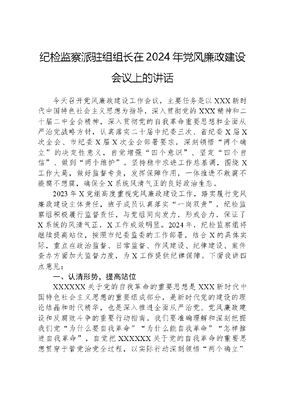 纪检监察派驻组组长在2024年党风廉政建设会议上的讲话今天召开党风廉政建设工作会议,主要任务是以XXX新时代中国特色社会主义思想为指导,深入贯彻党的XXX精神和二十届二中全会精神,深入贯彻党的自我革命重要思想和全面从严治党战略方针,认真落实二十届中纪委三次、省纪委X届X次全会、市纪委X届X次全会部署要求,深刻领悟两个确立的决定性意义,自觉增强四个意识、坚定四个自信、做到两个维护。坚持稳中求进工作总基调,围绕X工作大局,做好监督专责,发挥保障作用,一体推进不敢腐不能腐不想腐,确保全X系统风清气正的良好政治生态。2023年X党组高度重视党风廉政建设工作,踏实履行党风廉政建设主体责任,班子成员认真落实一岗双责,纪检监察组积极履行监督责任,与党组同向发力,形成合力,保证了X系统的风清气正,X工作成效明显。2024年,纪检监察组将继续提高站位,按照市纪委监委的工作部署,结合X的具体实际,重点在政治监督、日常监督、作风建设、纪律建设、案件查办方面加大监督力度,为X工作提供纪律保障。下面我讲四点意见:一、认清形势,提高站位XXXXXX关于党的自我革命的重要思想是XXX新时代中国特色社会主义思想的重要组成部分,是新时代党的建设的理论结晶和时代精华,也是深入推进全面从严治党、党风廉政建设和反腐败斗争的重要行动指南。我们要准确理解和深刻把握我们党为什么要自我革命为什么能自我革命怎样推进自我革命,自觉把XXXXXX关于党的自我革命的重要思想贯穿于管党治党全过程,以实际行动深刻领悟两个确立的决定性意义,做到两个维护。要充分认识这一重要思想的重大意义,深刻领悟这一重要思想的精髓要义,坚持不懈在深化内化转化上下功夫,怀着深厚感情、怀着坚定信仰、怀着强烈使命深学细悟,汲取其中蕴含的坚定理想信念、加强党性锻炼、提升精神境界和道德水平等思想营养,自觉从中找理念、找思路、找方法、找举措,将学习成果转化为攻坚克难、干事创业的强大动力。第一,深刻理解坚强的领导核心是党的自我革命不断从胜利走向胜利的根本保障。党的创新理论是党的自我革命的制胜法宝,XXXXXX就推进党的自我革命提出一系列新理念新思想新战略,为反腐败斗争取得压倒性胜利并全面巩固提供了强大思想武器,为坚决打赢反腐败斗争攻坚战持久战提供了科学行动指南。党风廉政建设工作必须坚持以XXX新时代中国特色社会主义思想为指导,以XXXXXX提出的一系列关于党的自我革命的新理念新思想新战略统领各项工作,回答和解决新时代新征程上党风廉政建设和反腐败斗争面临的重大问题。深刻领悟两个确立的决定性意义,增强四个意识、坚定四个自信、做到两个维护,使之转化为深入推进新时代新征程党风廉政建设和反腐败斗争工作高质量发展的强大奋进力量,转化为坚定不移正风肃纪反腐的具体行动,转化为坚定维护党的先进纯洁、永葆党的生机活力的实际成效,不断开创自我革命的新境界。第二,深刻把握XXXXXX关于党的自我革命的重要思想的重大意义。中国共产党作为长期执政的马克思主义政党,同时也是世界最大的执政党,必须回答好、解决好的根本性问题就是如何永葆先进性和纯洁性、永葆青春活力,如何永远得到人民拥护和支持,如何实现长期执政。XXXXXX关于党的自我革命的重要思想,深刻阐述了党的自我革命的重要思想的丰富内涵,明确回答了我们党为什么要自我革命、为什么能自我革命、怎样推进自我革命等重大问题,系统提出深入推进党的自我革命实践需要把握好的九个问题。这些重要论断是围绕建设长期执政的马克思主义政党这一重大时代课题所提出的,着眼于破解大党独有难题,源于实践更引领实践,彰显了新时代中国共产党人推进党的建设新的伟大工程的历史主动,标志着我们党对马克思主义执政党建设规律的认识达到了新高度。第三,深入学习贯彻落实XXXXXX关于党的自我革命的重要思想。XXXXXX明确强调,不断深化对党的自我革命的规律性认识,把党的自我革命的思路举措搞得更加严密,把每条战线、每个环节的自我革命抓具体、抓深入。这既是推动党的自我革命的重要原则,也是始终坚持党的自我革命的目标要求。深入学习贯彻落实XXXXXX关于党的自我革命的重要思想,是新时代新征程纵深推进全面从严治党、党的自我革命的必然要求,是坚决打赢反腐败斗争攻坚战持久战的根本保障。学习贯彻落实这一重要思想,不仅要在理论层面上悟透其思想内涵,更要在实践中把握遵循。二、认清责任,落实到位开展党风廉政建设和反腐败工作,党组主体责任和派驻机构监督责任有机统一,密不可分。切实加强沟通协调、密切配合,同向发力、同频共振,共同推动党风廉政建设和反腐败工作高质量发展。一是坚决扛起主体责任。X局党组要持续在思想认识上下功夫,坚决担起党风廉政建设和反腐败工作主体责任,认真落实一岗双责,真正扛起责任、履行责任、承