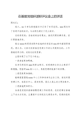 在基层党组织述职评议会上的讲话同志们:刚才,xx个单位的党组织书记作了专项述职,xxx同志作了客观中肯的点评,与会同志进行了民主测评。总的感觉是:总结成绩各有亮点,查找问题实事求是,谈打算措施具体。综合xxxx的现场述职和其他单位党组织xxx的书面述职情况,我认为,大家对抓好基层党建工作的认识是到位的,工作措施是得力的,成效也比较显著。主要体现了以下几个特点:一是责任更加明确。各单位党组织xxx的担当意识、抓党建的主责主业意识不断增强,党组织xxx身入心入、真抓党建的氛围不断浓厚。二是思路更加清晰。能够紧紧围绕xxxx中心工作和本单位业务工作,谋划开展党建工作,在服务中心、促进发展、服从大局上发力更加集中。三是措施更加有力。各基层党组织能够按照党建工作的要求,在抓经常打基础上下功夫求实效,注重提升支部规范化建设水平,党建的组织功能作用发挥更加明显。总的来说,我们大部分单位对党的建设工作跟之前相比,一年比一年更重视,一年比一年更有实效,主流是值得肯定,成绩是值得肯定的。下面,借今天这个机会,我就局属各基层党组织建设工作讲三个方面意见,与大家共勉。一、充分肯定成绩,树立抓好基层组织建设工作的信心和决心xxx年度,xx各基层党组织坚持以XXX新时代中国特色社会主义思想为指导,不断增强四个意识,坚定四个自信,做到两个维护,认真落实xxxx各项决策部署,深入实施xxx,以党的建设高质量推动教育发展高质量,紧紧围绕xxxx中心工作、发展大局,统筹推进党的建设,工作导向更加鲜明,基层党的建设工作越来越实,党内政治生态展现新气象。主要表现在以下几个方面:一是主责主业意识持续增强。在全面从严治党的大背景下,大家对党的建设工作的任务目标,有了更深层次的理解和认识。大多数xxx能够自觉强化管党治党意识和履行党建工作第一责任人职责的政治自觉,旗帜鲜明地抓党建,坚持抓主业担主责、唱主角,对xxxx安排的的每项重点工作都能高度重视主动落实,确保了党建工作各项目标任务圆满完成,把全面从严治党向纵深推进,带动xxxx精神面貌和工作状态有了很大转变。二是基层组织建设更加巩固。各基层党组织将xxxx政治建设摆在首位,抓在经常,特别是有序开展了xxx志愿服务、xxxx系列活动,学习教育已成为组织管理和自我管理的有效载体。各基层党支部组织生活会能够按照要求,紧扣主题,校标对表,严肃认真地组织实施。三会一课、主题党日活动、党费收缴、党务公开、廉政教育等制度落实已成为常态;三是党内政治生态更加清朗。以推进全面从严治党向纵深发展为契机,持续深化党风廉政建设和反腐败斗争。各基层党组织认真落实党风廉政建设两个责任和一岗双责,严格党内政治生活,加强干部监督管理,深入开展警示教育,从严落实中央八项规定和实施细则精神,弛而不息纠正四风,xxxx精神面貌焕然一新。这些成绩的取得,是xxx各基层党组织、xxxx共同努力的结果。在此,我谨代表xxxxx向在座的所有同志,并通过你们向所有重视、关心、支持、参与党的建设的领导和同志们表示衷心的感谢!二、高度警醒问题,找准基层组织建设工作的薄弱环节从大家述职、平时调研、党建工作专项考核以及xxx同志的点评情况看,我们自身和工作中存在的一些不足和问题,主要表现在x个方面:(一)在理论武装上,学习不够深入。各基层党组织在推动XXX新时代中国特色社会主义思想还缺乏有效的抓手和载体,在学懂、弄通、做实上下的功夫还不深,党的创新理论成果还没有真正内化于心、外化于行,还没有真正见诸行动、取得实效。(二)在党建创新上,特色不够明显。党建工作基本是按照上级部署去落实,缺乏自选动作,特色不够明显,载体不够丰富。党务培训、党员教育、党建与xxxx融合方面缺乏创新载体;xxx系统的党建故事、党建做法、党建精神、党建特色没有很好挖掘和凝练。(三)在党建质量上,还需进一步提升。现在各xxx党建工作都在认真抓,但距离高质量的党建还有一定差距,党建与教育教学融合还需加强,离退休老党员的党建工作需探索有效形式。反思存在的问题,有客观因素,但更主要的是主观原因,主要体现在三个欠缺:一是思想认识上还有欠缺。面对当前新形势、新任务,少数基层党组织负责同志对加强基层党建工作重要性认识还不够,没有真正把抓好基层党建工作作为最大政绩,没有把基层组织建设工作作为硬任务、硬指标抓落实,实际工作中还或多或少存在重业务轻党建的现象。二是工作创新上还有欠缺。部分xxxx抓基层党建工作思路和方式方法缺乏创新,没能做到统筹兼顾,没有正确处理好抓基层党建工作与抓xxxx工作的关系,没有把基层党建工作有效融入到推动xxx事业发展之中,导致实际工作中单抓单干,没有形成工作合力。三是工作深入上还有欠缺。一些基层党组织负责人,对基层组织建设中存在的问题调研不深入,督导改进