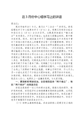 在3月份中心组学习上的讲话同志们:现在开始开会!今天,我们以三会合一的形式,将党组理论学习中心组集体学习(扩大)会、党建工作领导小组会和局长办公(扩大)会合并召开,这既是贯彻落实精文减会有关要求,少开会开短会;也是给大家腾出时间,集中精力抓发展。刚才,我们集中学习了XXXXXX在中央党校中青年干部培训班开班式上的重要讲话等一系列重要精神,研究了党风廉政建设方面有关工作,局各位领导也围绕当前工作进行了汇报安排,希望大家认真学习领会,一并抓好落实。到市交通运输局工作以来,我深切的感受到交通地位的重要性,市委、市政府主要领导在全市大会小会上多次提及交通,对交通事业发展提出了殷切要求,也对我本人提出了谆谆教诲。为尽快进入角色、熟悉情况,近期我先后到几个局直单位开展调研,对各单位的工作有了基本了解;连续跑了几个县市区,对全市重点交通项目实现个个走到。在调研的过程中,一方面我感受到了全局上下浓厚的干事创业氛围,对事业尽职尽责、尽心尽力;另一方面也发现了不少突出问题和短板,亟需尽快补齐短板、加速拼超。借此机会,我结合这段时间的感受感悟讲几点意见,既是交心谈心,也算作上一堂廉政党课,与大家共勉。一、要旗帜鲜明讲政治,全面增强坚持两个确立、做到两个维护的高度自觉讲政治是做好一切工作的根本前提,是强化党的领导、维护党的权威、实现经济社会持续健康发展的政治保障,必须把讲政治贯穿于交通运输事业发展的全过程各环节,体现在毫不动摇的坚持党的领导中,体现在扎实推进党的建设中,体现于党员干部履职尽责的具体言行中。(一)信仰上要绝对忠诚。讲政治的核心是要坚定正确的政治方向和政治立场,系统广大党员干部要始终保持对党绝对忠诚的政治品格,真正把两个维护作为最高政治原则和根本政治规矩,把两个确立内化于心、外化于行,用实际行动锻造忠诚品格。要坚持读原著、学原文、悟原理,用XXX新时代中国特色社会主义思想凝心聚魂,提高驾驭复杂局面、处理复杂问题的本领,努力做到学思用贯通、知信行统一。要牢记国之大者,时刻把握XXXXXX和党中央在关心什么、强调什么,国家需要我们做什么、我们能为国家做什么,自觉把两个维护体现在贯彻党中央决策部署的行动上,体现在履职尽责、做好本职工作的实效上,体现在日常言行上,既为一域争光、又为全局添彩。(二)行动上要团结担当。团结与否是衡量一个领导班子整体素质的重要标志,是领导班子建设的命根子。懂团结是真智慧,想团结是真境界,会团结是真本领,护团结是真觉悟。讲团结,就要一切从有利于工作的角度出发,相互间增进理解、相互包容。在工作生活中,相互支持、彼此帮助、通力合作,营造充满活力、同频共振的良好局面。要有海纳百川的胸怀格局,要客观公正公平对待和包容同志,不要斤斤计较。团结最能看出一个人的人品胸怀,团结的目的不是当好好先生,君子和而不同,不敢斗争、不能批评,一团和气的团结是伪团结,是有损我们事业的。讲担当,就是要面对大是大非敢于亮剑、面对矛盾敢于迎难而上、面对危机敢于挺身而出、面对失误敢于承担责任、面对歪风邪气敢于坚决斗争。勇于担当不是让同志们去犯错误,而是在政策法律法规允许的范围内寻求解决问题的办法;担当不是要求同志们蛮干,而是艺高人大胆,充满智慧性,把要事难事,巧干成功。XXXXXX说:当干部就要有担当,有多大担当才能干多大事业,尽多大责任才会有多大成就。作为市直交通运输系统的关键少数,局领导班子和各单位一把手要坚持抓本级带下级,形成一级做给一级看、一级带着一级干的良好氛围。要坚持真抓实干、埋头苦干,面对改革发展稳定的艰巨任务,敢于挑最重的担子、啃最硬的骨头,不为困难找借口、多为成功想办法。(三)操守上要廉洁自律。一个人廉洁自律不过关,做人就没有骨气,做事就不硬气,这是千古不变的道理。自律是一种定力,心有定力,能抵御诱惑;身有定力,能笃定守志;行有定力,能心静身安。一个人要自律,最重要的是要做到慎初、慎微、慎独,这是洁身自好的紧箍咒,是检验一个人的修养,考验一个的定力和意志力的试金石。所以,大家一定要坚持以更高的思想道德境界、更严的纪律标准要求自己,带头落实中央八项规定精神,严守党的纪律规矩,抵得住诱惑。要时刻把法律的戒尺、纪律的戒尺、制度的戒尺、规矩的戒尺、道德的戒尺牢记于心,做到心有所戒、行有所止,永葆清正廉洁的政治本色。二、要持之以恒转作风,切实营造追求高线不碰红线守住底线的清朗风气作风保证是落实的前提,有什么样的作风,就有什么样的工作成效。面对新形势新任务,如何让市委市政府放心,向全市人民交上一份满意的交通答卷?需要我们以铁的作风来回答,以永不懈怠的姿态来奋斗,来不得半点假、空、怂、懒。(一)扛牢全面从严治党主体责任。首先,要把党的领导落到实处。要抓实基层党支部建设,以提升组织力为重