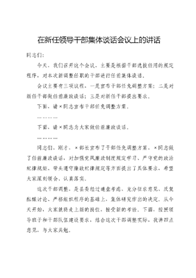 在新任领导干部集体谈话会议上的讲话同志们:今天,我们召开这个会议,主要是根据干部选拔任用的规定程序,对本次新调整任职的干部进行任前集体谈话。会议主要有三项议程,一是宣布干部任免调整方案;二是对新任干部做任前廉政谈话;三是对新任干部提出要求。下面,请×同志宣布干部任免调整方案。…………下面,请×同志为大家做任前廉政谈话。…………同志们,刚才,×部长宣布了干部任免调整方案,×同志做了任前廉政谈话,对加强党风廉政制度规定学习、严守党的政治纪律规矩、带头遵守廉政纪律规定等方面提出了具体要求,希望大家深刻领会、认真落实。这次干部调整,是县委经过通盘考虑、充分征求意见、反复酝酿讨论、严格组织程序的基础上,集体研究作出的决定。从今天开始,大家就将走上新的岗位,接受新的考验。下面,按照领导班子和干部队伍建设要求,结合这次干部调整实际,我讲四点意见,与大家共勉。第一,要正确认识,顾全大局。这次干部调整动议,重点在街道社区。为了腾出岗位,在街道安排曾经具有公务员身份、且在今年年底前达到职级晋升条件的25名社区干部,对街道社区领导班子进行了大幅调整,把部分担任街道主要领导职务的同志调整到了社区,个别同志可能在思想深处有疙瘩,在内心深处有想法。在这里我想谈四点希望:一要自觉服从工作大局。为了从根本上解决街道社区干部的公务员身份和职级待遇问题,县委经过认真调查摸底,反复向上级组织、人社、编制问题请示汇报,争取政策支持,最终达成了上面的解决方案,非常不容易。但是只要路子一通,后面的问题都将迎刃而解。希望大家自觉服从大局正确理解县委意图,正确对待岗位调整,服从县委决策部署,始终在思想上、行动上与县委、区政府保持高度一致。二要理顺班子运行机制。这次重新恢复街道设置,配备街道领导班子,主要目的就是恢复街道行政机构,核定行政编制,解决同志们的身份和职级问题。在这里,我要特别强调一下,这次调整之后,各街道和中心社区原来的管理体制、运行机制、领导排名和经费保障等制度全部不变,继续保持街道社区合署办公、合二为一,绝不能因为配备街道班子而出现街道社区两张皮问题。三要抓好班子带好队伍。这次街道社区班子调整中,除调整配备了14个街道社区主要领导外,其他的大多都是班子副职。作为班子成员特别是班子主要领导,要切实负起抓班子、带队伍的工作职责,不断完善街道社区工作制度,加强党员干部职工教育管理,下功夫抓好领导班子建设,努力把班子建强、队伍带好。四是要注重增进班子团结。要坚持民主集中制原则,严格落实三重一大制度,遇事多沟通勤交流,集思广益,择善而从,集体讨论决定。要处理好正职与副职的关系,正职不能霸气,副职不能傲气;正职要放手,副职要放胆;正职要放心,副职要尽心,大事讲原则小事讲风格,主动维护好班子团结。第二,要忠实履职,不负众望。这次调整的干部主要有两部分,一部分是纪委领导班子及内设机构负责人,另外一部分是街道社区领导班子。对于调整配备的纪检干部,一定要主动适应全面从严管党治党的新形势,聚焦县委中心任务,牢记纪委工作职责,不断增强工作的责任感和使命感,在真、实、严、诚四个字上狠下功夫。一是要真。即讲政治、讲正气,坚持原则敢于动真碰硬,敢于同不良风气作斗争。二是要实。即坚定信念,真抓实干,立足转职能、转方式、转作风,突出纪检监察机关主责主业,督促落实好两个主体责任。三是要严。即严格执行办案纪律、工作纪律和保密纪律,铁面无私、严明执纪。四是要诚。即要忠诚事业,淡泊名利得失,坚决维护党的纪律的严肃性,做党的忠诚卫士。对于新任职的街道社区干部来讲在履行工作职责上要一定要做到三个一。即:一碗水端平,公正处事,在涉及群众切身利益的问题上,一定要心正,以心正求公正,绝不能因照顾亲朋好友或认为权小事小、影响小,随意拍板,任意定夺,从而失去公正,失去群众的信任。一门心担责敢于管事,当前街道社区工作面临的新情况、新问题层出不穷,承担的工作职责纷繁复杂,这就要求大家要敢于担当,遇到艰巨任务时,挺身而出、主动承担,千方百计抓好落实;碰到难题时知难而进、迎难而上,想方设法予以破解;出现问题时,主动面对、负起责任,积极稳妥处理解决。绝不能推诿扯皮、敷衍塞责遇到矛盾绕道走、看到困难往后躲。一股劲服务,踏实干事,老百姓是最讲实在的,大家要获得群众的认可,就必须真正为群众办事、为百姓操劳。希望大家一定要以提供优质服务、兴办公益事业、改善人居环境为突破口,立志干实事,不搞花架子,积极为群众排扰解难,尽最大努力办实事,树立街道社区干部的良好形象。第三,要勤于学习,提升能力。学习可以立德、可以增知、可以致用,是领导干部增长才干、提升能力素质的重要途径。大家走上新的岗位,履行新的职务,尤其是新提拔的干部,必须要不断加强学习、增强本领、提升能力。重点抓好三学。一要学政策理论。要认真学习党