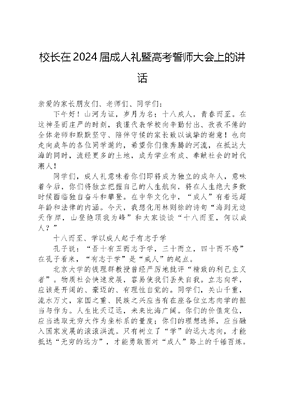 校长在2024届成人礼暨高考誓师大会上的讲话亲爱的家长朋友们、老师们、同学们:下午好!山河为证,岁月为名;十八成人,青春而至。在这神圣而庄严的时刻,我谨代表学校向辛勤付出、孜孜不倦的全体老师和默默坚守、陪伴守候的家长致以诚挚的谢意!也向走向成年的各位同学邀约,希望你们像奔腾的河流,在抵达大海的同时,流经更多的土地,成为学业有成、奉献社会的时代潮人!同学们,成人礼意味着你们即将成为独立的成年人,意味着今后,你们将独立把握自己的人生航向,将在人生绝大多数时候面临独自奋斗和攀登。在中华文化中,成人有着远超年龄和法律的内涵。今天,我想化用林则徐的诗句海到无边天作岸,山登绝顶我为峰和大家谈谈十八而至,何以成人?十八而至、学以成人起于有志于学孔子说:吾十有五而志于学,三十而立,四十而不惑在孔子看来,有志于学是成人的起点。北京大学的钱理群教授曾经严厉地批评精致的利己主义者。物质社会快速发展,容易使我们丢失自我。立志向学,应该是开阔的、豪迈的、有理性自觉的。同学们,关山千重,流水万丈,家国之重、民族之兴应当有在座各位立志向学的担当与作为。人生比天辽远,未来比海广阔。你们的价值定位,应当选取无穷大作为坐标系的量度;你们的理想选择,应当融入国家发展的滚滚洪流。只有树立了学的远大志向,才能抵达无穷的远方,才能勇敢面对成人路上的千锤百炼。十八而至、学以成人重在行胜于言同学们,十八岁成人的标志是什么?十八合起来是一个木字,木可参天,能挡风雨,可做栋梁,它意味着责任与担当。18岁的毛泽东毅然走进湖南省立第一师范学校,探索救国救民的真理;不满18岁的XXX来到陕北农村插队,一头扎进最基层;华为招聘的四名天才少年,最小的不到20岁,已经担负起研究中国芯的重任。18岁之前,你们是祖国的花朵,18岁之后,你们应该是顶天立地的大树,不能再简单地问父母能为你做什么,而要扪心自问:你能为父母、为他人、为社会、为国家做些什么?翠园办学六十年来,无数学子浸润翠园精神,从翠园去到灿烂的未来。不管是凭借自己毅力考上北大的郑杰雄学长,抑或是依靠艰苦训练成为体坛新星的段刘愚学长,在他们拿到梦想的入场券前,一定经过了艰难的自我沉淀。他们不抱怨,不言弃,不问收获,只问耕耘。同学们,行胜于言,只有经得起人生厚重的努力过程,才能走向浩瀚的远方,才能学以成人!十八而至、学以成人成于意志坚定一条河流曲折向前,不只是为了抵达大海,也是为了流经更多的土地。深一模的作文题是意蕴丰富的表达。寒窗苦读十二载,心之所向就是为了抵达未来的汪洋大海。而流经更多土地的过程是修炼的过程,我们每个人都需要这样的过程。大鹏鸟扶摇直上九万里,需要水击三千里的助飞,每一次到达都包含无边艰辛。伟大如牛顿,他在计算引力场中光线的弯曲时也会出错;伟大如爱因斯坦,他的静态宇宙说也被宇宙膨胀说取而代之。学习也是如此,我们需要练就的心态是:不避挫折,注重过程!深一模刚刚结束,我们可以有的放矢地进行总结,然后昂扬出发,一鼓作气,坚持不懈。十八岁是青春岁月崭新的开端,高考是一场特殊的成人礼,备考中你的自律、严谨、耐挫,都将为你的人生赋能、添彩。文可居文库——海量学习资料,手机电脑均可下载www.wenkeju.com同学们,成人不仅仅是一场仪式,你们也并非在这一刻就长大成人,但请你们记住这一庄严的时刻!在美丽的翠园,趁阳光正好、青春正盛、志气正高,去奋斗,去努力!无论人生春风得意,还是前途荆棘丛生,坚守为学之志,践行行胜于言,意志坚定,以学成人!相信你们,六月扬眉,定捷报频传!祝愿你们,后浪滔天,成江海之势!文可居文库——海量学习资料,手机电脑均可下载www.wenkeju.com