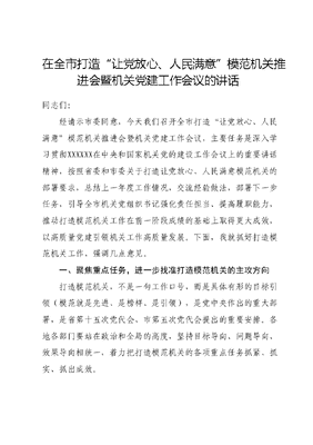 在全市打造让党放心、人民满意模范机关推进会暨机关党建工作会议的讲话同志们:经请示市委同意,今天我们召开全市打造让党放心、人民满意模范机关推进会暨机关党建工作会议,主要任务是深入学习贯彻XXXXXX在中央和国家机关党的建设工作会议上的重要讲话精神,按照省委和市委关于打造让党放心、人民满意模范机关的部署要求,总结上一年度工作情况,交流经验做法,部署下一步任务,引导全市机关党组织书记强化责任担当、提高履职能力,推动打造模范机关工作在前一阶段成绩的基础上取得更大成效,以高质量党建引领机关工作高质量发展。下面,我就抓好打造模范机关工作,强调几点意见。一、聚焦重点任务,进一步找准打造模范机关的主攻方向打造模范机关,不是一句工作口号,而是具体有形的目标引领(模范就是先进、是榜样、是引领),是党中央作出的重大部署,是省第十五次党代会、市第五次党代会提出的重要安排。各地各部门要站在政治和全局的高度,坚持目标导向、问题导向、效果导向相统一,着力把打造模范机关的各项重点任务抓紧、抓实、抓出成效。一要在政治建设上再聚焦。XXXXXX对中央和国家机关提出加强政治建设、坚持守正创新、深入贯彻新时代党的组织路线等方面的重要要求,是我们打造模范机关的根本遵循。各地各部门要深入学习领会,认真对标对表。要牢牢把握践行两个维护这一根本要求。带头做到两个维护,是加强党的政治建设的首要任务,也是打造模范机关的根本要求。要深入开展政治机关意识教育,教育引导机关党员干部不断提高政治判断力、政治领悟力、政治执行力,把坚决贯彻落实XXXXXX重要讲话重要指示批示精神和党中央决策部署,作为制定政策、出台文件、开展工作的根本前提。具体到工作中,就是要把好文件、政策、会议、舆论等重要关口,把坚定拥护两个确立、坚决做到两个维护融入机关各项工作的全过程各方面。要牢牢把握XXX新时代中国特色社会主义思想这一主线。机关党建工作说到底是做人的工作,要发挥聚人心、稳人心、暖人心的作用,所以必须从机关党员干部的思想抓起,引领党员干部心往一处想、劲往一处使。最根本的就是要持续学深悟透XXX新时代中国特色社会主义思想,有计划分层次抓好理论学习,引导机关党员干部带着问题学,推动学习成果切实转化为指导实践、推动工作的强大思想武器。要牢牢把握严肃党内政治生活这一重要抓手。从平时了解掌握的情况看,部分单位党组织党内政治生活不严谨不严肃的问题依然比较突出文可居文库——海量学习资料,手机电脑均可下载www.wenkeju.com在市委巡察的市直单位党委(党组)中,有X个单位存在民主生活会质量不高的问题,批评与自我批评普遍辣味不足,甚至流于形式;有X个单位存在三会一课制度执行不到位的问题,有的甚至X以来仅上党课4次。之所以出现这些问题,根源还是部分党委(党组)书记对党建工作不重视,没有真上心,没有真抓实抓,甚至放任自流。所以,希望大家引起重视,必须严格执行《关于新形势下党内政治生活的若干准则》,认真落实各项组织生活制度,充分用好批评和自我批评的武器,不断增强党内政治生活的政治性、时代性、原则性、战斗性。二要在履职尽责上再聚焦。打好一个强攻战、实现五个新跨越是市委贯彻党中央决策部署和省委要求提出的今后五年的奋斗目标。各地各部门要立足本职岗位,高质量完成好本单位各项目标任务。要狠抓工作落实。打造模范机关,一个重要着力点就是要提升抓落实的质量和水平。要针对应付了事、有名无实折扣变通、变样走形、虎头蛇尾、推诿扯皮等工作不落实的表现,从制度机制上深挖根源,举一反三,坚决整改,推动形成事事马上办、人人钉钉子、个个敢担当的良好氛围。要转变工作作风。多采用四不两直(不发通知、不打招呼、不听汇报、不用陪同接待、直奔基层、直插现场)方式,掌握第一手情况,确保在基层一线发现问题、解决问题、推动发展。目前,市文可居文库——海量学习资料,手机电脑均可下载www.wenkeju.com县(区)直部门都建立了基层联系点,点对点联系乡村、社区、企业、工程项目等,这是一个很好的工作方式,我们要坚持好、运用好。要提升工作效能。要聚焦作示范、勇争先的目标要求,放大坐标系,找准参照地,积极学习借鉴先进地区的经验做法,不断提升在全国同系统中的地位,真正体现模范效应。要全面推行高位化调度、集成化作战、扁平化协调、一体化办理工作模式,确保机关工作无缝对接、系统完整、运转高效。要加大信息化建设力度,大力推动互联网+政务服务,切实推进各单位办事流程优化、审批环节协同、政务服务集成。三要在服务群众上再聚焦。全心全意为人民服务是我们党的根本宗旨,也是我们打造模范机关的出发点和落脚点。要厚植为民情怀。机关单位是各行各业政策直接制定者、推动落实者,其工作直接关系到群众的切身利