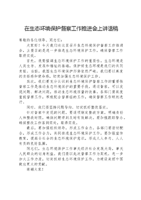 在生态环境保护督察工作推进会上讲话稿尊敬的各位领导、同志们:大家好!今天我们在这里召开生态环境保护督察工作推进会,主要目的是进一步推进生态环境保护工作,确保督察工作取得实效。首先,我要强调生态环境保护工作的重要性。生态环境是人类生存、发展和福祉的基础,保护好生态环境是我们的共同责任。当前,我国生态环境保护形势依然严峻,我们要以高度的责任感和使命感,切实加强生态环境保护工作。其次,我们要充分认识到生态环境保护督察工作的重要性督察工作是推动生态环境保护的重要手段,通过督察,可以发现问题、解决问题,推动生态环境质量的改善。各部门要高度重视督察工作,积极配合督察组的工作,确保督察工作顺利进行。同时,我们要坚持问题导向,切实抓好整改落实。针对督察中发现的问题,要逐项制定整改方案,明确责任人和整改时限,确保问题得到及时有效解决。要加强跟踪督办,确保整改工作落到实处,取得实效。最后,要加强组织领导,形成工作合力。各部门要密切配合,形成工作合力,共同推进生态环境保护工作。要加强宣传教育,提高全社会的生态环境保护意识,形成人人参与、人人有责的良好氛围。同志们,生态环境保护工作事关经济社会发展大局,事关人民群众的切身利益。我们要以此次督察工作为契机,进一步加大工作力度,切实抓好生态环境保护工作,为建设美丽中国做出更大的贡献。谢谢大家!