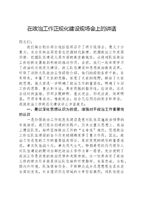 在政治工作正规化建设现场会上的讲话同志们:我们局分别在部分地区组织召开了两个现场会,意义十分重大。充分反映出局党委在把握时代脉搏、把握政治工作发展形势、把握队伍建设大局方面的高度敏锐性,必将对队伍政治工作创新发展起到积极的推动作用。会前,我们一起参观学习了政治机关规范化建设、政工队伍建设和思想政治教育成果,听取了消防大队政治工作经验介绍。他们的经验各有千秋,各有特色,丰富了大家的思路,拓宽了大家的视野,解放了大家的思想,使大家进一步明确了政治工作的重要性,明确了今后工作的思路、重点和方法,具有很强的指导性。应该讲,这次会议时间虽短,但却主题鲜明、重点突出、形式活泼、效果明显,开得非常成功。借此机会,结合几位同志的发言和讲话,我就政治工作规范化建设讲三方面意见:一、要以深化思想认识为前提,增强对于政治工作重要性的认识一是加强政治工作规范化建设是党对队伍实施政治领导的有效途径。我们党在创建的实践中,历来注重从思想上、政治上建设队伍,始终坚持政治工作的生命线地位,思想政治工作在队伍建设的各个历史时期都发挥了重大作用。因此,政治工作是党的工作的重要组成部分,是实现党的领导的重要途径,事关队伍战斗力,事关风气士气。特别是党的历代领导人对队伍建设的题词全都把政治工作作为第一要求,充分说明了政治工作是我党的政治优势和光荣传统。这一性质决定了政治工作的根本任务就是保证队伍始终听党指挥、永葆忠诚。当前,国内外环境、队伍使命任务、干部群众成分及思想观念正在发生深刻变化,社会意识形态领域的斗争空前激烈,对队伍提出了更加严峻的挑战和考验。而规范化建设是政治工作面临新形势,解决新问题的必然要求,是深化政治工作健康长久有效的保障。因此,要确保队伍听党指挥,作为政治机关和政工干部就必须从更高的角度和层次来认识政治工作,来重视政治工作,来推动政治工作规范化建设,使每个基层单位都成为贯彻党的路线方针政策、模范遵守党的纪律、圆满完成党赋予任务的坚强战斗集体,时刻确保队伍听党指挥,使每名干部群众都成为坚定自觉地听党话、跟党走的新时代干部群众。二是加强规范化建设是强化政治工作职能的重要保障。面对新的形势和任务,政治工作要发挥其应有的作用,增强实际效果,就必须在规范化建设上下功夫,用规范的制度体系强化政治工作的推动、激励、约束和保障等功能,并明确要求、落实责任,使政治工作由软变硬、由虚变实,有效避免政治工作的随意性和无序性,紧紧围绕公安队伍职能提供强大思想保证、精神动力、舆论支持和文化条件,充分发挥政治工作的生命线的服务和保证作用。三是加强政治工作规范化建设是圆满完成三大社会责任的根本任务。新时期下,政法队伍肩负着维护社会大局稳定、促进社会公平正义和保障人民安居乐业的历史使命,这就决定了政治工作必须为提高队伍战斗力提供思想保证和精神动力。面对新形势新任务新要求,我们开展政治工作必须适应队伍职能拓展的要求,通过政治工作规范化建设,不断强化政治工作的服务保证意识,激发广大干部群众有效履行使命的热忱,确保各级队伍忠于使命、献身使命、不辱使命。二、要以提高工作效率为总目标,推进政治工作规范化建设今天现场会主题是规范化,内容是政治机关规范化建设、政工干队伍伍建设和思想政治教育。目的是总结好经验、做法,形成规矩,帮助大家少走弯路。做好上述三个方面的工作,关键是要将提高工作效率,确保公平性作为政治工作的目标,以文可居文库——海量学习资料,手机电脑均可下载www.wenkeju.com规范化建设保证政治工作的公平公正,减少工作漏洞失误,推进政治工作长效健康发展。要提高工作效率,必须明确思想政治教育、政治机关和政工队伍之间的关系,在求实务实上下功夫,分别抓紧抓好。一是必须紧紧抓住思想教育这个重点。各级政治机关和政工干部必须站在时代的高度,把握队伍的现实和干部群众的特点,牢固树立与时代发展相适应、与使命任务相一致、与干部群众思想相吻合的教育理念。要将解决思想问题和实际问题作为教育的根本,坚持抓好中国特色社会主义理论体系武装,深入开展党的先进理论教育、增强干部群众听党指挥的理论自信、政治自觉和实际能力,凝聚干部群众意志和力量,做好大是大非面前旗帜鲜明、立场坚定,在重大考验面前靠得住、信得过。二是必须全力建强政治机关这个保证。政治机关是政治工作的领导机关,作用强不强,可以说决定着政治工作的成败。各级政治机关要加强政治工作研究谋划,为党委当好参谋助手,落实政治工作责任制,细化工作目标、任务和要求。要强化服务意识,加强检查指导,强化跟踪问效,加强帮扶指导。要严格落实政工岗位练兵要求,按照《政工条例》等文件规定,建立健全长效机制,促进政工工作科学化、制度化和规范化,确保政治工作有法可依、有法必依。三是必须牢牢把握政工队伍建设这个关键。政工干部是开展政治工作的主体,既是党的路