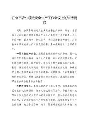 在全市农业领域安全生产工作会议上的讲话提纲近期,全国各地接连发生多起安全生产事故。刚才,省里的会议对做好近期农业领域安全生产工作作了系统部署,为了节约时间、提高效率、加快落实,我们紧接着召开会议,对当前农业领域安全生产工作进行部署,重点是做好五个方面的安全。一是农业生产安全。主要是农牧渔业的生产安全。要切实抓好在田作物和畜禽、渔业生产管理,及时发布预警信息,完善防灾减灾预案,做好雨雪、冰冻等自然灾害防范应对工作。最近,低温雨雪天气频发,要科学指导设施农业建设,加强温室大棚、危旧畜禽舍以及水电线路、通风降温、自动喂料等设施的排险加固。要强化渔船船主的主体责任、属地管理责任,深化渔业安全隐患排查和整治。二是农机安全。要强化农机安全源头管理,加强拖拉机和联合收割机注册登记、驾驶人考试管理等工作,全面提高农机驾驶操作人员的安全意识和安全操作水平。要加强农机隐患排查治理,督促指导农机生产经营服务组织,落实农机安全生产主体责任,建立各类台账、清单。要推动报废淘汰和变拖清零,统筹抓好农机报废、保险、执法、隐患治理、应急处置、信息化项目等方面建设。三是农产品质量安全。春节是我国重要的传统节日,农产品购销量大、消费旺盛,是风险集中、问题易发的敏感时期。一方面,要强化风险监测,把好上市关口。要持续加大力度推动治违禁 控药残 促提升三年行动工作落实,打击禁限用、停用药物使用、常规药物大幅超标等违法违规行为,聚焦鱼、鳅、鳝、蛙、猪(牛、羊)肉,果、蔬、蛋等当季品种,实现上市产品批批检测,合格上市。另一方面,要强化用药指导,加大检查力度。各地要结合农产品质量安全大数据智慧监管平台,开展巡查巡检,实现入网农产品生产主体、重点品种、宣传技术指导、重点生产节点巡查四个全覆盖。重点查看抽样检测、开具承诺达标合格证、建立生产记录等情况,严厉打击违规使用农药、兽药行为,守住菜篮子、米袋子、果盘子、油罐子、肉盘子的质量安全底线。四是涉农危化品安全。要加强农业生产、加工、流通领域液氨等危险品的安全管理。在兽药饲料及其添加剂企业中,加强兽用原料药生产、饲料粉尘控制以及高压高温设备使用、易燃易爆原料管理。加强对农资生产企业、农资市场及门店等危化品检查,确保各单位从业人员安全培训、隐患排查、隐患治文可居文库——海量学习资料,手机电脑均可下载www.wenkeju.com理到位。切实做好沼气池、沤肥池、化粪池等安全防护措施的落实,做到安全防护栏、安全盖板、警示标志等设置到位,强化用气、用电安全管理。五是涉农人员安全。一方面,是广大劳动者安全。我们的农业合作社,甚至每一个农民,都是一个单独的生产主体,稍有疏忽大意,就可能造成生产安全事故。对此,一定要加强对广大生产劳动人员的安全生产知识普及宣传力度,提高他们的安全意识。另一方面,是农口干部安全。机关单位对水电线路、消防设施、电梯等要逐项检查,及时消除安全隐患。对检测机构的有毒有害化学物品,要明确专人保管、入柜上锁。广大农口干部在返乡、走亲访友时,也要注意交通安全、用火、用电、用气安全,确保过一个安全祥和的春节。我就说这些,谢谢大家。文可居文库——海量学习资料,手机电脑均可下载www.wenkeju.com