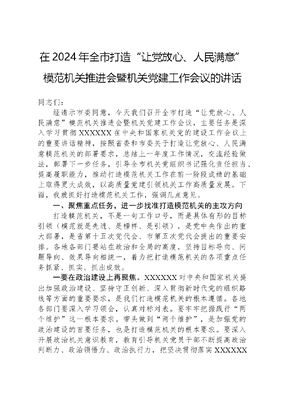 在2024年全市打造让党放心、人民满意模范机关推进会暨机关党建工作会议的讲话同志们:经请示市委同意,今天我们召开全市打造让党放心、人民满意模范机关推进会暨机关党建工作会议,主要任务是深入学习贯彻XXXXXX在中央和国家机关党的建设工作会议上的重要讲话精神,按照省委和市委关于打造让党放心、人民满意模范机关的部署要求,总结上一年度工作情况,交流经验做法,部署下一步任务,引导全市机关党组织书记强化责任担当、提高履职能力,推动打造模范机关工作在前一阶段成绩的基础上取得更大成效,以高质量党建引领机关工作高质量发展。下面,我就抓好打造模范机关工作,强调几点意见。一、聚焦重点任务,进一步找准打造模范机关的主攻方向打造模范机关,不是一句工作口号,而是具体有形的目标引领(模范就是先进、是榜样、是引领),是党中央作出的重大部署,是省第十五次党代会、市第五次党代会提出的重要安排。各地各部门要站在政治和全局的高度,坚持目标导向、问题导向、效果导向相统一,着力把打造模范机关的各项重点任务抓紧、抓实、抓出成效。一要在政治建设上再聚焦。XXXXXX对中央和国家机关提出加强政治建设、坚持守正创新、深入贯彻新时代党的组织路线等方面的重要要求,是我们打造模范机关的根本遵循。各地各部门要深入学习领会,认真对标对表。要牢牢把握践行两个维护这一根本要求。带头做到两个维护,是加强党的政治建设的首要任务,也是打造模范机关的根本要求。要深入开展政治机关意识教育,教育引导机关党员干部不断提高政治判断力、政治领悟力、政治执行力,把坚决贯彻落实XXXXXX重要讲话重要指示批示精神和党中央决策部署,作为制定政策、出台文件、开展工作的根本前提。具体到工作中,就是要把好文件、政策、会议、舆论等重要关口,把坚定拥护两个确立、坚决做到两个维护融入机关各项工作的全过程各方面。要牢牢把握XXX新时代中国特色社会主义思想这一主线。机关党建工作说到底是做人的工作,要发挥聚人心、稳人心、暖人心的作用,所以必须从机关党员干部的思想抓起,引领党员干部心往一处想、劲往一处使。最根本的就是要持续学深悟透XXX新时代中国特色社会主义思想,有计划、分层次抓好理论学习,引导机关党员干部带着问题学,推动学习成果切实转化为指导实践、推动工作的强大思想武器。要牢牢把握严肃党内政治生活这一重要抓手。从平时了解掌握的情况看,部分单位党组织党内政治生活不严谨不严肃的问题依然比较突出。在市委巡察的市直单位党委(党组)中,有*个单位存在民主生活会质量不高的问题,批评与自我批评普遍辣味不足,甚至流于形式;有*个单位存在三会一课制度执行不到位的问题,有的甚至*以来仅上党课4次。之所以出现这些问题,根源还是部分党委(党组)书记对党建工作不重视,没有真上心,没有真抓实抓,甚至放任自流。所以,希望大家引起重视,必须严格执行《关于新形势下党内政治生活的若干准则》,认真落实各项组织生活制度,充分用好批评和自我批评的武器,不断增强党内政治生活的政治性、时代性、原则性、战斗性。二要在履职尽责上再聚焦。打好一个强攻战、实现五个新跨越是市委贯彻党中央决策部署和省委要求提出的今后五年的奋斗目标。各地各部门要立足本职岗位,高质量完成好本单位各项目标任务。要狠抓工作落实。打造模范机关,一个重要着力点就是要提升抓落实的质量和水平。要针对应付了事、有名无实、折扣变通、变样走形、虎头蛇尾、推诿扯皮等工作不落实的表现,从制度机制上深挖根源,举一反三,坚决整改,推动形成事事马上办、人人钉钉子、个个敢担当的良文可居文库——海量学习资料,手机电脑均可下载www.wenkeju.com好氛围。要转变工作作风。多采用四不两直(不发通知、不打招呼、不听汇报、不用陪同接待、直奔基层、直插现场)方式,掌握第一手情况,确保在基层一线发现问题、解决问题、推动发展。目前,市、县(区)直部门都建立了基层联系点,点对点联系乡村、社区、企业、工程项目等,这是一个很好的工作方式,我们要坚持好、运用好。要提升工作效能。要聚焦作示范、勇争先的目标要求,放大坐标系,找准参照地,积极学习借鉴先进地区的经验做法,不断提升在全国同系统中的地位,真正体现模范效应。要全面推行高位化调度、集成化作战、扁平化协调、一体化办理工作模式,确保机关工作无缝对接、系统完整、运转高效。要加大信息化建设力度,大力推动互联网+政务服务,切实推进各单位办事流程优化、审批环节协同、政务服务集成。三要在服务群众上再聚焦。全心全意为人民服务是我们党的根本宗旨,也是我们打造模范机关的出发点和落脚点。要厚植为民情怀。机关单位是各行各业政策直接制定者、推动落实者,其工作直接关系到群众的切身利益。打造模范机关,要始终坚持人民至上、站稳群众立场,在为民服务中厚植