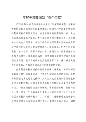 年轻干部要做到五个自觉AXXX在2024年春季学期中央党校(国家行政学院)中青年干部培训班开班之际作出重要指示,强调年轻干部要自觉做党的创新理论的笃信笃行者、对党忠诚老实的模范践行者、矢志为民造福的无私奉献者、勇于担当作为的不懈奋斗者、良好政治生态的有力促进者。年轻干部是党和国家事业发展的生力军,是中国特色社会主义事业的接班人。新征程上,广大年轻干部要把五个自觉的要求刻在心中、落到实处,坚定理想信念,厚植为民情怀,提高政治站位,深学细悟A新时代中国特色社会主义思想,把学习成效转化为做好本职工作、推动事业发展的生动实践,为推进中国式现代化作出新的贡献。自觉做党的创新理论的笃信笃行者,就要有博学而不穷笃行而不倦的执着追求。笃信指的是忠实的信仰,年轻干部要坚定马克思主义信仰、共产主义远大理想和中国特色社会主义共同理想,特别是要对A新时代中国特色社会主义思想笃信。坚定理想信念是终身课题,需要常修常炼,要信一辈子、守一辈子。正如革命先辈李大钊同志笃信共产主义在中国必然得到光辉的胜利。笃行,意味着要把内化于心的坚定理想信念体现在本职工作上、落实到具体行动中。AXXX强调:道不可坐论,理不能空谈。学习党的创新理论的目的全在于运用。广大党员干部特别是年轻干部要一以贯之加强理论学习,深刻把握马克思主义的立场、观点和方法,坚持不懈用A新时代中国特色社会主义思想凝心铸魂,做到在真学真信中坚定理想信念在细照笃行中不断修炼自我,在知行合一中经风雨、见世面、强筋骨,不断筑牢信仰之基、补足精神之钙、把稳思想之舵,切实提升马克思主义理论水平和运用能力。自觉做对党忠诚老实的模范践行者,就要有倾泻向人怀抱尽,忠诚为国始终忧的优秀品格。AXXX强调:对党忠诚,不是抽象的而是具体的,不是有条件的而是无条件的,必须体现到对党的信仰的忠诚上,必须体现到对党组织的忠诚上,必须体现到对党的理论和路线方针政策的忠诚上。忠诚老实是共产党人必须具备的党性原则和优秀品格。张连印、杨善洲、张富清……这些优秀共产党员身上,无不体现着忠诚老实的党性修养和人格魅力。广大年轻干部要始终以党的旗帜为旗帜、以党的意志为意志、以党的使命为使命,始终把严明党的政治纪律和政治规矩摆在突出位置,着力提高政治判断力、政治领悟力、政治执行力,增强四个意识、坚定四个自信、做到两个维护,在贯彻落实党中央重大决策部署中以上率文可居文库——海量学习资料,手机电脑均可下载www.wenkeju.com下带头干,以关键少数带动绝大多数,时时事事处处说老实话、办老实事、做老实人,始终做到质朴坦荡、言行一致、表里如一。自觉做矢志为民造福的无私奉献者,就要有百姓安乐是我心,忧疾扶危在我身的公仆情怀。历史唯物主义认为,人民群众是历史的主体,人民群众不仅是物质财富和精神财富的创造者,而且是社会变革的决定性力量。中国共产党自诞生之日起,就把为人民谋幸福刻在自己的旗帜上。从心中装着全体人民,唯独没有他自己的焦裕禄,到不带私心搞革命,一心一意为人民的谷文昌,再到秉持清贫本色,甘当指路明灯的张桂梅,都印证了共产党人矢志为民造福的决心、恒心和真心。可以说,中国共产党的百年历史,就是一部践行党的初心使命的历史,就是一部党同人民同甘共苦的历史。为民造福就是要坚持以人民为中心的发展思想,每一位年轻干部都要树立和践行正确的政绩观,走好新时代党的群众路线,增强服务群众的本领,用心用情用力解决群众急难愁盼问题,同时要增强工作的科学性、预见性、主动性、创造性,自觉把为民造福作为最大政绩,坚决做到民有所呼、我有所应。自觉做勇于担当作为的不懈奋斗者,就要有世上无难事只要肯登攀的进取精神。AXXX强调,改革推进到今天,比认文可居文库——海量学习资料,手机电脑均可下载www.wenkeju.com识更重要的是决心,比方法更重要的是担当。天下兴亡,匹夫有责,担当是一种责任、一种精神,更是一种追求。共产党人必须做改造社会、改造世界的担当者,敢于担当责任,勇于直面困难。勇于担当作为就是要切实增强年轻干部的政治担当、历史担当和责任担当。但是,现在在一些党员干部中,不愿担当、不敢担当、不会担当的问题不同程度地存在,有的做老好人太平官,怕出事,不干事;有的信奉多栽花少种刺,遇到困难不伸手,只想争功不想揽过,只想出彩不想出力;有的遇到矛盾惊慌失措,遇见斗争直打摆子。作为年轻干部,必须以时不我待的紧迫感锐意进取、攻坚克难、主动担当,拿出拼搏忘我的干劲,提高政治站位,强化政治担当;必须以重任在肩的使命感履职尽责、真抓实干、主动作为,彰显有我的历史担当;必须以舍我其谁的责任感敢于斗争、善于斗争、主动担责,厚植无我的情怀,提升政治勇气,干事担事