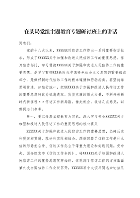 在某局党组主题教育专题研讨班上的讲话同志们:党的十八大以来,XXXXXX对信访工作作出一系列重要指示批示,形成了XXXXXX关于加强和改进人民信访工作的重要思想。作为信访部门,学习贯彻XXXXXX关于加强和改进人民信访工作的重要思想,是学习贯彻XXX新时代中国特色社会主义思想的重要组成部分,是做好新时代信访工作的根本遵循和行动指南。要坚持学思用贯通、知信行统一,把XXXXXX关于加强和改进人民信访工作的重要思想转化为锐意进取、攻坚克难的强大力量,不断开创新时代新征程××信访工作新局面。借此机会,我讲几点意见,以供同志们参考。第一,要以开展主题教育为契机,深入学习领会XXXXXX关于加强和改进人民信访工作的重要思想的核心要义XXXXXX关于加强和改进人民信访工作的重要思想,坚持历史和现实相贯通、理论和实际相结合,深刻回答了信访工作是什么信访形势怎么看、信访工作怎么干等重大理论和实践问题。党中央、国务院发布《信访工作条例》,将XXXXXX关于加强和改进人民信访工作的重要思想贯穿始终,体现到了信访工作的方方面面第九次全国信访工作会议召开,XXXXXX等中央领导同志亲切接见与会代表,作出重要指示,会议对这一重要思想作了全面阐述。认真贯彻落实XXXXXX关于加强和改进人民信访工作的重要思想,坚持党对信访工作的全面领导,坚持人民至上,坚持为民解难、为党分忧,坚持改革和完善信访制度,坚持把信访纳入法治轨道坚持三到位一处理工作要求,坚持和发展新时代枫桥经验,坚持底线思维,坚持建设高素质信访工作队伍,确保新时代信访工作始终沿着正确方向前进。XXXXXX关于加强和改进人民信访工作的重要思想,特别是蕴含其中的核心要义,是我们党深化对信访工作规律性认识的重大成果,要完整准确全面地理解贯彻。要在深入开展主题教育中,把学习贯彻XXXXXX关于加强和改进人民信访工作的重要思想与学习贯彻党的XX大精神紧密结合,深入学习领会、吃透基本精神、把握核心要义,切实增强贯彻落实的思想自觉、政治自觉和行动自觉。第二,要坚持以人民为中心,在着力解决群众急难愁盼问题中推动主题教育走深走实XXXXXX在中央主题教育工作会议上强调,要着力解决人民群众急难愁盼问题,把惠民生、暖民心、顺民意的工作做到群众心坎上,增强人民群众获得感、幸福感、安全感。市委X在《群众给市委书记来信情况》上作出批示,要求对信访情况进行系统分类梳理,作为主题教育人民群众反映强烈问题的依据之一。要深刻认识信访工作职能定位,精准把握主题教育目标导向、问题导向结果导向和学思想、强党性、重实践、建新功十二字总要求一是高度关注人民群众反映强烈的信访问题。群众反映强烈的信访问题集中在城乡建设、经济管理、市场监督、自然资源、政法等XX大领域,主要反映交房难、办证难、物业乱象、金融平台逾期兑付、网络数字平台诱导消费等XX个大类问题。各相关行业主管部门和属地要结合主题教育,下大力气解决化解这些领域信访突出问题,将其作为检验主题教育成效的重要依据。二是加强重点领域信访突出问题集中攻坚。重点领域信访问题政策性、涉众性、风险性强,防范化解难度大。要充分发挥联席会议机制,统筹协调推进各项工作,有效解决信访突出问题。要深入开展调研查找问题症结,积极采取上下联动、市县和部门对接、责任捆绑等措施,从政策层面推动问题成批解决。要坚持系统抓、抓系统,信访工作与业务工作有机结合,从源头上预防和减少信访问题发生。要持续推行领导干部接访下访包案制度,重点疑难问题协调安排党政主要领导包案,依法依规解决群众的合理诉求。三是深入开展信访问题源头治理三年攻坚行动。充分吸收借鉴治理重复信访、化解信访积案专项工作的成功模式,力争经过XX年努力,推动基层信访工作责任体系更加完善,绝大多数可能引发信访问题的矛盾纠纷能够发现在早、化解在小,绝大多数的信访问题在县级及以下得到妥善化解,信访倒金字塔结构有效改善,信访工作领域基层治理体系和治理能力现代化水平显著提高第三,聚焦目标任务,以信访制度改革和体制机制创新保障高质量发展XXXXXX在对信访工作的重要指示中要求,不断提高工作能力和水平,为营造安全稳定的社会环境发挥更大作用。要以健全体制、完善机制、提升能力为重点,系统加强、全面改进、优化升级各项工作,更加有力有效地营造安全稳定的社会环境。一是推动信访工作机构改革。这次党和国家机构改革,对信访工作的思路理念、体制机制、工作模式、职能作用等提出了新的要求是信访工作领导体制、工作机制的重大变革和重构,必将为信访事业长远发展提供更加坚强的政治保障和组织保障。要深刻领会这次机构改革的重要性和紧迫性,坚决维护党中央决策部署的权威性和严肃性,坚定改革信心决心,推动中央决策部署有效落地二是推进信访工作示范县、乡镇(街道)创建。开展信访工作示范县、乡镇(街道)创