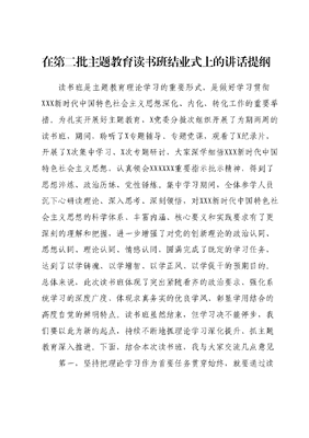 在第二批主题教育读书班结业式上的讲话提纲读书班是主题教育理论学习的重要形式,是做好学习贯彻XXX新时代中国特色社会主义思想深化、内化、转化工作的重要举措。为扎实开展好主题教育,X党委分批次组织开展了为期两周的读书班,期间,聆听了X专题辅导、专题党课,观看了X纪录片,开展了X次集中学习、X次专题研讨,大家深学细悟XXX新时代中国特色社会主义思想,认真领会XXXXXX重要指示批示精神,得到了思想淬炼、政治历练、党性锤炼。集中学习期间,全体参学人员沉下心研读理论、深入思考、深刻领悟,对XXX新时代中国特色社会主义思想的科学体系、丰富内涵、核心要义和实践要求有了更深刻的理解和把握,进一步增强了对党的创新理论的政治认同、思想认同、理论认同、情感认同,圆满完成了既定的学习任务,达到了以学铸魂、以学增智、以学正风、以学促干的预期目的。总体来说,此次读书班体现了突出紧随看齐的政治要求、强化系统学习的深度广度、体现求真务实的优良学风、彰显学用结合的高度自觉的鲜明特点。读书班虽然结束,但学习决不能停步,我们要以此为新的起点,持续不断地抓理论学习深化提升、抓主题教育深入推进。下面,结合本次读书班,我与大家交流几点意见第一,坚持把理论学习作为首要任务贯穿始终,就要通过读书班等形式在理论学习上下足功夫,以高质量理论学习推动主题教育走深走实、见行见效。理论强才能方向明,开展读书班是凝心铸魂、坚定理想信念的需要,是锤炼品格、铸牢对党忠诚的需要,是践行宗旨、站稳人民立场的需要。读书班期间,参学学员集体读原著、学原文、悟原理、知原义,把彻底的理论学彻底,在理论上补课、思想上提神、精神上补钙、行动上加油,自觉用党的创新理论统一思想、统一意志、统一行动,学出了对党的创新理论的四个认同,学出了对捍卫两个确立、做到两个维护的政治自觉、思想自觉、行动自觉,切到了做好示范的带头作用。大家坐下身来学习,逐字逐句读原文,原汁原味学原著,通过集中领学和业余自学相结合,实现了将必读书目至少通读一遍的目标要求;静下心来思考,多思多想知原义,全面系统悟原理,在学深悟透、精思细研中提高理论素养、坚定理想信念升华觉悟境界;投入进来讨论,进行思想碰撞,接受思想淬炼、深化思想认识,实现参加人员研讨交流全覆盖,真正达到了深学细研的目的。全体学员立足市情、立足当前工作形势、立足工作实际,做好创新理论深化、内化、转化工作,倒逼自我对解决本领恐慌等问题进行冷思考,坚持带着问题学,查找问题差距不足、提出思路举措办法,切实把理论学习成果体现在奋进中国式现代化新征程、谱写高质量发展新篇章上,体现了学以致用的要求。读书班作为开展主题教育的先手棋关键招是发挥党员干部示范带动作用的具体行动,更是提升素质能力的难得机会,希望大家以读书班为新的起点,认真对标学思想、强党性、重实践、建新功总要求,持续抓实主题教育各项重点措施,一体推进以学铸魂、以学增智、以学正风、以学促干,蘸墨挥毫,力透纸背书写好主题教育新篇章。第二,牢牢把握总体要求,把主题教育作为一个学习、思考的过程,一个实践、行动的过程,不断提升主题教育实效。学习贯彻XXX新时代中国特色社会主义思想,是一项重大政治任务和长期战略任务,必须持续发力、久久为功。要认真总结运用读书班的学习成果,把理论学习成果、学习激发的热情和干劲,转化为绝对的对党忠诚、强烈的责任担当、深厚的为民情怀、过硬的履职本领。要在以学铸魂上持续下功夫见实效,坚持把学习融入日常、抓在经常,用好理论学习中心组学习、专题研讨、个人自学等方式,拿出挤和钻的精神,沉下身来学、静下心来悟及时跟进学习XXXXXX最新重要讲话重要指示批示精神,深刻把握蕴含其中的道理、哲理、世界观和方法论,推动学习贯彻走深走实。在以学增智上持续下功夫见实效,增强识势之明、提高布局之能、掌握干事之道,提升推动高质量发展本领、服务群众本领防范化解风险本领。注重观大势,胸怀两个大局、心怀国之大者,时刻做到战略前置、未雨绸缪、有备无患。注重把大局,自觉把分管工作放到党和国家大局、全市工作全局中部署推进,争取最好效果。注重谋大事,把主要精力放在抓战略问题、全局指导、宏观决策上,以新担当新作为实现白山振兴发展新突破。要在以学正风上持续下功夫见实效,把学习成果转化为攻坚克难的强大力量和顽强作风,大力培树严新细实优良新风,认真开展调查研究相关工作,撰写高质量的调研报告。要在以学促干上持续下功夫见实效,认真总结和运用好读书班成果,将理论学习与实践有机贯通起来,结合XXXXXX重要讲话精神,铆足劲狠抓落实,创造性开展工作,破解发展难题,探索发展新路,全力抓好各项工作落地落实,推动经济社会高质量发展,以主题教育实效促进高质效履职,以高质效履职检验主题教育成效。第三,坚持把开展主题教育作为解决问题、