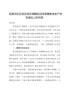 区委书记在全区信访维稳百日攻坚暨安全生产动员会议上的讲话同志们:区委经过认真研究,决定召开信访维稳百日攻坚暨安全生产动员大会,主要是全面排查问题,分析当前严峻形势,动员全区上下履职尽责,彻底化解当前信访维稳和安全生产难题,确保全国两会期间全区不发生来自我们的干扰。刚才,××同志安排了近期信访稳定工作及百日攻坚行动,××同志安排了安全生产工作,我都同意,大家要抓好落实。下面,我再强调三点意见一、要提升政治站位信访维稳和安全生产工作都是十分重要的政治工作,事关党和国家长治久安,事关改革发展大局,事关群众切身利益。大家要认清形势,提升站位,充分认识当前集中开展信访稳定百日攻坚和安全生产工作的极端重要性,以更加高度负责的态度、更加积极主动的作为,坚决落实好上级交办的各项工作任务。近期中央和省委、市委连续发出通知,强调要未雨绸缪、压实责任,确保不发生群体性事件、不发生重大安全事故、不发生极端个人事件、不发生暴恐和重大刑事案件、不发生赴京到省规模性集访事件、不发生重大网络舆情事件。大事难事看担当,关键时刻看干部,我们一定要自觉增强政治敏锐性,把讲政治作为第一要求,保稳定作为第一责任,主动把化解信访维稳问题作为强化四个意识、落实两个坚决维护的具体行动,以高度的政治自觉、思想自觉和行动自觉来维护好社会大局和谐稳定。当前,我们正在集中推进五个重大(重大任务、重大事项、重大民生、重大项目、重大改革)六个专项治理三大攻坚战。信访维稳和安全生产工作是做好这些工作的有力保障。稳定是经济、是环境、是民心、是形象,更是竞争力。稳定和发展不矛盾,稳定工作做好了,就为我们发展提供了更多的发展机遇所以说,稳定也是发展。近年来,我区信访维稳工作虽然取得了明显成效,但好的形势还很脆弱,从客观上看,长期困扰我们信访维稳工作的热点难点问题仍然较多,比如问题楼盘、企业改制非法集资等等,很多属于国家政策层面问题和历史遗留问题,化解难度大,从主观上看,我们部分领导干部在遇到难题时信心不足、在破解难题中作风不实、在克难攻坚上创新不多,争先晋位的信心和决心还不够足,抓落实的紧迫感还不够强,缺乏咬定青山不放松的拼劲和韧劲。问题不解决永远都是发展中的包袱,而且包袱还会越来越大,我们必须痛下决心、花大力气、下苦功夫调动各方面的积极性和主动性,激发大家的激情、斗志和干劲,合力开展攻坚,彻底甩掉包袱,轻装上阵,推动各项工作再上新台阶。二、要把握关键环节关键环节事关工作成效,必须抓住关键求突破,带动整体工作。当前要突出抓好三个关键环节:第一,狠抓排查。各部门要紧紧围绕重点领域、重点群体、重点问题、重点人员,特别是要把问题楼盘、企业改制、非法集资领域,以及信访老户、涉军等群体挑头人员作为工作重点,深化网格化管理,对各类信访维稳矛盾隐患和安全风险进行拉网式排查,逐一过筛子梳篦子,彻底排查隐患,掌控动态,全力以赴消除盲点盲区,杜绝漏排瞒报,真正将各类矛盾纠纷和隐患苗头全部纳入视野,做到底数清、台账全、全覆盖、无遗漏要健全信息研判反馈通报预警机制,第一时间掌握信息,第一时间研判预警、第一时间作出反应,做到信息灵、反应快、处置好始终牢牢把握信访维稳和安全生产工作的主动权。第二,狠抓化解。信访维稳和安全生产工作排查是基础,关键在化解,长效在机制。要坚决贯彻信访维稳工作三到位一处理原则和安全生产三管三必须要求,主动对标对表,妥善处理各类矛盾诉求,及时消除各类安全隐患。要以人民为中心,攻坚化解一批。对群众初信初访问题,要严格落实首办责任制,对群众不满意的案件,信访部门要严把结案关,确保依法按政策一次性解决到位;对重复信访问题要落实县级领导包案,疑难复杂的积案,必须大员上前线,一把手要主动接访约访、研判,推动问题化解,数量不能少,必须有难度,只有这样才能发挥示范带动作用。各单位确实化解不了的,区信访联席会议要集中研判决不能变成糊涂账,必须给群众一个负责任的说法;要坚决摒弃新官不理旧账不能让老百姓占便宜的错误思想,不管是哪一任造成的问题,我们在其位必须谋其政。同时,要敢于打破常规,不要总拿现在和过去比、张三和李四比,只要不是政策法规明令禁止、不引起攀比和负面效应的信访案件,在群众承诺息诉息访的基础上,可以放开口子,最大限度满足群众的利益诉求,这也是以人民为中心的体现。以稳定为基础,疏导教育一批。对化解后不息诉或者一时不能化解的问题,要认真做好思想疏导工作,一方面,带着感情和责任做好工作。包案领导要主动扑下身子、放下架子,深入信访人家中交朋友、结对子,要将心比心,换位思考,法、理、情相结合做工作,再固执的人也会有软肋,要去抚慰对方最柔软的地方,只要热度足够,再冻的冰块也会被融化,心结打开了,问题也就迎刃而解;另一方面,要创新方式方法,引入社会力量参与信访维稳案件