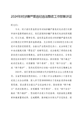 2024年对涉嫌严重违纪违法整改工作部署讲话同志们:今天,刚才省纪委监委宣布对XX涉嫌严重违纪违法进行纪律审查和监察调查的决定。我们汲取XX涉嫌严重违纪违法的深刻教训,引以为戒、警钟长鸣。省纪委监委决定对XX涉嫌严重违纪违法问题进行纪律审查和监察调查,充分体现了以XXX同志为核心的党中央坚持党要管党、全面从严治党的坚定决心,充分体现了党中央对腐败问题零容忍的鲜明态度,充分体现了将党的自我革命进行到底的坚强意志,省委坚决拥护党中央的决定。全市各级党组织和领导干部要旗帜鲜明讲政治,深刻领悟两个确立的决定性意义,切实增强四个意识、坚定四个自信、做到两个维护,坚决把思想和行动统一到党中央决定精神上来2024年,我们要坚持以XXX新时代中国特色社会主义思想为指导,全面贯彻落实党的XX大、二十届二中全会精神和二十届中央纪委三次全会部署,深入学习贯彻XXXXXX关于党的自我革命的重要思想,坚决落实全面从严治党战略方针,深刻领悟两个确立的决定性意义,自觉增强四个意识、坚定四个自信做到两个维护,坚持稳中求进工作总基调,巩固拓展主题教育和教育整顿成果,忠诚履职,推动健全全面从严治党体系,纵深推进正风肃纪反腐,纵深推进新征程纪检监察工作高质量发展为加快实现美好蓝图提供有力保障。一、聚焦两个维护抓实政治监督坚决落实两个维护政治责任。紧紧围绕贯彻落实XXXXXX重要指示批示和党中央大政方针加强政治监督,把严明党的政治纪律和政治规矩摆在突出位置。紧盯政治忠诚,坚决防范和查处七个有之问题,坚决防范和查处低级红高级黑。紧盯政治安全,坚决防范和查处弱化党中央权威和集中统一领导的问题,及时消除风险隐患。紧盯政治责任,把监督重点放在推动各级党组织和领导干部扛牢全面从严治党政治责任上,把两个维护体现在履职尽责、做好本职工作的实效上。紧盯党内政治生活,督促各级党组织落实民主集中制,进一步增强政治功能和组织功能。1.精准开展专项监督。开展优化营商环境专项监督,聚焦政策落实、涉企服务、行政审批、监管执法等重点领域和关键环节加强监督检查,治理检测机构、中介机构背后的乱象,督促责任部门制定优化营商环境的负面清单,建设营商环境监测点,坚决纠治乱检查乱收费乱罚款、拖延塞责、索拿卡要、违规干预插手市场经营活动以及在工程招投标中设置过高资质门槛、歧视非公经济、搞地方保护主义等问题,推动构建亲清统一的政商关系。持续深化领导干部利用职权或影响力为亲友牟利专项整治,重点解决领导干部违规经商办企业虚假整改、领导干部亲属在金融领域充当资源型人才等突出问题。深化靠企吃企问题专项整治,严查违规决策导致重大亏损等背后的腐败问题。常态化开展洞庭清波监督,深化统计造假、违规举债和虚假化债及融投资领域专项监督,高度关注债务风险背后的不作为乱作为和谋私贪腐、新官不理旧账等问题。2.务求实效推动首要任务落实。坚持把推进中国式现代化作为最大的政治,把坚持高质量发展作为新时代的硬道理,把政治监督融入重大发展战略、重要政策举措、重点项目任务的制定和落实之中,坚决纠治贯彻新发展理念不完整不准确不全面、落实党中央决策部署变形走样、权力观政绩观事业观扭曲、压实意识形态工作责任制不到位等问题。把政治监督与日常监督紧密结合起来,紧盯3+5+3标志性工程,对重大项目建设、重点招商项目落地全程跟进监督,服务保障三个高地建设。综合运用巡视、约谈、督导、调研、纪检监察建议等方式,督促各地党组织切实担负起抓高质量发展的重大责任,督促职能部门积极履行抓机关、带系统、促基层的监管责任。二、持续发力纵深推进反腐败斗争3.保持惩治腐败高压态势。深刻认识和把握反腐败绝对不能回头、不能松懈、不能慈悲,必须永远吹冲锋号的重要要求,坚持党对反腐败斗争的集中统一领导,坚定扛起专责机关职责,有力有效协助党委组织协调反腐败工作。紧盯重点问题,把严惩政商勾连腐败作为攻坚战重中之重,坚决防止各种利益集团、权势团体向政治领域渗透。紧盯重点领域,坚决查处金融、国企、园区、能源、医药、基建工程和招投标等权力集中、资金密集、资源富集领域的腐败。紧盯重点对象,坚决查处一把手腐败,严查裙带腐败衙内腐败。4.拓展反腐败斗争深度广度。坚持一体推进三不腐,深化标本兼治、系统施治,让反复发作的老问题逐渐减少,让新出现的问题难以蔓延,推动防范和治理腐败问题常态化、长效化。建立腐败预警惩治联动机制,加强廉洁风险隐患动态监测,紧盯新的经济业态和产业模式中的腐败新表现,精准辨识、有力惩治影子股东期权腐败交易型腐败放贷牟利等新型腐败和隐性腐败,深挖彻查滥用职权、失职渎职等问题,加大对政商旋转门逃逸式辞职治理力度。严惩行贿行为,坚决查处那些老是拉干部下水、危害一方政