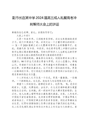 副市长在某中学2024届高三成人礼暨高考冲刺誓师大会上的讲话尊敬的各位老师、家长,亲爱的同学们:大家上午好!又是一年高考季,又到桃李芬芳时。在这生机勃勃的美好日子,我们齐聚清北广场,共同见证一个庄重而神圣的时刻—— X一中2024届高三成人礼暨高考誓师大会的隆重举行。在此,我谨代表 X市委、市政府,向在高考征程上辛勤付出的全体师生致以最崇高的敬意,同时向即将步入人生新纪元的同学们及各位家长致以最热烈的祝贺与最美好的祝愿!东风送暖扬帆起,青春策马闯雄关。刚刚结束的8公里火炬接力,86位学生代表肩扛青春与梦想,从吉山至鳌山,跨越山河,传递的不仅仅是火种,更传递着对先贤的敬仰、对青春的礼赞、对梦想的执着追求。这不仅是一场体能的考验,更是一次精神的升华。它引领我们回溯那些为梦想挥汗如雨的日子,感受青春的热血与力量。十八岁的成人礼不仅是一个仪式,更是一番激励,一份期待,一个新的起点。在这里,我也有几句话想要送给大家。希望十八岁的你们,能够记住家乡、记得X。 X,是你们的家乡。这里,风景独好。去徒步,在九龙竹海和桃源仙境里体验生态自然;去奔跑,闻一闻安砂万亩大寨田里的稻香;去泛舟,在九龙湖上看野鸬拍水激起湖光荡漾。这里,人杰地灵。中国纸币首创者张若谷、北宋著名理学家陈瓘、中国古琴集大成者杨表正、中国航空事业的先驱者李宝焌、刘佐成等都诞生在这里。红军标语博物馆让你得以探索永不磨灭的红色印迹,北上抗日先遣队遗址告诉你这片热土上有过血与火的荣光。家乡的每一块土地都值得你用脚步丈量,这里有养育你、爱护你的父母和教育你、鼓励你的师长,有陪伴你、温暖你的同学和伙伴,这里是你们梦想起航的地方,也永远是敞开怀抱欢迎你们归乡的港湾。希望十八岁的你们,能够不惧挑战、享受成长。临近高考这个成年后的第一次大考,也许你曾因为解不出难题和波动的排名而心慌,会因为害怕梦想难以实现而迷茫,曾因为父母的唠叨和期望而惆怅,也因为临近与同学和老师的分别而感伤,我想告诉你们的是,这些都太过正常,成长没有捷径和秘方,你直面每一次挫折的勇气会成为你今后人生的底气,你克服每一个困难的坚持会成为今后成功最好的加持。若干年后回忆起当初奋斗的模样,你会明白是每天一点点的学习和进步让你收获精神的充实,是父母师长悉心的教导爱护让你感到踏实,是因为努力接近梦想的过程让你感到奋斗意义的真实。愿你们踏过千重浪,不忘少年样,享受成长中的苦辣酸甜,为自己的人生放手一搏。希望十八岁的你们,能够拥抱梦想、探索远方。同学们,你们正值青春年华,潜力无限、未来可期。你读过的书籍、背过的公式可能会忘记,但是它们无形地融入你的思想,成为你感知世界的触角,让你拥有良好的沟通能力、文字表达能力、科学逻辑思维,以及探索世界的好奇心和能力,让你一步步成长为梦想中的自己。在这个充满挑战与机遇的时代,希望你们把稳理想信念之舵,高扬修身立德之帆,勤划读书明志之桨,开好乘风破浪之船,在建设社会主义现代化强国新征程上、在推进中华民族伟大复兴之路上,做奋进者、实践者和爱国者,把个人梦想汇入时代潮流,让蓬勃年华与家国共振。在接下来的90天里,希望你们能调整心态、轻装上阵,用科学的方法和坚定的信念迎接挑战。请相信,在你们的背后,市委、市政府全程在线、全力准备、全情呵护, X一中和各位家长是你们的坚强后盾,一起为大家的梦想保驾护航;请相信,你们的努力和汗水定会在2024年高考中绽放最璀璨的光芒;请相信,在你们这充满朝气和潜力的青年中,定有未来的国之栋梁。最后,祝愿同学们在高考中取得优异成绩,金榜题名、前程似锦;祝愿老师们身体健康、工作顺利,桃李满天下;祝愿家长们事业顺心、家庭幸福安康;祝愿 X一中在未来的岁月里续写辉煌篇章,培育更多栋梁之材!谢谢大家!