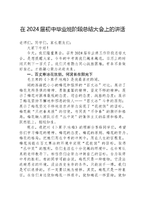 在2024届初中毕业班阶段总结大会上的讲话老师们,同学们,家长朋友们:大家下午好!今天,我们隆重集会,召开2024届毕业班工作阶段总结大会,是想提醒大家,今年的中考离我们越来越近,日历上的时间只剩下一百天了。我们只有勠力同心战胜困难,有条不紊做好自己,才能凝心聚力共赴未来。一、百丈寒冰花犹俏,何况长在阳光下毛主席的《卜算子.咏梅》是我最喜欢的词。词的画面把小小的梅花和强悍的百丈冰对比,展示了梅花无所畏惧的精神、勇敢直面的精神、坚定不移的精神;展示了梅花对困难藐视的态度、迎击的态度、战胜的态度;展示了梅花坚持不懈地和邪恶的敌人——百丈冰斗争的原则;展示了梅花坚定不移地追求并努力实现了花枝俏的目标。梅花做只把春来报的信使,与同类不争春的胸怀和格局,梅花融入团队后在丛中笑的集体主义的品质和格局,跃然纸上,栩栩如生。现在,我把对《卜算子.咏梅》的理解分享给同学们,希望你们学习梅花的精神、梅花的态度、梅花的原则、梅花的努力、梅花的格局,把她们用在中考的冲刺中,用在人生的征程里。梅花尚能在百丈寒冰的环境中实现花枝俏的目标,取得丛中笑的胜利,你们生活在十分优越的环境中,在非常认真的老师教导下,相信你们会努力冲刺自己的目标,全力取得中考的胜利。有的同学可能会说,梅花只是一种植物,它没法逃避恶劣的环境,没法改变生存的条件,只能放手一搏,我们是可以选择的,不一定要以她为榜样。其实,梅花只是一种象征,在你们身边犹如梅花一样艰辛,犹如梅花一样坚持,犹如梅花一样努力拼搏实现人生目标的人比比皆是。可能是你们的父母,可能是你们的亲朋,也可能是你们崇拜的偶像,他们就是你们学习的榜样,就是你们人生的楷模!百丈寒冰花犹俏,何况长在阳光下!二、有条不紊从我起,坚定不移奔目标有条不紊从我做起,要求学校、老师、学生、家长,在本期的教学中,在本期的学习中,在本期的配合中,要定好自己的位,找准自己的点,使出自己的劲,不要怀疑,不乱方寸,不受干扰。学校有条不紊,就是要认真研究中招政策,千方百计提供支持,不折不扣做好服务,积极解决各种问题,有效保持家校沟通;老师有条不紊,就是要学科之间相互配合,学科之内分工合作,认真落实教学计划,耐心细致深耕课堂,认真分析学生现状,不断调整教学策略,因人施策组织复习;学生有条不紊,就是要上课听讲聚精会神,完成作业一丝不苟,老师要求不打折扣,唤醒自己努力学习,警醒自己不骄不躁,觉醒人生冲刺目标;家长有条不紊,就是要坚定不移支持学校,坚持不懈陪伴孩子,坚韧不拔配合老师,坚如磐石毫不动摇。三、共创辉煌育英才,凝心聚力赴未来凝心聚力就是要融合集体的智慧,包括学校的智慧、老师的智慧、家长的智慧、学生的智慧,聚沙能成塔,集腋能成裘,融智力无穷,她将是我们战胜困难扫除障碍最锐利的武器!凝心聚力要有一种感谢的心态。发自内心的感谢是一种力量,是对感谢双方的鼓舞和促进。我代表学校用虔诚的心态感谢家长、感谢老师、感谢学生,因为你们的努力,在成就自己的同时,成就了学生、成就了老师、成就了家庭、成就了学校。希望同学们要感谢老师、感谢家长;希望老师们要感谢家长、感谢学生。让我们真诚地携起手来,双向奔赴,互相成就,共创美好,共向未来!凝心聚力就是要把大家的力量形成合力。家校合力,亲子合力,师生合力,生生合力,师师合力。我们不喜欢共育,我们需要合育。合育才能同心,同心才能合力,合力才能聚力,合力才能有共同的作用点。手叠手才能形成合力。家校手叠手,师生手叠手,师师手叠手,生生手叠手。手叠手用力,手叠手聚力,手叠手合力。把手叠手产生的无穷的力量,作用于学生的当下,作用于学生的中考,作用于学生的未来,同学们的明天,老师们的明天,学校的明天,祖国的明天,才能是灿烂辉煌的明天!凝心聚力就是要处理好各方的关系,教育学就是关系学。家校关系,亲子关系,师生关系,生生关系,师师关系。它们多向关联,构织成网,错综复杂。在这些关系组成的成员中,学校是主导,老师是主角,学生是主体,家长是主力。我们要把关系网转化成智慧库,我们要把关系网转化成能量源,我们要把关系网转化成方法论。尽管关系多重,目标只有一个。在这个关系网中,学校、家长、老师是重要的话事者,只要大家心往一处想,劲往一处使,把关系汇集在目标,把智慧凝聚在目标,把能量融汇在目标,把方法集成在目标,通往目标的路将百障自除,畅通无阻,必然顺达。如果大家心往己处想,劲往己处使,关系不能融洽,智慧不能凝聚,能量不能聚焦,方法不能集成,通往目标的路将百障成阻,行道艰难,通达无门,功败垂成,痛心疾首!老师们,同学们,家长朋友们,春雨产生的阴霾,很快就会被春风吹散;春寒产生的冷冻,很快就会被春阳温暖;春天产生的困顿,很快就会被春雷惊醒。我坚信,春产生的问题,春自己一定能够解决!我们要相互信任,相互支持,相互鼓励,只要
