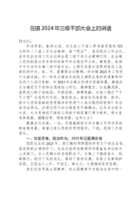 在镇2024年三级干部大会上的讲话同志们:岁序更新,春回大地。在全县上下深入贯彻落实党的XX大和和二十届二中全会精神、省两会、省市经济工作会议、省市农业农村工作会议和全县三级干部大会精神之际,在全镇人民刚刚度过欢乐祥和的春节和元宵佳节之时,镇党委、政府于今天召开全镇三级干部大会,主要任务是全面贯彻落实上面提到的中央、省、市、县重要会议精神,对全镇2023年工作进行全面总结,对一年来全镇各条战线上涌现出来的先进集体和先进个人进行表彰,对2024年全镇工作进行安排部署,激励动员全镇党员干部群众迅速收心归位、凝神聚力,以龙腾虎跃、鱼跃龙门的干劲闯劲,开拓创新、拼搏奉献,在深入践行千万工程走前列作示范。借此机会,我首先代表县委、政府,向今天受到表彰的先进集体和先进个人表示热烈的祝贺!向全体与会同志,并通过你们向全镇党员干部群众,以及舍小家为大家、大力支持我们做好工作的干部家属们拜个晚年,祝大家身体健康、福暖四季、顺遂安康、龙年大吉!根据会议安排,一会,还要就做好今年全镇工作进行具体的安排部署,希望大家认真抓好贯彻落实。下面,我讲三方面意见。一、攻坚克难,担当作为,2023年已圆满交卷刚刚过去的2023年,我们镇村两级组织和党员干部在县委、县政府的正确领导下,在各位县级包联领导和县直各单位的关心支持下,在人民群众的支持配合下,全镇上下接续奋斗、砥砺前行,经历了风雨洗礼,看到了美丽风景,取得了沉甸甸的收获,呈现出人心齐、干劲足、事业兴、大局稳的良好态势。我们扎实开展主题教育。把主题教育作为政治生活中的一件大事。高频率开展理论学习。镇党委和19个党支部共开展集体学习4次,领学、自学160余次,撰写讨论交流材料400余人次,开展讨论交流120人次,发放主题教育相关书目800余本,上门送学120人次,引导流动党员从通过学习强国、共产党员网等平台学习900余人次。高标准建言献策。聚焦全面贯彻落实党的XX大精神,重点围绕12个方面内容,组织党员深入群众听民意、访民情、解民事,共收集实施具有针对性和可操作性的意见建议32条。高质量推动发展。结合主题党日、新时代文明实践活动,组织开展志愿服务活动20余次。设立党员先锋岗88个,划分党员责任区87个,引导党员承诺践诺1845条,办理民生实事63件。高效率检视整改。聚焦党中央关心关注的问题、影响制约高质量发展的问题等6个重点问题,从小切口出发,建立问题清单,确定问题18个,督促18个科级干部对口认领,逐一销号,目前全部完成整改。督促19个党支部自查自改,完成问题整改25条。高水平建章立制。坚持边实践边总结,完善了机关值班制度、请销假制度以及各村环境卫生整治等制度。我们切实加强党的建设。我们坚持把加强理论学习作为基层党员的必修课,将学习贯彻XXX新时代中国特色社会主义思想贯穿始终,充分运用党委理论中心组学习、三会一课、支部主题党日、新时代文明实践活动等载体,系统学习党的XX大精神、二十届二中全会精神、XXX3次视察山西重要讲话重要指示精神、省市县两会等重要会议精神,不断强化政治理论学习,筑牢信念信仰之基。共开展党委中心组学习21次175篇、主题党日活动12次,各党支部开展三会一课680余次,开设党建微课堂12期。督促班子成员严格落实一岗双责,压实包村责任,督促包村干部对包联村的党建、乡村振兴、产业发展、安全生产等工作加强督导。完成83名村两委班子成员的届中分析研判工作,并根据各村存在问题加强整改。继续推进16个村党群服务中心规范化提升。高庄村按照一墙两站六室两中心标准化规范化提升党群服务中心,乡村示范村建设正在加紧进行,软弱涣散基层党组织整顿成效明显,支部软实力持续增强。七一开展一次书记讲党课、一次走访慰问等九个一系列活动,献礼中国共产党成立102周年。农村支部每月标准化完成12个月的党员积分评定,激发党员干事热情。拓宽后备干部选拔途径,进一步优化年龄和学历,共储备后备干部41名。严把发展党员入口关,发展党员7名,培养发展对象2名,同时严把组织关系转接关加强68名流动党员和46名年老体弱党员管理。村级集体经济30万元以上的8个(曹王岭、高城、贾村、上治、永乐、双泉、五马岭),16个村全部完成20万元的目标。把意识形态工作与党的建设紧密结合,切实把党的政治纪律和政治规矩摆在首要位置,严格落实意识形态责任制,召开意识形态分析研判会议4次,做到了四个同步。我们全力推进乡村振兴。深入贯彻县委、县政府两强三美部署要求,牢牢把巩固脱贫攻坚成果与乡村振兴有效衔接责任抓在手上,扛在肩上,积极学习借鉴千万工程经验做法。镇党委、政府加强统筹调度,每月及时下发《工作要点》进行指导;组织召开乡村振兴专题会、政策培训会26次,有效提升驻村队伍整体素质;强化督导检查,加强驻