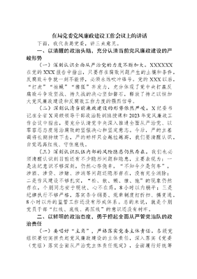 在局党委党风廉政建设工作会议上的讲话下面,我代表局党委,讲三点意见。一、以清醒的政治头脑,充分认清当前党风廉政建设的严峻形势(一)深刻认识全面从严治党的力度不断加大。XXXXXX在党的XXX报告中指出,只要存在腐败问题产生的土壤和条件,反腐败斗争就一刻不能停,必须永远吹冲锋号。党的XXX以后,打虎拍蝇猎狐齐发力,充分体现了党中央打赢反腐败斗争攻坚战、持久战的决心坚如磐石,释放了持之以恒加大党风廉政建设和反腐败工作力度的强烈信号。(二)深刻认清当前廉政建设的形势依然严峻。X纪委书记在全省X局级领导干部政治轮训班授课和2023年党风廉政工作会议中指出,要充分认清党中央深入推进全面从严治党、以零容忍态度惩治腐败的坚强决心和坚定意志。今后,严的主基调将长期持续下去,严的标杆只会越拉越高,我们要清醒认识,自觉远离红线、守住底线。(三)深刻认识队伍内部的风险隐患仍然存在。我们也必须清醒认识到目前还有不少隐形问题和隐患,主要表现为:一是法纪意识不够深刻,仍然心存侥幸,不知今夕是何年,涉酒、涉贷、涉赌、涉消等问题还隐形存在,没有完全消除;二是作风建设不够扎实,松、散、懒、推、拖的现象仍然存在,个别同志安于现状、心不在焉,8小时以内躺平;三是纪律执行不够严格,落实条令纲要、规章制度打折扣、搞变通,8小时以外的监管工作还没有形成体系。总的来说,就是个别党员干部红线、底线、高压线的意识还没有树牢。二、以鲜明的政治态度,勇于担起全面从严管党治队的政治责任(一)要唱好主角,严格落实党委主体责任。各级党组织要切实担负起党风廉政建设的主体责任,深入落实《党委(党组)落实全面从严治党主体责任规定》,全面履行好统筹协调、严明纪律、反腐倡廉、监督制约、宣传教育、示范带头等职责,以强烈的主责、主业、主角意识,把管党治队责任扛在肩上,推动以党建促队建,以队建促业务的良性循环,充分发挥各级党组织的战斗堡垒作用。(二)要当好头雁,夯实班子成员一岗双责。两级班子成员作为抓工作落实的主管领导,要把抓业务同管思想、强作风、严纪律、促廉洁统一起来。采取定期谈心谈话、风险研判等方式,管好关键人、管到关键处、管住关键事,做到普遍教育在前、个别防范在先,把问题解决在萌芽阶段,切实履行好监督职责,彰显领导干部的使命担当。(三)要做好卫士,全面压实纪委监督责任。局纪委要聚焦主责主业,协助党委加强党风廉政建设,让监督更加到位、反腐更加有力。要按照职责分工,延伸监督触角,创新监督方法,完善自我监督和日常监督机制,对发现苗头性、倾向性问题,及时咬咬耳朵、扯扯袖子,指出问题危害,帮助查找原因,提出整改要求,提供坚强有力的纪律监督保障。三、以坚定的政治担当,奋力开创党风廉政建设工作的新局面要从严抓实政治建设,自觉做到两个维护。讲政治不是抽象的,而是具体实在的,要体现在实际行动中,体现到领导干部的政治能力上。要狠抓班子自身建设,打造坚强过硬的领导核心。面对当前意识形态领域斗争尖锐的复杂情形,需要大家不断增强政治敏感、保持政治清醒,始终以组织的声音为声音、以上级的要求为要求,只有我们各级领导班子和领导干部自身正、自身硬、自身净,才能引领我们整X局伍清清爽爽、明明白白。要突出思想引领建设,筑牢防腐拒变根基。队伍各级要结合当地特色文化、名人典故,积极发掘先进典型的廉洁事迹,精心创造符合队伍实际、贴近消防生活的廉政文化品牌,结合清廉家风七个一主题系列活动,大力弘扬廉洁用权、廉洁治家的价值导向。要从严抓实作风建设,涵养良好政治生文可居文库——海量学习资料,手机电脑均可下载www.wenkeju.com态。队伍各级必须大处着眼、小处着手,落实落小、抓细抓实,坚持不懈把作风建设抓到底。要教育引导全体党员对党忠诚老实,坚定理想信念,牢记初心使命,正确对待权力,时刻自省自重,严守法纪法规,扣好廉洁从政的第一粒扣子。同志们,党风廉政建设工作不能浅尝辄止、半途松懈,只能勇毅前行、久久为功,让我们以XXX新时代中国特色社会主义思想为指导,在深刻理解两个确立,坚决做到两个维护中砥砺政治担当,在勤勉清廉、忠诚履责中行稳致远,为X事业高质量发展提供坚强的政治、纪律和作风保障。就讲这些,谢谢大家!文可居文库——海量学习资料,手机电脑均可下载www.wenkeju.com
