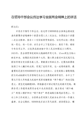 在领导干部会议传达学习全国两会精神上的讲话同志们:市委召开领导干部会议,传达学习XXXXXX在全国两会期间发表的重要讲话精神和十四届全国人大二次会议、全国政协十四届二次会议精神,结合××实际抓好贯彻落实,切实用以统一思想统一意志、统一行动,动员全市上下坚定信心、鼓足干劲,做好今年各项工作,以优异成绩迎接中华人民共和国成立75周年。2023年,是全面贯彻党的XX大精神的开局之年。以xxx同志为核心的党中央,统筹国内国际两个大局,凝心聚力推进中国式现代化团结带领全党全国各族人民,勇敢面对外部压力,克服内部困难取得了令人瞩目的成绩,实现了良好开局。这一成绩的取得,最重要的是因为有XXXXXX作为党中央的核心、全党的核心掌舵领航因为有xXXX新时代中国特色社会主义思想的科学指引。全市上下要从开局之年的重大成就中更深刻地领悟两个确立的决定性意义,更坚定地跟随XXX,积极推进中国式现代化的贵州实践,确保各项工作最终效果符合党中央决策意图,真正将对两个确立的衷心拥护和对两个维护的忠诚践行体现在思想上、行动上和工作成效上。全国两会是我国人民政治生活中的一件重大盛事。在会议期间,XXXXXX先后在江苏代表团、政协联组会、解放军和武警部队代表团上发表了重要讲话,深入总结了过去一年的工作,对发展新质生产力、全面深化改革、推动科技创新、加强生态保护、促进强军建设等方面提出了明确要求,进一步指明了推进中国式现代化的方向。我们要真正将思想和行动统一到XXXXXX重要讲话精神上来,将各方面力量凝聚到党中央决策部署的落实上。全国两会作为中华人民共和国成立75周年和实现十四五规划目标任务关键之年的一次重要会议,在这次会议上,XXXXXX与代表委员共同商讨国家大计,发表了多次重要讲话。他站在党和国家事业发展的全局上,深刻阐明了与中国式现代化建设相关的重大问题,进一步为全面推进中国式现代化、实现强国建设和民族复兴的伟大事业指明了前进方向和根本遵循。我们要将学习贯彻全国两会精神作为当前一项重要的政治任务,真正将思想和行动统一到党中央的决策部署上来。我们要深刻领会开局之年我国经济社会发展取得的重大成就,更加自觉地拥护两个确立做到两个维护;深刻领会国际国内形势的发展变化,更加自觉地增强信心和底气、鼓足干劲和斗志;深刻领会今年经济社会发展的总体要求、政策取向和主要任务,更加自觉地抓住重大机遇、善用政策;深刻领会发展社会主义民主政治的重大要求,更加自觉地发挥制度优势、提升治理效能;深刻领会推进全面依法文可居文库——海量学习资料,手机电脑下载www.wenkeju.com治国的重要部署,更加自觉地全面厉行法治、建设法治××。同志们,今年的任务既艰巨又繁重,我们要全面贯彻党中央的决策部署,扎实推动我市高质量发展。我们要切实抓好工作落实,认真贯彻全国两会精神,贯彻市委十一届六次全会暨市委经济工作会议、省两会的部署,坚守两个确保的目标,持续推进十大战略、统筹推进十大建设,为实现各项目标任务扎实前进。我们要坚持稳中求进的工作总基调,着力推动高质量发展,在稳定的基础上夯实发展的根基,稳定经济的基本盘、社会的安全大局和民生的保障底线;同时,加强推动发展的支撑,抓住政策机遇,解决堵点难点,扩大有效需求,努力确保一季度的开门红,推动经济实现质的有效提升和量的合理增长。一要把高质量发展作为新时代硬道理。深化对新时代生产力精髓的理解,充分利用资源的天然优势,依托既有的产业基础并强化科技创新的动力。通过全面升级传统产业、扩大新兴产业规模及培养未来产业,推动产业向高端化、智能化、环保化转型。以稳固和提升经济持续复苏的趋势为根本出发点,将适应地域特色的新型生产力发展作为关键着力点。通过加强创新驱动和产业支撑,实施双转型战略和四轮驱动,加固三农基础和民生保障,扩大科技创新的三支柱结构,推进特定产业链群的培育,加快实施关键项目建设,深化数字化和绿色低碳转型,快文可居文库——海量学习资料,手机电脑下载www.wenkeju.com速建立现代化农业产业体系,确保在发展进程中提高民生保障水平,实现经济发展的高质量、高效益、高速度。二要全面深化改革。将全国两会精神的学习、宣传和实施转化为实际行动和具体工作。定下全年的目标任务,确保全国两会的决策部署得到有效实施,全力推动经济增长和建设工作,坚持不懈地追求高品质发展,巩固和加强经济持续复苏的良好势头,以实现第一季度良好开局为全年目标的实现打下坚实基础。进一步深化改革开放,通过项目化、清单化、具体化的方法确保《启动综合改革实施方案》的落实,分类推动关键领域的改革任务,以东南亚市场为重点扩大对外开放。紧跟党中央的改革部署,结合地方实际,制定进一步深化改革的具体方案,确保各项改革措施得到无懈执行。