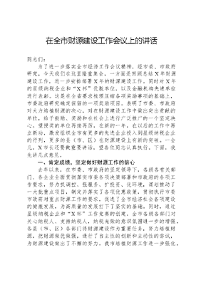 在全市财源建设工作会议上的讲话同志们:为了进一步落实全市经济工作会议精神,经市委、市政府研究,今天我们在这里隆重集会,一方面是回顾总结X年财源建设工作,进一步安排部署X年的财源建设工作。同时对X年的星级纳税企业和X杯优胜单位,以及金融机构先进单位进行表彰。这是在全省要求梳理压缩各项奖励事项的基础上,市委政府研究确定保留的一项奖励项目。表明了市委、市政府对大力培植财源的决心,对在财源建设工作中做出突出贡献的单位,给予鼓励、奖励和在社会上进行广泛推广的一个坚定决心。望授奖的单位再接再厉,在新的一年,在以后的工作中再立新功,激发组织全市有更多的先进企业投入到星级纳税企业的行列,更多的县(市、区)在财源建设上有新的突破。一会儿,X市长还要做重要讲话,望各位同志认真执行。下面,我先讲几点意见。一、肯定成绩,坚定做好财源工作的信心去年以来,在市委、市政府的坚定领导下,各级各有关部门、各企业全面贯彻落实市委各项决策部署和市政府的各项工作要求,努力抓调控、强服务、扩投资、优环境,谋划推动了一大批重点项目,制定并落实了各项优惠政策,贯彻执行市委市政府对重点财源工作的要求,促进了全市经济社会各项建设的健康发展,为高质量的发展打下了坚实的基础。同时,通过星级纳税企业和X杯工作竞赛的创建,全市各级各部门对关心纳税人、支持纳税人,纳税光荣的意识氛围进一步的增强,各县(市、区)各部门将财源建设作为重要任务,努力培植财源,把财源做优做强,进行了自主性的创新和主动性的尝试,为财源建设做出了不懈的努力。我市培植财源工作进一步强化,综合实力进一步增强。X年度全年一般公共预算收入完成X亿元,总量居全省的第X位,同比增长X%,税比达到X%,税比居全省第X位,有力地促进全市经济社会的发展。我市财源建设呈现出以下特点:一是星级纳税企业稳中有升。在过去的X年,经济下行压力巨大、国际环境变幻莫测、各项优惠政策不断出台,在这样的对比下,我市的星级纳税企业在去年X家的基础上,又增加了几家,实属不容易。这是在中央大规模减费降税等政策经济环境下取得的,这是全市各企业争先创优的结果,也是全市各级努力培植财源亲商优商的结果。因为星级企业的巩固提升,使财政收入质量进一步得到了优化。二是全市关心纳税人、支持企业发展、亲商爱商的氛围进一步浓厚。全社会支持企业发展的氛围营造,加上各项支持措施不断出台,各县区都陆续实施奖励政策,弘扬纳税光荣,支持企业发展,争创先进,纳税光荣的氛围,以及形势都在不断的强化优化。三是全市的发展环境进一步优化。去年以来,市委、市政府着力推动干部作风大整顿,通过弘扬先进,批评教育落后,通过集中整治使全市干部作风、工作作风进一步得到加强,不断的推动深化放管服改革,加快推进了一次办妥改革,全市创新了4+1+X综合窗口模式,那就是推动不动产登记、投资审批登记、商事登记、劳动人事服务四个综合窗口和便民服务综合受理窗口,形成了多项平台合一的一窗受理、分责办理、集中审批的服务模式。进一步激发了市场创新的活力,全市新增市场主体X万户,增长X%,使财源建设有了新的支点。四是金融支持进一步提升。X年全市金融部门存款金额达到X亿元,贷款金额达到X亿元,当年新增贷款X亿元,同时文可居文库——海量学习资料,手机电脑均可下载www.wenkeju.com化解不良贷款X亿元,债转股X亿元。其中值得一提的是X行为X集团公司企业债转股X亿元,有利地优化了企业的贷款、负债结构,进一步增强了企业的竞争力。X年全市金融企业的收入增加X亿元,地方税收留成达到了X亿元,占到了全市一般预算收入的X%,成为全市财源一个新的增长点。五是财政保障进一步增强。全市的财政支出达到了X亿元,这是在我们一般预算收入完成X亿元的基础上达到的,这里面集聚着在座诸位同志齐心协力和心血汗水。这里面既有盘活基金收入,做活存量收入,加大一般预算收入,也有积极争取上级资金和项目支持,加大争取上级转移支出,有利地保障了全市的经济社会发展。其中县级三保支出达到了整个县(市、区)财政收入的X%,确保了各项工作的运转。在看到成绩的同时,我们要清楚的认识到当前存在的一些问题。首先,国际环境进一步复杂化。大家关注的X贸易战已经影响到我市进出口贸易,对输出、对外贸、对相关产业已经形成压力。第二是大中商品价格大幅波动,给我市深化财源建设、经济运行带来了一些不确定性因素。第三是全市财源结构过于集中。全市X家星级纳税企业占全市限额以上企业的X%,税收总额占到了全市税收总额的近X%,其中X公司占到了星级纳税企业税额X%,这也就是我们在广开财源上有很大的工作量需要去投入,需要去推动。同时,县级财源建设骨干企业支撑还十分薄弱,全市的县(市、区)一般公共预算收入的平均值是X亿元,这是含X,如果不含汝州我市是X亿元。全省县市级