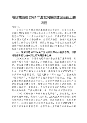 在财政系统2024年度党风廉政建设会议上的讲话同志们:今天召开全X财政党风廉政建设工作会议,主要任务是:坚持以XXX新时代中国特色社会主义思想为指导,深入学习贯彻党的XXX、二十届中央纪委三次全会、X届省纪委X次全会和X届X纪委X次全会精神,全面落实全国、全省财政党风廉政建设工作会议各项部署,回顾总结2023年全X财政全面从严治党和党风廉政建设工作,安排部署2024年重点工作任务。下面我代表财政局党组作工作报告。一、学深悟透XXXXXX关于党的自我革命的重要思想,切实把思想和行动统一到上级决策部署上来XXXXXX在二十届中央纪委按次全会发表了重要讲话,从统筹两个大局的高度,对持续发力、纵深推进全面从严治党、党风廉政建设和反腐败斗争作出战略部署,为深入推进新时代党的建设新的伟大工程提供了根本遵循。X届省纪委X次全会、X届X纪委X次全会强调,要学深悟透XXXXXX关于自我革命的重要思想,把坚定拥护两个确立、坚决做到两个维护,体现到勇于自我革命的实际行动上。全国、全省财政党风廉政建设工作会议,全面分析财政部门全面从严治党和党风廉政建设形势,对重点工作任务进行了详细部署。我们要认真学习、深刻领会,更加坚定自觉地把思想和行动统一到中央和省委、X委决策部署上来,不折不扣抓好贯彻落实。(一)深刻领会为什么要自我革命,居安思危,进一步强化使命担当。党的十八大以来,XXXXXX带领全党以前所未有的决心力度推进全面从严治党,创造性地提出一系列具有原创性、标志性的新理念新思想新战略,形成XXXXXX关于党的自我革命的重要思想,指引百年大党开辟了自我革命的新境界。只有敢于自我革命,才能防止祸起萧墙,只有坚持自我革命,才能确保党永远不变质不变色不变味,确保党始终成为中国特色社会主义事业坚强领导核心。全X财政系统党员干部要深刻领悟这一重要思想的强大真理力量、非凡实践力量、深厚精神力量,在真学真信真用、深化内化转化上下功夫,以刀刃向内的勇气,持续改造主观世界,不断淬炼党性修养,始终坚定理想信念。(二)深刻领会为什么能自我革命,保持定力,进一步增强信心底气。XXXXXX关于党的自我革命的重要思想,深刻回答了我们党为什么能自我革命的重大问题,强调越是长期执政,越不能丧失自我革命精神。党的十八大以来,我们党外靠发展人民民主、接受人民监督,内靠全面从严治党、推进自我革命,取得了历史性、开创性成就,实践充分证明,自我革命这条路完全行得通、十分有必要,只有这样才能走得远。全X财政系统党员干部要清醒认识自我革命是一场长期的、艰巨的任务,必须永葆自我革命的战略定力,保持忠诚干净担当的政治本色,始终做到初心如磐、使命在肩、永远奋斗。(三)深刻领会怎样推进自我革命,细照笃行,进一步提高行动自觉。XXXXXX明确提出并深刻阐述了推进自我革命九个以的实践要求,回答了我们党怎样推进自我革命的重大问题,为我们党在新征程上依靠自身力量解决自身问题提供了强大思想武器、科学行动指南。全X财政系统党员干部要紧密结合财政工作实际,抓住根本、聚焦关键、突出重点,推动财政系统党的建设各方面有机衔接、协调联动,引领保障财政工作不断迈上新的台阶。二、深入贯彻全面从严治党方针,为财政事业发展提供坚强的政治保障2023年是全面贯彻党的XXX精神的开局之年,也是三年新冠疫情防控转段后经济恢复发展的一年。面对复杂严峻形势,在X委、X政府的坚强领导下,X财政局党组以政治建设为统文可居文库——海量学习资料,手机电脑均可下载www.wenkeju.com领,以担当实干为导向,以全面从严为标尺,深化干部作风建设,切实履行党风廉政建设主体责任,持续构建风清气正政治生态,全面从严治党和党风廉政建设工作取得了新成效。(一)扎实开展主题教育,坚持不懈用党的创新理论指导实践。将抓好主题教育作为一项重大政治任务,聚焦主题教育的目标要求、根本任务和方法举措,研究制定主题教育、理论学习和大兴调查研究实施方案X个,举办党组理论学习中心组读书班X期、专题研讨X次,班子成员和基层党组织书记讲党课或分享学习体会累计X次,选取X个班子集体调研课题,帮助企业、群众解决了财政补贴资金发放不到位、企业资金压力大、尼龙建投厂房建设等难题。坚持读原著学原文悟原理,先后为全局党员干部发放主题教育学习用书X余册,通过财政大讲堂、辅导报告、视频讲座、研讨交流、联学联建等方式,培训教育党员干部累计X余人次。组织支部书记和先进党员代表赴大别山干部学院,开展为期一周的集中学习培训,引导带动财政系统党员干部自觉运用党的创新理论凝心铸魂、武装头脑、推动工作。(二)强化政治机关定位,不折不扣落实上级决策部署。严格落实第一议题制度,全年共开展中心组理论学习X次,把XXXXXX关于财政工作的重要论述作为指针、指南、