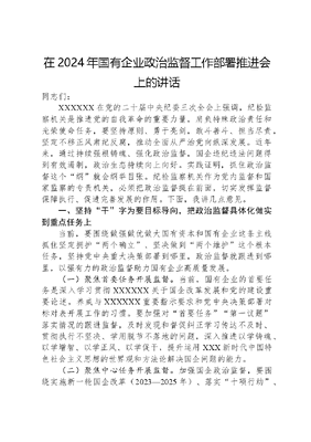 在2024年国有企业政治监督工作部署推进会上的讲话同志们:XXXXXX在党的二十届中央纪委三次全会上强调,纪检监察机关是推进党的自我革命的重要力量,肩负特殊政治责任和光荣使命任务,要坚持原则、勇于亮剑,敢斗善斗、担当尽责,坚定不移正风肃纪反腐,推动全面从严治党向纵深发展。近年来,通过持续强根铸魂、强化政治监督,国企违纪违法问题得到有效遏制,政治生态持续向上向好。实践证明,抓住政治监督这个纲就会纲举目张。纪检监察机关作为党内监督和国家监察的专责机关,必须把政治监督挺在前面,切实发挥监督保障执行、促进完善发展的作用。下面,我讲几点意见。一、坚持干字为要目标导向,把政治监督具体化做实到重点任务上当前,要围绕做强做优做大国有资本和国有企业这条主线抓住坚定拥护两个确立、坚决做到两个维护这个根本任务,坚持党中央重大决策部署到哪里,政治监督就跟进到哪里,以强有力的政治监督助力国有企业高质量发展。(一)聚焦首要任务开展监督。当前,国有企业的首要任务是深入学习贯彻XXXXXX关于国企改革发展和党的建设重要论述,养成与XXXXXX重要指示要求和党中央决策部署对标对表开展工作的习惯。要加强对首要任务第一议题落实情况的跟进监督,及时发现和督促纠正学习传达不及时、贯彻执行不坚决、学用脱节不落地的问题,深入推进以学铸魂、以学增智、以学正风、以学促干,提升运用XXX新时代中国特色社会主义思想的世界观和方法论解决国企问题的能力。(二)聚焦中心任务开展监督。加强国企政治监督,要围绕实施新一轮国企改革(2023—2025年)、落实十项行动、推进盘活存量、培育增量、提升质量来展开。通过加强监督检查,及时发现和督促纠正偏离改革方向、脱离企业实际、游离战略全局的问题,促进国企提高核心竞争力、增强核心功能、激发活力动力;及时发现和督促纠正服务京津冀协同发展不主动、制造业转型升级不力等问题,促进国企加快把发展愿景变成行动场景,以一域之为更好服务全局发展;及时发现和督促纠正国企土地房产闲置、新动能培育乏力等问题,促进盘活提升一批存量资产资源、培育发展一批新的经济增长点、赋能振兴一批国有老字号品牌。(三)聚焦党建任务开展监督。XXXXXX指出,坚持党的领导、加强党的建设,是国有企业的根和魂。加强国有企业政治监督,要重点监督全国国有企业党的建设工作会议精神落实情况,及时发现和督促纠正党组织前置研究重大经营管理事项不落实、中国特色现代企业制度有形无神、党管干部原则与发挥市场机制作用结合不紧密、党建责任与经营责任衔接不畅通、党建工作与生产经营不融合等问题,着力整治国有参股企业、混合所有制企业、低效无效企业、老平台企业党的领导弱化、党的建设缺失,成为失控失管政治之因的问题,深入推进国有企业强根铸魂,以高质量党建引导保障高质量发展。(四)聚焦职责任务开展监督。XXXXXX多次强调,全面从严治党,党委要认真履行主体责任。推进政治监督具体化,重点要围绕全面从严治党责任落实情况加强监督检查。要加强对国企全面从严治党、净化政治生态、落实巡视整改等情况的监督检查,及时发现和督促纠正党委主体责任、党委书记第一责任人责任和班子成员一岗双责履行不力的问题,推动构建全面从严治党体系;及时发现和督促纠正党内政治生活政治性、时代性、原则性、战斗性不强,斗争精神不足,好人主义倾向等问题,破立并举持续修复净化政治生态;及时发现和督促纠正整改不力、追责问责软的问题,持续巩固全面从严治党文可居文库——海量学习资料,手机电脑均可下载www.wenkeju.com战略成果。对内外勾连、靠企吃企、关联交易、利益输送等问题要坚决予以查处。二、坚持抓住要害问题导向,把政治监督精准化落实到关键人关键事关键处上XXXXXX强调,政治纪律和政治规矩不是抽象的,是由具体的人和事构成,必须看行动、见实效。加强国有企业政治监督,要精准施策,见人、见事、见行、见效。(一)紧盯关键人强化监督。重点要加强对关键少数、关键岗位人员和外派人员的监督。在对关键少数监督上,突出对一把手的监督,通过实行上级一把手对下级一把手政治谈话制度、纪委列席董事会和总经理办公会并与职业经理人定期恳谈等制度,促进企业领导班子特别是一把手切实履行管党治党政治责任,认真执行民主集中制,依规依法履职用权。在关键岗位人员监督上,突出企业中层这个重点,督促将廉政要求嵌入制度规定、融入业务流程,对上倒逼领导班子成员抓好分管领域的廉政建设,对下促进业务监督穿透到各级次企业,最大限度防范廉政风险。在对外派人员监督上,及时发现和督促纠正外派人员利用职权徇私舞弊、损害企业和股东利益、隐瞒个人利益冲突和其他有碍任职事项而违规任职问题,坚决防止和纠正外部董事不对发表意见担责、外派财务总监发现问题