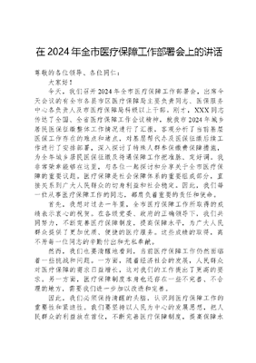在2024年全市医疗保障工作部署会上的讲话尊敬的各位领导、各位同仁:大家好!今天,我们召开2024年全市医疗保障工作部署会,出席今天会议的有全市各县市区医疗保障局主要负责同志、医保服务中心各负责人及市医疗保障局科级以上干部。刚才,XXX同志传达了全国、全省医疗保障工作会议精神,就我市2024年城乡居民医保征缴整体工作情况进行了汇报,客观分析了当前基层医保工作存在的难点和堵点,对基层帮代办及医保征缴后续工作进行了安排部署,深入探讨了特殊人群参保缴费保障措施,为全年城乡居民医保征缴及待遇保障工作把准脉、定好调。我非常荣幸能够在这里,与各位一起探讨和分享关于全市医疗保障的重要议题。医疗保障是社会保障体系的重要组成部分,直接关系到广大人民群众的切身利益和社会稳定。因此,我们每一位从事医疗保障工作的同志,都肩负着重要的责任和使命。首先,我想对过去一年里,全市医疗保障工作所取得的成绩表示衷心的祝贺。在各级党委、政府的正确领导下,我们共同努力,不断完善医疗保障制度,提高保障水平,为广大人民群众提供了更加优质、便捷的医疗服务。这些成绩的取得,离不开每一位同志的辛勤付出和无私奉献。然而,我们也要清醒地看到,当前医疗保障工作仍然面临着一些挑战和问题。一方面,随着经济社会的发展,人民群众对医疗保障的需求日益增长,这对我们的工作提出了更高的要求。另一方面,医疗保障制度本身也还存在一些不完善、不合理的地方,需要我们进一步加以改进和完善。因此,我们必须保持清醒的头脑,认识到医疗保障工作的重要性和紧迫性。我们要坚持以人民为中心的发展思想,把人民群众的利益放在首位,不断完善医疗保障制度,提高保障水平,让人民群众真正享受到优质、便捷的医疗服务。一是责任上肩、工作上心,齐心协力抓好医保政策落实。要切实将保障老百姓医保权益职责扛在肩上,落实各项工作举措,解决老百姓参保及报销难题,以实绩实效提升老百姓满意度。二是破难题、开新局,确保全年特殊人群参保缴费工作顺利进行。要客观分析并正面应对特殊人群参保缴费问题,在权利下放基层中抓住有利时机做好破题开局。要强大有效抓好全民参保工作,强化组织动员、宣传发动和部门协同,充分发挥乡贤、机关党员干部、村干部示范带头效应,采取一切有效措施提高参保率,确保2024年参保任务圆满收官三是优服务、提水平,统筹推进基层帮代办工作。认真落实省政府真抓实干督查激励机制,每月制定清单提醒,按照月初任务下发、月中指导推进、月末梳理反馈,以实干确保基层帮代办工作有提升、见成效。为了实现这一目标,我们需要采取一系列措施。首先,我们要加强制度建设,完善医疗保障法律体系,为医疗保障工作的顺利开展提供有力的法制保障。其次,我们要加大投入力度,提高医疗保障资金的使用效率,确保每一分钱都用到刀刃上。同时,我们还要加强医疗队伍建设,提高医务人员的专业素养和服务水平,为人民群众提供更加优质的医疗服务。此外,我们还要注重创新,不断探索新的医疗保障模式和服务方式。例如,我们可以通过推广互联网+医疗保障模式,让人民群众在家就能享受到便捷的医疗服务;我们还可以通过开展健康教育和健康促进活动,提高人民群众的健康素养和自我保健能力。最后,我想强调的是,全市医疗保障工作是一项系统工程需要各级党委、政府、社会各界以及广大医务人员的共同努力。我们要加强协作配合,形成工作合力,共同推动全市医疗保障事业不断向前发展。在此,我呼吁大家要继续保持高昂的工作热情和饱满的工作干劲,为全市医疗保障事业的繁荣发展贡献自己的力量。我相信,在大家的共同努力下,我们一定能够开创全市医疗保障文可居文库——海量学习资料,手机电脑均可下载www.wenkeju.com工作的新局面,为人民群众提供更加优质、高效的医疗服务。谢谢大家!文可居文库——海量学习资料,手机电脑均可下载www.wenkeju.com