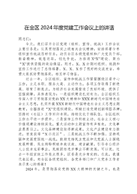 在全区2024年度党建工作会议上的讲话同志们:今天,我们召开全区党建(组织、宣传、统战)工作会议主要任务是:认真贯彻落实上级有关会议精神,安排部署今年组织宣传统战目标任务,动员全区各级党组织和广大党员干部,振奋精神,锐意进取,创先争优,为推进XX建设、聚力X提供坚强的政治保证。刚才,X、X分别对组织、统战和宣传工作进行了总结部署,X、X、X作了很好的交流发言,希望大家抓好贯彻落实,相互学习借鉴。过去一年,全区组织、宣传和统战工作紧紧围绕区委中心工作,立足本职、服务大局、主动作为,各项工作取得了新进展、培育了新亮点,为经济社会发展营造了良好环境、提供了坚强保障。具体表现为:一是组织建设扎实有为。全区组织工作深入学习贯彻落实党的XX大精神和XXX新时代中国特色社会主义思想,扎实开展XXX新时代中国特色社会主义思想主题教育,全面推进X党组织建设,积极打造党建创新项目品牌,坚持村(社区)工作回归本职,持续优化干部队伍,全区组织工作水平进一步提升。二是宣传工作积极主动。社会主义核心价值观建设持续深化,重大活动和主题宣传有声有色,文化事业蒸蒸日上,文化品牌建设取得新成果,文化产业建设有力推进,首度获得X示范区。三是统战工作不断加强。坚持巩固和发展爱国统一战线,鼓励支持民主党派和无党派人士围绕发展所需、民生所盼积极参政议政、建言献策,引导非公经济人士投身光彩事业,民族团结进步事业不断发展。可以说,过去一年组宣统工作亮点很多,区委是充分肯定的。在此,我谨代表区委,向全区各级党组织、各党务部门和广大党务工作者表示衷心的感谢!2024年,是贯彻落实党的XX大精神的关键之年,也是十四五目标任务全面落地的攻坚之年。能否推动X各项事业取得突破性进展,关键取决于党的领导和党的建设,取决于我们有没有一种干事创业的浓厚氛围、一支素质过硬的干部队伍、一个坚强稳固的基层组织基础、一股团结奋进的强大合力。下面,我再简单强调五点意见:一、提高认识,把握要求,切实增强责任感和使命感新的形势对组织、宣传、统战等党建工作提出了新的更高要求,我们要强化政治意识、大局意识,切实把握三个要求。一要以党的XX大精神为指导。学习贯彻党的XX大精神是今后一段时期首要的政治任务,做好组织、宣传、统战工作都离不开XX大精神的指导。XX大报告对加强党的建设有专门的论述,要求坚持和加强党的全面领导,坚持党要管党、全面从严治党,以党的政治建设为统领,坚决拥护两个确立,坚决做到两个维护不断增强四个意识和四个自信。我们必须以不断增强党的政治领导力、思想引领力、群众组织力、社会号召力为落脚点,才能深入推进党的建设新的伟大工程。二要以发展为中心开展工作。不论是组织、宣传,还是统战工作,都要紧紧围绕经济社会发展来开展工作。X发展进入新的阶段,需要更坚强的组织保障、更振奋的精神活力和更强大的社会凝聚力。区委X届X次全会明确了规划建设X、加快实施X计划,我们正不断增强推进力度。X发展迎来了天时、地利、人和,加快发展的态势已经形成。当前,我们正在持续引进一批带动力强的重大产业项目,一批X市的重大城市功能配套项目也落户我区,核心区建设正在加快推进。我们要始终紧扣发展形势和发展任务,充分调动全区党员干部群众的积极性、主动性、创造性,把力量凝聚到X发展的全局和中心上来,加快推动我区发展更上新的台阶。三要抓好基层基础工作。组宣统工作都要注意抓好基层基础。宣传党的主张、贯彻各级决定、团结动员群众、推动改革发展,都离不开基层组织这一堡垒。要以提升组织力为重点,突出政治功能,以支部为抓手,推进党的基层组织设置和活动方式创新,深化加强基层社会综合服务管理。要坚持深入基层、贴近群众、务实高效的工作方法,确保X加速发展的高楼,崛起于坚实广大的基层基础之上。二、组织工作要突出选人用人、固本强基,为全区发展提供坚强保证加快推进X发展,关键要靠各级党政组织来实施,靠各级干部来推动,靠优秀人才来支撑。一要扎实推进高素质专业化干部队伍建设。要认真落实好干部标准,紧扣高素质专业化要求,坚持以对党忠诚选忠诚于党的人,坚持以事业为上选担当干事的人,坚持以扎实作风选作风扎实的人,围绕全区中心工作,把干过什么、干成什么管过什么、管得如何作为干部选拔任用依据,通盘考虑使用各方面、各年龄段的干部,精准科学选人用人,形成干部心无旁骛一心干事的氛围。要提高干部专业素养,抓好干部教育培训三年行动计划,从提升干部创新素养、能力素质和X发展实际出发,增强教育培训的针对性和精准度。要通过实施X干部队伍建设三年行动计划,开设X课堂双向挂职和选派好第一书记,建立干部发现储备、培养锻炼、选拔使用和管理监督全链条机制。要强化干部日常严管,建立健全鼓励激励、容错纠错、能上能下三项机制,明确干部上