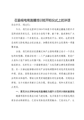 在县级电商直播培训班开班仪式上的讲话各位学员,同志们:今天,我们在这里举行2024年XX县乡村电商直播能力提升示范培训班开班仪式,旨在为全县想干事、敢干事、能成事的广大乡村青年提供一个自我创业、追求梦想的平台,同时,也是县委县政府支持电商企业创业就业,加强农村经济社会发展的一项重要举措。当前,我们的经济发展模式和产业结构调整正处于一个历史性的转型期,是推动农村一二三产业融合发展的关键期,更是广大青年才俊干事创业的窗口期,乡村发展是全县经济发展的重要组成部分,农村创业一方面能够满足广大农民群众增收致富的期望,另一方面也能够推动农村产业结构调整和农村经济发展转型升级。因此,县委县政府决定举办这个培训班,希望通过提供专业的培训和指导,帮助大家更好地把握农村创业机遇,实现创业梦想,为乡村振兴贡献自己的力量。借此机会,我和大家交流三点意见。一、要充分认识举办电商直播能力提升示范培训班的重要性随着网络和信息技术的飞速发展,电子商务作为网络化现代商务活动的新形态,已经与实体经济深度融合,已经对生产、生活、消费等方面都带来了深刻的影响,并已成为推动区域特色经济发展的强大引擎,电子商务产业已经成为新的经济增长点。开展电商直播能力提升培训,对抢抓互联网+机遇,加快XX电商产业发展,促进大众创业、万众创新必将起到积极的推动作用(一)开展电商直播能力提升培训,是抢抓互联网+商机,培育新的经济增长点的现实需要。近年来,电子商务产业迅速发展,以互联网+为载体的电子商务已经逐步成为我国经济增长的重要引擎和动力。据国家统计局最新统计结果显示,2023年,全国直播电商市场规模达4.56万亿元,同比增长30.44%,数据显示,直播电商平台在2023年双十一第一波活动的销售额为989亿元,同比上升10%。从以上数据不难看出,电商蕴含的无限商机、巨大潜力、广阔前景,是传统门店经营模式无法比拟的。目前,电子商务在全国各地如雨后春笋,蓬勃发展已经成为群众日常生活不可或缺的消费渠道。对XX而言,农特产品品种较多,但规模不大、分布零散,非常适宜发展电子商务,我们必须抓住当前持续升温的互联网+发展机遇,大抓电商产业,大力培育电商人才,让更多的同志投入到电商创业,电商产业才能成为支撑县域经济新的经济增长点。对我们在座的学员来说,只有提高对电子商务的思想认识,更新观念,树立互联网思维,迅速搭上互联网这列快车,才能在电商产业道路上走得更稳,走得更远。(二)开展电商直播能力提升培训,是推进数商兴农和互联网+农产品出村进城工程的重要举措。为了推动乡村电商高质量发展,县委县政府制定了具体方案,明确了工作目标和措施,计划到2024年底,建立以县城为核心的电子商务产业集聚区,培育2个市级电子商务示范乡镇、10个市级电子商务示范村(社区)。每个行政村培育1个直播团队。每个乡镇每年开展1至2期可持续性的节庆+农特产+直播活动。到2025年底,打造1个县级美食+娱乐+直播的综合性夜间集市,规模以上企业电子商务应用普及率达90%以上,中小微企业、外贸企业电子商务应用普及率达70%以上,农村专业合作社电子商务应用率提升30%以上。为实现这些目标,县乡两级将在盘活各类资源和人才引进、政策帮扶、后续服务等多方面支持助力电商发展。同志们,蓝图已绘就,接下来就需要我们在座的各位积极探索、深入研究、广泛借鉴、脚踏实地地出一条具有蹚XX特色的电商康庄大道。(三)开展电商直播能力提升培训,是推广总结XX电子商务前期成功经验,促进产业健康发展的重要举措。2023年,全县实现电商网络交易额26.1亿元,其中:网络零售额12亿元;农村网络零售额4.6亿元;农产品网络零售额2.8亿元。目前,全县续存电商个体443个,续存电商企业175户。去年,我们举办了泼水节促销活动、芒果节等电商+节庆活动,参加了5.19腾冲全国旅游节展会和XX小粒咖啡节展会,形成的抖音播放破1000万,做到XX地区人气景点第1名持续了一个月的热度。雄关漫道真如铁,而今迈步从头越,这是我们前期取得的成绩,更是今后一段时期XX电商产业的起点。我们要借力泼水节、芒果节、稻花鱼节等文创活动,开展直播宣传活动,把人流吸引进来,有效推动全县文旅、农旅、餐饮等行业服务能力和水平的提升,推进直播电商赋能线下实体经济发展,探索发展线上引流+线下消费网络直播+本地生活等模式,构建多种消费新场景。为此,我们举办培训班,并邀请经验丰富的老师为大家授课,让更多的同志会上网、会开店、会营销,掌握电商直播技能,提高直播水平,形成多元化发展的良好局面。(四)开展电商直播能力提升培训,是解决农特产品销售难利润低,加快农业特色产业发展的有效途径。近年来,XX特色产业取得了积极进步,保持了良好发展态势,产业规模不断壮大。但是,产品销售难、利润低等