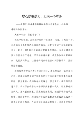 尽心尽责尽力,力求一个不少——在2023年春季学期控辍保学工作家长会上的讲话尊敬的各位家长:大家中午好,你们辛苦了!我是学校校长,是凯里学院的一名老师,同时,与大家一样,也是家长(既是我的小家庭的家长,还是五中这个大家庭的家长)。刚才,XXX等先后就我校控辍保学情况、有关法律法规及工作要求作了通报、学习和安排部署。希望各位家长积极配合,我们共同努力,让所有的还在都能安心到学校学习、更好地接受教育。我担任学校校长已有4个月时间了,走上校长这一工作岗位之后,我真切地感受到了控辍保学对于农村学校的重要性和艰巨性。因为重要,我不敢有丝毫懈怠;因为艰巨,我不得不勤恳工作。农村学生的普九水平不仅关系着一代人,而且影响到几代人,更关联到国家、民族的长远发展。控辍保学如此举足轻重,但对于知识、经济相对落后的农村来说要圆满完成这一任务又是难上加难。今天来到会议现场的家长,也都是我校不稳定学生的家长,召集大家来的目的,主要就是共同商议如何做好学生安全教育、学习生活的工作。下面,我就结合学校实际,与各位家长交流谈三个方面的问题:一、学校控辍保学工作开展情况第一,高度重视,加强领导。保障每个学生接受并完成九年义务教育是政府的责任,也是学校的责任,更是校长的职责。学校成立以来,县委县政府高度重视我们学校控辍保学工作。在教育科技局的指导下,我校加强对各乡镇、街道的沟通交流,每学期都会动员各方力量,宣传《义务教育法》《未成年人保护法》等法律法规,安排学校领导、班主任、任课教师进村入户,动员学生返校。同时,为加强对控辍保学工作的管理,我校成立了由校长任组长的控辍工作领导小组,细化领导分工,使每个领导的工作都与控辍挂钩,并将该组织长期化、固定化,经常召开班子会议,及时自查、讨论、汇报控辍工作。并安排值日教师负责日日清查各班出席人数,天天统计汇总,督促全体教师尤其是班主任时刻不忘开展保学工作,如发现某班有辍学迹象或个别学生有厌学倾向,要求班主任和学科教师马上进行家访,以最快的速度及时进行规劝、教育,使学生返校,力求把学生的辍学控制在萌芽状态。第二,明确责任,规范管理。为了抓好此项工作,学校组织建立健全了《学校控辍保学工作实施方案》,并且学校与领导班子成员、班主任、教师层层签订控辍保学责任书。我们还分解量化控辍目标,责任落实到人,实行校长包校,行政人员包班、班主任和科任教师包学生,层层落实责任。第三,多措并举、力求实效。加大宣传力度,提高社会共识。控辍的首要任务是纠正学生家长的错误认识。为此,学校政教处处、班主任充分利用大型集会、国旗下讲话等媒介开展丰富多彩的普九教育活动。推行课程改革,顺应学生需求。控辍的治本方法是解决学生的厌学问题。为解决这一问题,我们采取了以下措施:一是从生命视角管理学生。在具体工作中,从学校领导到教师完全抛弃那种师道尊严的思想,更多考虑的是学生在想什么,学生需要什么,从思想上到行动上全力服务学生,做到爱生如子。二是充分发挥学生主体作用。在教学中,实现师生良性互动,促进教学方式的变革和教师教学水平的提高。学校办学水平的提高,有力的保证了在校生巩固率,吸引学生留在学。搞活校园文化,吸引学生兴趣。控辍的有效途径是全面发展学生。因此,我校努力采取切实措施,办特色学校,丰富学生课余文化生活,使每一个学生都有用武之地,都能体现自身价值。根据学生的个性特长,学校开始音乐、美术、体育等富有地方特色的社团活动,现在各个所有项目全部启动,学生可根据自己爱好特长选择活动项目,各活动小组有专人组织和指导,使学生的爱好特长得到发挥和提高。通过上述活动小组,把一部分学习成绩较差和经常在校外打游戏机的易辍生吸引到校园中来,消除了辍学隐患。关注困难学生。控辍的有效方法是关爱每一个学生。对于生活上有困难的学生,我们实行扶贫控辍。前对于问题生,我们实行家访控辍。学校把家访工作作为控辍保学的主要手段,通过家访,让教师在与学生谈话、与家长谈话过程中,通过循循善诱,找准问题,个个击破,从而坚定孩子求学之心。学校规定:学生无故不到校,班主任及包保行政人员必须尽早及时家访,查明原因,并填写家访记录。二、家长的误区一是对于在校屡次犯错的学生,我们学校曾多次进行家访,并与学生家长进行教育,通过教育仍然不改的,由家长领回去进行教育一段时间,然后再返校就读。但是部分家长就不理解,任务学校管理不到位、不负责,把问题学生推给家长,撇开责任。二是受社会不良风气的影响,导致新的读书无用论有所抬头,家长、学生不把上学当回事,似乎把学校当作超市一样,学生想走就走,想留就留。另外,贫困家庭、特殊家庭、单亲子女、学困生、问题生、留守儿童等的增多,增加了控辍的难度。三、几点希望一是强化家校合作。二是密切沟通交流。三是促进相互理解。家长朋友们,面对天真的求知面孔,我深知学校的控辍以及其他工作正