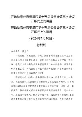 在政协泰州市姜堰区第十五届委员会第三次会议开幕式上的讲话在政协泰州市姜堰区第十五届委员会第三次会议开幕式上的讲话(2024年1月10日)孙靓靓各位委员,同志们:一元复始,万象更新。今天,政协泰州市姜堰区第十五届委员会第三次会议隆重开幕了。这是全区人民政治生活中的一件大事,也是广大政协委员共商姜堰发展大计的一次盛会,我谨代表中共姜堰区委,向大会的召开表示热烈的祝贺!向出席会议的各位委员和同志们致以诚挚的问候!刚刚过去的2023年,是全面贯彻党的XX大的开局之年。一年来,我们坚持以XXX新时代中国特色社会主义思想为指导,以贯彻落实XXX对江苏工作重要讲话重要指示精神为主线,团结一心、真抓实干,推动中国式现代化姜堰新实践实现良好开局。过去的一年,是我们牢记嘱托、感恩奋进的一年。我们把学习贯彻XXX重要讲话重要指示精神和全面贯彻落实党的XX大精神、开展主题教育一体推进,从中感悟责任使命、国之大者、科学方法、人民情怀,更加坚定捍卫两个确立、坚决做到两个维护,全区上下干事创业的精气神更加饱满。过去的一年,是我们拼搏实干、克难攀高的一年。我们积极应对经济恢复进程中的矛盾问题全力推动经济运行稳定向好,预计全年完成地区生产总值880亿元增长6.5%,一般公共预算收入43.56亿元、增长5.5%,全区综合发展实力稳步提升。过去的一年,是我们破局开新、精彩蝶变的一年。我们聚焦美丽姜堰建设,持续抓配套、优环境,新增公园绿地面积26万平方米,G328南绕城快速化、S411姜高路建成通车创成省级特色田园乡村3个、美丽乡村6个,出门就是景、转角遇到美成为姜堰人共同的城市印象。过去的一年,是我们砥砺初心、收获幸福的一年。我们持续开展三访三推动,用心用情改善民生福祉,教育、医疗、养老、托育等优质供给不断扩大全区社会大局保持稳定,广大群众的获得感、幸福感、安全感进一步增强。收获来自和衷共济,发展源于力同心。这些成绩的取得,勠根本在于以XXX同志为核心的党中央坚强领导,根本在于XXX新时代中国特色社会主义思想科学指引,得益于省委、市委的关心和支持,是全区人民众志成城、共同奋斗的结果,也饱含着各级政协组织、广大政协委员的智慧、心血和汗水。一年来,区政协和广大政协委员认真履行政治协商、民主监督、参政议政职能,推动政协工作守正创新、提质增效,为全区高质量发展大局作出了政协贡献。一是服务发展有深度。自觉把政协工作放在发展大局中谋划,围绕现代化产业体系建设、乡村振兴、驻外招商等重点领域,主动谋事、用心干事、协力成事,实现了与中心工作的同频共振。二是为民尽责有温度。始终坚持人民政协为人民,围绕教育、医疗、文化等群众关切,深入开展履职为民助发展专题协商议事活动,推动解决了一批群众关心关切的急难愁盼。三是自身建设有力度。深化党建+品牌建设引导广大政协委员和各界人士集思广益、献智出力,为中国式现代化姜堰新实践贡献了智慧和力量。在此,我代表中共姜堰区委向全区各级政协组织和广大政协委员,向各民主党派、工商联、无党派人士、人民团体和各界人士,表示崇高的敬意和衷心的感谢!各位委员、同志们!今年是中华人民共和国和人民政协成立75周年,是全面完成十四五规划的关键之年。刚刚召开的区委十三届六次全会,号召全区上下始终坚持产业为先、城市为基民生为本,激扬步调一致向前进、躬身实干争头名的奋斗豪情,奋力谱写强富美高新姜堰现代化建设新篇章。宏伟蓝图变成美好现实,需要大家闻令而动、齐心协力,需要大家同心同德、同向同行。希望全区各级政协组织和广大政协委员自觉把思想和行动统一到区委决策部署上来,牢牢把握大团结大联合主题在新的起跑线上步调一致向前进,推动姜堰高质量发展勇立潮头走在前列。一、步调一致向前进,就是要站稳政治立场,校准进的方向。政协是党的政治组织,旗帜鲜明讲政治是第一位的要求。全区各级政协组织和广大政协委员要牢记嘱托、感恩奋进,始终保持对党绝对忠诚。要坚定政治方向不偏移。把坚持和加强党的领导作为根本政治原则和重大政治责任,深刻理解和把握两个确立的决定性意义,切实增强做到两个维护的思想自觉、政治自觉和行动自觉,始终在政治立场、政治方向、政治原则、政治道路上同以XXX同志为核心的党中央保持高度一致。要坚守思想根基不动摇。始终坚持用XXX新时代中国特色社会主义思想凝心铸魂,用XXXXXX关于人民政协工作的重要论述指导实践,把团结民主融入政协履职的方方面面,切实肩负起落实下去、凝聚起来的政治责任。要加强党的建设不停步。时刻牢记政协组织的政治属性、委员的政治身份、协商的政治责任,持续深化党建+工作品牌,确保党委中心工作推进到哪里,政协履职就聚焦到哪里、跟进到哪里,做到区委有号召、政协有响应、委员有行动,上下一心共同奋进新的征程。二、步调一致向