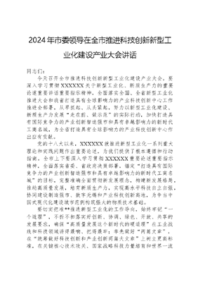 2024年市委领导在全市推进科技创新新型工业化建设产业大会讲话同志们:今天召开全市推进科技创新新型工业化建设产业大会,要深入学习贯彻XXXXXX关于新型工业化、新质生产力的重要论述重要讲话重要指示精神,全面落实全国、全省新型工业化推进大会和我省打造具有全球影响力的产业科技创新中心工作推进会部署,从早抓起、从头紧起,努力以新型工业化建设、新质生产力发展走在前、做示范的实际行动,加快打造具有国际竞争力的产业创新智造强市和具有卓越影响力的新时代工商名城,为全省打造具有全球影响力的产业科技创新中心作出应有贡献。党的十八大以来,XXXXXX就推进新型工业化一系列重大理论和实践问题作出重要论述,为我们提供了根本遵循和行动指南。全市上下要深入学习贯彻XXXXXX重要论述重要指示精神,全面落实省委、省政府决策部署,锚定打造具有国际竞争力的产业创新智造强市和具有卓越影响力的新时代工商名城的目标,完整准确全面贯彻新发展理念,构建新发展格局,推动高质量发展,培育新质生产力,实现高水平科技自立自强,协同建设制造强市、数字无锡和产业科技创新高地,为争当中国式现代化建设城市范例构筑强大的物质技术基础。要切实把准**推进新型工业化的工作导向,始终牢记一个道理,不折不扣落实好创新、协调、绿色、开放、共享的发展要求,确保高质量发展这个新时代的硬道理在工业战线和科技领域讲得最响、把得最牢;率先做好两篇文章,在统筹做好科技创新和产业创新两篇大文章上树立更高标准,在关键核心技术攻关、国家战略科技力量培育和世界一流创新型企业发展上展现更大作为;切实扛起三项重任,加快构建以先进制造业为骨干的现代化产业体系,在发展新质生产力上积蓄更多优势、在转型升级上迈出更大步伐、在开放创新上打开更宽视野;系统搭建四梁八柱,统筹做好重大规划、重大政策的制度设计和机制建设,通过夯基垒台、立柱架梁、系统集成、精准施策,不断增强推进新型工业化的动力与活力。同志们:我就现在**推进新型工业化提出具体要求:一、要持续健全共生共荣的现代产业体系。按照改造提升传统产业、培育壮大新兴产业、布局建设未来产业的思路,落实465现代产业集群培育实施意见和各产业发展三年行动计划,扎实开展传统产业焕新工程,推进重点集群六个一建设和重点产业链高质量发展行动,加快布局人工智能和元宇宙、合成生物、人形机器人、商业航天、低空经济等新赛道,更好发挥基金对产业项目招引、特色园区建设、终端品牌培育的推动作用,打好有链强链、缺链补链、上下延链组合拳,使无锡的产业之树根深叶茂、本固枝荣。二、要持续健全自立自强的科技创新体系。全面融入产业科技创新中心建设,加快各大科技新城和山水东路科创谷建设,全力支持**实验室承担国家战略科技任务,切实组织更多重大基础研究任务,加强产业未来技术储备,布局建设创新飞地,抓紧组建场景应用促进中心,打造更多高能级的中试熟化、产业孵化基地,更大力度推动国货国用,强化对高校、高职人才培养支持,打造不拘一格聚才用才的人才发展型城市,构建从基础研究、到工程化、再到产业化的全链条创新生态体系。三、要持续健全数实融合的数字赋能体系。对照新型工业化所需的数字化、网络化、智能化,加强人工智能技术应用、智能产品培育,积极发展普惠性上云、用数、赋智服务,继续适度超前推进新型基础设施建设,实施数字经济核心产业加速行动,加快市数据要素市场建设,努力在数据产权、流通交易、安全治理等方面不断创出新经验,全力争创国家人工智能创新应用先导区、创建全国中小企业数字化转型城市试点。四、要持续健全蓬勃发展的企业成长体系。大力实施优质企业梯度培育工程,开展筑峰强链企业培育支持计划和专精特新中小企业三赋行动,推动更多专精特新的链节企业向链主企业转型、有一定影响力的优质产品向优势品牌拓展,加快形成链主龙头企业顶天立地、高新技术企业铺天盖地、专精特新企业抢占高地的企业雁阵形态。同时倍加珍惜爱护优秀企业家特别是民营企业家,拿出落实两个毫不动摇两个健康大政方针的过硬举措,依法保护企业家权益,依法保护产权和知识产权,加大对优秀企业家的尊崇宣传力度,引导新生代企业家接好事业班、在新的时代舞台上青出于蓝而胜于蓝。五、要持续健全完备有效的工业治理体系。聚焦新技术新产业发展需求,持续迭代升级优化营商环境行动方案,推出建设外籍人士友好型城市十条措施,进一步完善各类要素市场制度、加快新型要素市场培育,特别是要强化金融要素保障,加大对新兴产业和未来产业的中长期融资支持,围绕优化区域生产力布局,抓实抓好传统载体提升、特色载体提优,按照产业集群+特色园区发展思路,高标准打造一批专业化、特色化、集约化的新型工业化产业示范基地。六、要坚持和加强党的全面领导,完善组织推进机