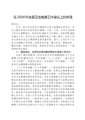在2024年全县卫生健康工作会议上的讲话同志们:今天,我们在这里召开2024年全县卫生健康工作会议,会议主要任务是认真落实党的XXX、全国、全省、全市卫生健康工作会议部署要求,回顾总结2023年工作情况,安排部署2024年重点工作,动员全县卫生健康系统上下凝心聚力,扎实工作,奋力推进全县卫生健康事业高质量发展。刚才,x同志作了全县卫生健康工作报告,报告客观全面,重点突出,措施具体,操作性强,我都完全同意,希望与会同志认真抓好落实。下面,我再讲四点意见:一、提高站位,全面领会贯彻新时期卫生健康工作方针全县卫健系统要深入领会和坚决贯彻XXXXXX关于卫生健康工作的重要论述,牢牢把握十二个坚持、重点关注四个问题,按照省市要求,切实做到四个增强,不断推动卫生健康事业高质量发展。(一)牢牢把握十二个坚持。一是坚持党的全面领导。这是中国特色社会主义制度的最大优势,也是卫生健康事业改革发展的根本保证。二是坚持健康优先战略。这是党的根本宗旨在卫生健康领域的具体体现,也是卫生健康工作在党和国家事业发展全局中的基本定位。三是坚持基本医疗卫生事业的公益性。这是由党的根本立场决定的,也是中国特色卫生健康发展道路的根本原则。四是坚持推进健康中国建设。这是保障人民享有幸福生活的内在要求,也是以中国式现代化推进强国建设、民族复兴伟业的战略布局。五是坚持新时代党的卫生与健康工作方针。这是一以贯之的基本要求,也是全面推进健康中国建设的根本指引。六是坚持大卫生、大健康观念。这是服务人民群众生命全周期、健康全过程的必然选择,也是推动卫生健康工作实现以治病为中心向以人民健康为中心转变的根本途径。七是坚持深化医药卫生体制改革。这是推动解决看病难、看病贵问题的重要抓手,也是推进卫生健康事业发展的根本动力。八是坚持构建强大的公共卫生体系。这是防范化解重大疫情和突发公共卫生风险的根本要求,也是提升人民群众健康水平的重要保障。九是坚持推动中医药传承创新。这是两个结合在卫生健康领域的生动体现也是卫生健康事业发展的中国特色。十是坚持深化医学科技创新和人才培养。这是强国建设的必然要求,也是卫生健康事业发展的重要支撑。十一是坚持推动人口高质量发展。这是事关民族长远发展和亿万百姓福祉的重大决策,也是卫生健康事业的重要使命。十二是坚持构建人类卫生健康共同体。这是构建人类命运共同体的具体实践,也是卫生健康事业发展的全球倡议。(二)重点关注四个问题。一是注重政策措施的步调一致性。注意避免偏离和不到位两种倾向,紧紧围绕党的创新理论和路线方针政策,自觉同XXX新时代中国特色社会主义思想和党的XXX精神对标对表,及时校准偏差。二是注重重大战略措施的连续性。坚持用发展的眼光看问题,洞察大势,把握规律,保持战略定力、不能来回翻烧饼,更不能急于求成、拔苗助长。要一张蓝图绘到底,确保工作的连续性、长期性。三是注重具体策略措施的灵活性。关注人口形势变化对资源配置的影响,关注公立医院经济运行对体系建设的影响,关注乡村振兴和新型城镇化对农村医疗服务的影响。四是注重服务体系建设的方向性。立足更加公平可及、更加整合高效,深入推进人员和技术下沉、医防协同和中西医结合,推动体系建设向基层向纵深发展。(三)切实做到四个增强。一是增强政治意识。要全面贯彻落实新时代党的卫生与健康工作方针,自觉用十二个坚持武装头脑、指导实践,确保事业改革发展始终沿着正确方向稳步前进。二是增强系统观念。要深刻领会重点关注四个问题要求蕴含的整体观、系统观、全局观,加强卫生健康行业系统治理、努力将健康融入所有政策,整体推进卫生健康现代化。三是增强实干精神。要紧盯基层医疗卫生服务能力不强、信息化建设滞后等长期制约发展的瓶颈短板,坚持稳中求进、脚踏实地、埋头苦干,做到稳扎稳打、实干担当、善作善成。四是增强底线思维,要统筹发展和安全,既要全力做好突发重大疫情防控,紧急医学救援、疫苗接种管理、血液安全管理、生物安全管理及公立医院债务化解等具有鲜明行业属性的防风险、保安全、护稳定、促发展工作,还要守牢行业领域安全生产、消防安全等安全底线,确保事业发展行稳致远。二、认清形势,切实增强推进卫生健康事业发展的紧迫感、责任感2023年,全县卫生健康重点工作平稳有序、亮点纷呈。主题教育走深走实,健康帮扶工作深入推进,医疗基础设施持续改善、一老一下保障体系更加健全、市级重点专科建设、中医药文化阵地建设持续加强,传染病、慢性病、尘肺病、地方病防治工作不断提升,清廉医院建设稳步推进,健康镇坪建设取得新成效。这些成绩的取得是县委、县政府正确领导和上级主管部门精心指导的结果,是全县卫生健康系统广大干部职工苦拼实干,奋勇争先的结果,在此,我谨代表县委、县政府向奋战在全县卫生健康战线上的广大干部职工表示衷心的感谢!在肯定成绩的同时,我们