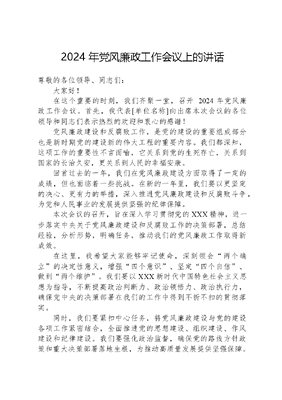 2024 年党风廉政工作会议上的讲话尊敬的各位领导、同志们:大家好!在这个重要的时刻,我们齐聚一堂,召开 2024 年党风廉政工作会议。首先,我代表[单位名称]向出席本次会议的各位领导和同志们表示热烈的欢迎和衷心的感谢!党风廉政建设和反腐败工作,是党的建设的重要组成部分也是新时期党的建设新的伟大工程的重要内容。我们都深知,这项工作的重要性不言而喻,它关系到党的生死存亡,关系到国家的长治久安,更关系到人民的幸福安康。回首过去的一年,我们在党风廉政建设方面取得了一定的成绩,但也面临着一些挑战。在新的一年里,我们要以更坚定的决心、更有力的举措,深入推进党风廉政建设和反腐败斗争,为党和人民事业的发展提供坚强的纪律保障。本次会议的召开,旨在深入学习贯彻党的XXX精神,进一步落实中央关于党风廉政建设和反腐败工作的决策部署,总结经验,分析形势,明确任务,推动我们的党风廉政工作取得新成效。在这里,我希望大家能够牢记使命,深刻领会两个确立的决定性意义,增强四个意识、坚定四个自信、做到两个维护。我们要以XXX新时代中国特色社会主义思想为指导,不断提高政治判断力、政治领悟力、政治执行力,确保党中央的决策部署在我们的工作中得到不折不扣的贯彻落实。同时,我们要紧扣中心任务,将党风廉政建设与党的建设各项工作紧密结合,全面推进党的思想建设、组织建设、作风建设和纪律建设。我们要强化政治监督,确保党的路线方针政策和重大决策部署落地生根,为推动高质量发展提供坚强保障。各位领导、同志们,党风廉政建设和反腐败斗争是一场持久战,需要我们全体同志的共同努力。我们要始终保持清醒的头脑,以永远在路上的坚韧和执着,不断推动党风廉政建设和反腐败工作向纵深发展。最后,希望本次会议能够成为我们深化认识、凝聚共识的平台,成为我们推动工作、落实责任的契机。让我们共同努力,以优良的作风、严明的纪律,为实现全面从严治党的目标,为党和人民事业的发展作出新的更大贡献!下面我提几点要求:一、牢记使命,贯彻两个维护我们要深刻领悟两个确立的决定性意义,增强四个意识、坚定四个自信、做到两个维护。这是我们党在新时代取得的重大政治成果,也是我们党风廉政建设的根本政治任务。1. 我们要加强政治理论学习,不断提高政治判断力、政治领悟力、政治执行力,确保在思想上、政治上、行动上同以XXX同志为核心的党中央保持高度一致。2. 要严守政治纪律和政治规矩,坚决防止和纠正一切偏离两个维护的错误言行,确保党中央政令畅通、令行禁止。3. 要强化政治监督,确保党的路线方针政策和重大决策部署落地生根,为推动高质量发展提供坚强政治保障。二、紧扣中心任务,推进党的建设党风廉政建设是党的建设的重要组成部分,必须紧扣中心任务,与党的建设各项工作紧密结合、相互促进。1. 我们要以党的政治建设为统领,全面推进党的思想建设、组织建设、作风建设、纪律建设,把制度建设贯穿其中,深入推进反腐败斗争,不断提高党的建设质量。2. 要坚持不懈用XXX新时代中国特色社会主义思想武装头脑、指导实践、推动工作,教育引导广大党员干部坚定理想信念,坚守初心使命。3. 要加强基层党组织建设,增强党组织的政治功能和组织功能,打造坚强战斗堡垒。4. 要持之以恒加强作风建设,坚决纠治四风,大力弘扬优良作风,营造风清气正的政治生态。5. 要加强纪律建设,严明党的纪律,强化监督执纪问责,让党员干部知敬畏、存戒惧、守底线。三、确保主体责任贯彻执行到位落实党风廉政建设主体责任是推进全面从严治党的关键。我们要切实担负起这一重大政治责任,层层传导压力,确保责任落实到位。1. 各级党组织要认真履行主体责任,把党风廉政建设纳入工作总体布局,做到与业务工作同部署、同落实、同检查、同考核。2. 党组织书记要切实履行第一责任人职责,班子成员要履行一岗双责,形成齐抓共管的良好局面。3. 要建立健全责任追究制度,对履行主体责任不力的,要严肃追究责任,以严格的问责倒逼责任落实。四、深化纪检监察体制改革,完善监督机制纪检监察体制改革是推进国家治理体系和治理能力现代化的重要内容,也是推动党风廉政建设和反腐败斗争向纵深发展的必然要求。1. 我们要持续深化纪检监察体制改革,完善监督体系,强化对权力运行的制约和监督。2. 要发挥纪检监察机关专责监督作用,加强对关键少数和重点领域的监督,提高监督的针对性和有效性。3. 要贯通各类监督,形成监督合力,提升监督效能。4. 要加强纪检监察干部队伍建设,提高履职能力,打造忠诚干净担当的纪检监察铁军。5. 要健全完善容错纠错机制,激励干部担当作为,为敢于担当的干部撑腰鼓劲。同志们,党风廉政建设和反腐败斗争是全面从严治党的重要内容,是新时期党的建设新的伟大工程的重要组成部分。让我们紧密团结在以XXX同志为核心的党中央周围