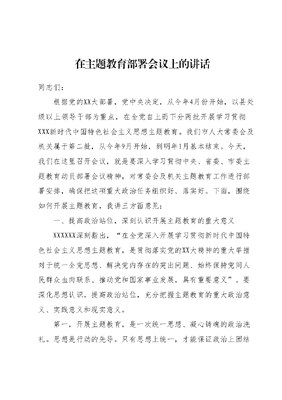 在主题教育部署会议上的讲话同志们:根据党的XX大部署,党中央决定,从今年4月份开始,以县处级以上领导干部为重点,在全党自上而下分两批开展学习贯彻XXX新时代中国特色社会主义思想主题教育。我们市人大常委会及机关属于第二批,从今年9月开始,到明年1月基本结束。今天,我们在这里召开会议,就是要深入学习贯彻中央、省委、市委主题教育动员部署会议精神,对常委会及机关主题教育工作进行部署安排,确保把这项重大政治任务组织好、落实好。下面,围绕如何开展主题教育,我讲三方面意见:一、提高政治站位,深刻认识开展主题教育的重大意义XXXXXX深刻指出,在全党深入开展学习贯彻新时代中国特色社会主义思想主题教育,是贯彻落实党的XX大精神的重大举措对于统一全党思想、解决党内存在的突出问题、始终保持党同人民群众血肉联系、推动党和国家事业发展,具有重要意义。要深化思想认识,提高政治站位,充分把握主题教育的重大政治意义、实践意义和现实意义。第一,开展主题教育,是一次统一思想、凝心铸魂的政治洗礼。思想是行动的先导。只有思想上统一,才能保证政治上团结行动上一致。主题教育的政治意义,就是要推动学习贯彻新时代中国特色社会主义思想走深走实,教育引导党员、干部从思想上正本清源、固本培元,不断提高政治判断力、政治领悟力、政治执行力,增强四个意识、坚定四个自信、做到两个维护,始终在思想上政治上行动上同党中央保持高度一致,做到心往一处想、劲往一处使,共同把党锻造成一块攻无不克、战无不胜的坚硬钢铁。我们要通过理论学习,进一步认识到马克思主义中国化最新成果的真理力量,认识到中国共产党集中统一领导的巨大优势,不断增强忠诚于党的思想政治自觉。第二,开展主题教育,是一次改进工作、推动发展的重要契机。学习的目的在于运用。学习党的创新理论,目的在于武装思想、指导实践、推动工作。主题教育的实践意义,就是要教育引导党员干部学思想、见行动,树立正确的权力观、政绩观、事业观,增强责任感和使命感,不断提高推动高质量发展本领、服务群众本领、防范化解风险本领,加强斗争精神和斗争本领养成,提振锐意进取、担当有为的精气神。要认真学习贯彻党的XX大精神,深入践行全过程人民民主,全面提升立法、监督、代表工作水平,以更加担当有为的精神状态奋进新征程、建功新时代。第三,开展主题教育,是一次自我革新、自我提高的党性锻炼。勇于自我革命,是我们党最鲜明的品格,也是我们党最大的优势。主题教育的现实意义,就是要教育引导各级党组织和广大党员、干部突出问题导向,查不足、找差距、明方向,接受政治体检,打扫政治灰尘,纠正行为偏差,解决思想不纯、组织不纯方面存在的突出问题,不断增强党的自我净化、自我完善、自我革新、自我提高能力,使我们党始终充满蓬勃生机和旺盛活力,始终成为中国特色社会主义事业的坚强领导核心。所以,我们要以开展主题教育为契机,认真查找自己思想上、工作上、作风上存在的差距和不足,通过严肃认真的党内政治生活来强化自身建设,努力打造让党放心、让人民满意的四个机关。二、明确任务要求,扎实推进主题教育有力有序开展本次主题教育的总要求是:学思想、强党性、重实践、建新功。根本任务是:坚持学思用贯通、知信行统一,把XXX新时代中国特色社会主义思想转化为坚定理想、锤炼党性和指导实践、推动工作的强大力量,使全党始终保持统一的思想、坚定的意志、协调的行动、强大的战斗力,努力在以学铸魂、以学增智、以学正风、以学促干方面取得实实在在的成效。具体要达到五个目标凝心铸魂筑牢根本、锤炼品格强化忠诚、实干担当促进发展、践行宗旨为民造福、廉洁奉公树立新风。党中央强调,这次主题教育不划阶段、不分环节,要把理论学习、调查研究、推动发展、检视整改等贯通起来,有机融合、一体推进。具体来讲,我们要重点抓好以下四项工作。一要强化理论学习。坚持读原著、学原文、悟原理,认真研读《XXX著作选读》《XXX新时代中国特色社会主义思想专题摘编》等规定书目,重温XXXXXX考察XXXX重要指示,深入学习XXX法治思想、XXXXXX关于坚持和完善人民代表大会制度的重要思想从党的创新理论中悟规律、明方向、学方法、增智慧,不断提高自身政治能力、思维能力、实践能力。党支部也要制定学习计划通过三会一课、主题党日等形式,组织党员开展集中研读、交流分享、实践教育活动,确保学习全覆盖、有实效。二要深入调查研究。年初,我们聚焦市委XXX重大课题,制定了调研监督意见,由班子成员带队开展专题调研、专项监督全力推动市委决策部署贯彻落实。要认真总结调研成果,形成调研报告,把情况摸清、把问题找准、把对策提实,以高质量调研推动高质量发展。要围绕工作中发现的突出问题开展专题调研,对典型案例进行解剖分析,努力打通影响经济社会发展的痛点堵点。三要深刻检视整改。能不能发现问题、解决问题,是开展