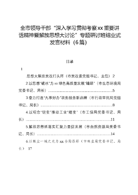 全市领导干部深入学习贯彻考察xx重要讲话精神暨解放思想大讨论专题研讨班结业式发言材料(6篇)目录1.思想大解放发改打头阵(市发改委党组书记、主任)22.以思想破冰为xx绿色高质量发展铺路(市生态环境局党委书记、局长).53.奋力打造九事好办政务服务新品牌(市行政审批局党组书记、局长).84.以观念锐变推动工业嬗变(市工信局党委书记、局长)..115.解放思想抓落实汇聚力量促发展(市自然资源局党委书记、局长)146.以林业一域之光为xx全局添彩(市林业局党委书记、局长)17思想大解放发改打头阵(市发改委党组书记、主任)这次解放思想大讨论专题研讨班的举办,既如一场春雨,及时且通透,更是一针强心剂,提神又醒脑。市发改委将在今后工作中,把解放思想进行到底,在狠抓落实中打头阵,在担当作为上做先锋,重点做好五方面工作。第一,在经济运行分析上做到协调有序,力求三到位一是协调到位。与工信、统计、商务等部门建立更加高效协同的联动机制,定期沟通会商。二是分析到位。深挖经济运行中的隐患点,找准着力点和突破点,把基本盘做实做稳。三是参谋到位。聚焦当前我市经济社会发展亟待突破的重点、热点、难点问题,提出针对性、操作性强的政策建议,为市委、市政府决策提供参考。第二,在做大经济总量上做到手底有招,力求三聚力一是聚力重大项目建设。紧扣大抓项目年活动,深入实施基础设施(交通)攻坚行动,推进百个重点项目和2281个重大项目,力争年度投资突破2000亿元。二是聚力做强现代服务业坚持生产、生活、生根性服务业三生联动,整合现有服务业支持政策条款,探索一文知全策模式,为xx积聚财气人气和底气。三是聚力做优营商环境。积极融入全国统一大市场,深化要素市场化改革,做响九事好办品牌,把xx打造成为创业热地、成本洼地和营商福地。第三,在推进项目建设上做到统筹有方,力求三协同坚持项目全生命周期管理,做到谋划、争取、服务三链协同。一是守正出新谋项目。盯紧政策窗口、产业风口和投资切口,聚焦实体经济、龙头企业,超前谋划,招引和储备一批项目。二是开拓创新争项目。聚焦国家支持的重点领域,指导县区和部门储备一批大项目、好项目,确保政策来了能够接得住、接得好。三是秉持初心服项目。建立项目分级管理问题清单,在各关键环节上靠前服务,及时解决各类困难问题,确保项目有序推进。第四,在保障民生福祉上做到眼中有爱,力求三贴近一是贴近兜底民生。完善一老一小服务体系,推进落实基本养老服务清单,推动发展银发经济。二是贴近改善民生。加快教育、卫生等改善型公共基础设施建设,合理布局和储备一批平急两用项目。全力做好保供稳价和能源安全工作。三是贴近品质民生。巩固生态优势,积极争创国家儿童友好城市、产教融合试点城市和城市社区嵌入式服务设施建设试点城市,促进共同富裕。第五,在锻造发改铁军上做到肩上有责,力求三提升一要提升战略高度,强化创新理论学习。深入学习领会习近平总书记重要讲话和重要指示批示精神,坚持不懈用习近平新时代中国特色社会主义思想武装头脑、指导实践、推动工作,不断提高政治判断力、政治领悟力、政治执行力。二要提升战术素养,持续推进作风建设。持之以恒深化能力作风建设,彻底改变工作作风。三要提升战斗能力,优化干部队伍建设。优化干部结构,组建业务骨干队伍,定期开展发改大讲堂活动,不断提高干部能力水平,锻造敢闯、敢干、善谋、善成的发改铁军。以思想破冰为xx绿色高质量发展铺路(市生态环境局党委书记、局长)解放思想是创新发展的引擎。市委书记xx亲授的第一课让全市生态环境系统深受鼓舞,同时也倍感压力。市生态环境局将开启解放思想的总开关,以思想破冰为xx绿色高质量发展铺路,为高标准高质量建设长江经济带重要节点城市体现环保担当。一是提高站位、改进作风。解放思想是干事创业的原点。生态环境工作作为一项业务性很强的