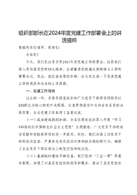 组织部部长在2024年度党建工作部署会上的讲话提纲尊敬的各位领导、同事们:大家好!今天,我们在这里召开2024年度党建工作部署会,这是我们深入贯彻落实党的XX大精神、全面推进党的建设新的伟大工程的重要会议。在此,我代表县委组织部,向大家汇报一下我县党建工作的现状和未来的工作思路。一、党建工作现状过去的一年,全县各级党组织和广大党员干部紧密团结在以XXX同志为核心的党中央周围,认真贯彻落实中央和省市县委的决策部署,全县党建工作取得了显著成效。(一)政治建设得到加强。全县各级党组织深入开展学习XXX新时代中国特色社会主义思想主题教育,广大党员干部的政治觉悟和党性修养得到进一步提升。同时,我们加强了对党员干部的政治监督,严肃查处违反政治纪律和政治规矩的行为,确保了全县党员干部在政治上的坚定性和纯洁性。(二)基层组织建设不断完善。我们坚持三会一课等基本制度,加强了对基层党组织的指导和服务,推动了基层党组织的全面进步和全面过硬。截至目前,全县共有基层党组织232个,其中先进基层党组织占比达到69%,基层党组织的凝聚力和战斗力得到了进一步提升。(三)党风廉政建设深入推进。我们坚持无禁区、全覆盖、零容忍,坚决查处违纪违法行为,营造了风清气正的政治生态。去年,全县共查处违纪违法案件23起,给予党纪政务处分21人,其中县处级干部1人,形成了有力的震慑效应。(四)党建引领作用凸显。我们坚持党建引领发展,将党建工作与经济社会发展紧密结合起来,推动了全县各项事业的蓬勃发展。去年,全县实现地区生产总值1432亿元,同比增长12%,城乡居民人均可支配收入分别达到4312元和3212元,同比增长3%和2%。二、未来工作思路尽管我们在党建工作中取得了一定的成绩,但也要清醒地看到存在的问题和不足。比如,一些党员干部的政治素养和党性修养还需要进一步提高;一些基层党组织的建设还需要进一步加强一些领域和部位的党风廉政建设还需要进一步深入。因此,我们要以更加饱满的热情和更加务实的作风,全面推进党的建设新的伟大工程。(一)深入学习贯彻党的XX大精神。我们要把学习贯彻党的XX大精神作为当前和今后一个时期的首要政治任务,通过组织专题学习、研讨交流、宣传宣讲等形式,推动党的XX大精神深入人心、落地生根。同时,我们要把学习成果转化为推动工作的强大动力和实际成效,确保全县党建工作始终沿着正确的方向前进。(二)全面加强党的政治建设。我们要坚持把政治建设摆在首位,加强对党员干部的政治教育和政治监督,引导广大党员干部始终保持政治上的坚定性和纯洁性。同时,我们要加强党组织的政治功能和组织力建设,确保各级党组织始终成为坚强有力的战斗堡垒。(三)深入推进全面从严治党。我们要坚持全面从严治党永远在路上,以党的政治建设为统领,全面推进党的思想建设、组织建设、作风建设、纪律建设和反腐败斗争。我们要加强对权力运行的制约和监督,加强对党员干部的日常管理和监督,坚决查处违纪违法行为,营造风清气正的政治生态。(四)强化党建引领作用。我们要坚持党建引领发展,将党建工作与经济社会发展紧密结合起来,推动全县各项事业的蓬勃发展。我们要加强基层组织建设,发挥基层党组织的战斗堡垒作用和党员的先锋模范作用,推动基层党组织全面进步、全面过硬同时,我们要加强党建宣传工作,营造良好的舆论氛围和社会共识,为全县经济社会发展提供坚强保障。(五)加强自身建设。我们要不断加强自身建设,提高综合素质和能力水平。我们要注重学习新知识、积累新经验、增长新本领,不断提高自身素质和能力水平。同时,我们要严格遵守党的纪律和规矩要求,做到廉洁奉公、勤政为民。我们要加强与各单位的沟通协调工作,形成合力推动全县党建工作不断取得新成效。最后,我希望大家能够认真贯彻落实本次会议精神,积极参与到全县党建工作中来。让我们携手共进、勇攀高峰!谢谢大家