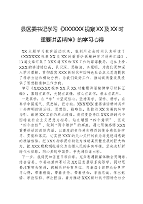 县区委书记学习《XXXXXX视察XX及XX时重要讲话精神》的学习心得XX主题学习教育活动以来,我利用业余时间认真研读了《XXXXXX视察XX及XX时重要讲话精神学习材料汇编》,13篇文章汇集了XXX对XX和XX工作的谆谆教导,总体上看,XXX的讲话站位高、认识深、思路清、条理明,为我们更加深入学习理解、贯彻落实XXX新时代中国特色社会主义思想提供了科学方法和模块分析,为我们做好工作、推动高质量发展提供了思想指南和工作方向。学习《XXXXXX视察XX及XX时重要讲话精神学习材料汇编》,基础在真学,关键在真懂,核心在真信,根本在真用。一是真学,在学中坚定信心。坚持真学、深学、精学,在真学中固底气、筑忠诚、把方向。XXXXXX重要讲话精神具有十分鲜明的政治性、思想性、战略性,是推动XX发展的科学指引、做好XX工作的根本遵循。我们要坚持以XXX新时代中国特色社会主义思想为指导,站在增强四个意识、坚定四个自信、做到两个维护的高度,用心用情感悟XXX重要讲话的深刻内涵,以高度的责任感和强烈的使命感抓好学习、贯彻和落实,切实把XXX的关心关怀转化为对党绝对忠诚的政治信仰,把XXX指示要求转化为推动高质量发展的巨大动力,把XXX殷殷嘱托转化为造福人民的务实举措,坚决走好新时代长征路,同心共筑中国梦、争先进位谋出彩。下一步,我将更加注重日常自学,充分利用新媒体融会贯通学,结合省委、市委决策部署以及XX区发展联系实际学,同时还要注重带头宣讲,向联系和分管单位、向基层干部群众分享学习心得,带着感情、带着责任、带着使命,学出忠诚、学出觉悟、学出信仰、学出担当,着力推动XXX新时代中国特色社会主义思想在XX区落地生根。二是真懂,在懂中融会贯通。精读字面和文义,弄懂根本和精髓,深刻把握贯穿其中的马克思主义立场、观点和方法。深刻领会XXXXXX关于XX经济社会发展的总目标总要求,紧盯我区十四五发展目标,坚持新发展理念,统筹做好稳增长、促改革、调结构、惠民生、防风险、保稳定各项工作;深刻领会XXXXXX关于推动经济高质量发展的重大要求,坚定高质量发展不动摇,以党的建设高质量推动经济发展高质量;深刻领会XXXXXX关于扎实实施乡村振兴战略的重大要求,认真谋划沿黄生态带和乡村振兴示范带,扎实推进乡村振兴二期、三期、四期工程;深刻领会XXXXXX关于高度重视生态保护工作的重大要求,深入贯彻XXX生态文明思想,擦亮XX区绿色发展的底色,打造北美靓丽品牌;深刻领会XXXXXX关于切实保障和改善民生的重大要求,以更大力度、更实举措抓好民生工作;深刻领会XXXXXX关于推动文化繁荣兴盛的重大要求,推动文化强区、活区;深刻领会XXXXXX关于黄河流域生态保护和高质量发展的重大要求,充分认识保护黄河、治理黄河的重大意义,建立完善清四乱相关管理制度,打造黄河柳园口明珠。真正学懂弄通做实XXX新时代中国特色社会主义思想,不断提高运用党的创新理论指导应对重大挑战、抵御重大风险、化解重大矛盾、解决重大问题的能力。三是真信,在信中保持定力。要自觉增进政治认同、思想认同、情感认同,把思想的力量变成内心的强大正能量,始终保持理想和信念的坚定。不仅要入眼入耳,更要入脑入心,还要在灵魂深处敲响鼓,在思想深处起共鸣。要更加坚定对以XXX同志为核心的党中央的信赖,更加坚定走中国特色社会主义道路的信念,更加坚定谱写新时代更加出彩篇章的信心,树牢四个意识,坚定四个自信,坚决做到两个维护。当前,我们各项事业已经进入高质量发展阶段,更要用心领会、用情感悟、用力落实XXXXXX一系列重要指示要求,坚决以党的建设高质量推动经济发展高质量,以过硬的作风、优异的成绩向党和人民交出一份完美答卷。四是真用,在用中担当作为。学懂、弄通是前提,用好、做实是根本。我们要进一步强化政治担当,坚持以XXX新时代中国特色社会主义思想武装头脑、指导实践、推动工作。要在应对各类风险挑战上积极作为,统筹推进疫情防控和经济社会发展,做好常态化疫情防控的同时,紧盯十四五规划任务和高质量发展目标,全力以赴做好六稳六保工作,着眼长远打基础、抓项目、攒后劲。要在推动高质量发展上积极作为,加快文商旅产业提质增效,加大精准选商选资力度,优化营商环境促进项目早建成早见效,统筹抓项目、抓规划、抓产业,拿出新思路、新方案、新举措。要在保障和改善民生上积极作为,扎实推进脱贫攻坚和乡村振兴有效衔接,大力开展农村人居环境整治,着力破解民生八需八难,强力推进专项整治和老旧小区改造,把以人民为中心的发展思想真正落实在行动上、体现到成效上,尽力而为、量力而行,解决好群众急忧盼问题,全面提升群众的获得感、幸福感、安全感。