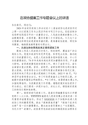 在政协提案工作专题会议上的讲话各位委员,同志们:2024年省政协提案工作会议是十三届省政协也是政协历史上第一次以提案工作为主题召开的专项工作会议,是经省政协党组研究同意召开的一次重要会议。人民政协提案的整体工作,由提案质量、办理质量、服务质量三个方面组成,今天这个会议要解决和研究的是提案质量问题,是部署政协提案、研究如何提案、确保提案高质量的专题会议。一、从政治和全局高度真正重视提案工作提案工作是人民政协历史悠久、特色鲜明、覆盖面广的全局性工作,是党和政府听取民声民意、科学民主决策、推动改进工作的重要形式,也是人民政协服务党和国家大局、中心任务的重要途径,70多年来越来越发挥更加重要的作用、产生重大影响。省委高度重视政协提案工作,建立了省委书记、省长全面督办重点提案,省委、省政府、省政协领导同志领办督办重点提案,省委常委会会议专题听取重点提案督办情况汇报、省政府相关厅局主办重点提案的工作机制。2022年11月,*主持召开省委常委会会议,专门听取提案督办工作情况汇报,并就提升提案质量提出明确要求。*专门研究、部署提案办理工作,加强统筹指导。为提高提案工作质量,增强提案实效性提供了有力保证。我们要进一步提升站位、深化认识,增强做好提案工作的责任感和使命感。第一,做好新时代提案工作,是落实领袖重要指示之所需党的十八大以来,XXXXXX就促进人民政协事业发展发表一系列重要讲话重要指示,形成了XXXXXX关于加强和改进人民政协工作的重要思想,提出提高提案质量提案不在多而在精等一系列重要要求,要求政协委员要树立为国履职、为民尽责的情怀,政协委员包括政协组织都是国家治理体系的重要组成部分,广大委员和政协各参加单位行使民主权利、提出提案,党和政府相关部门尊重委员民主权利、认真办理提案,是全过程人民民主的生动实践。特别是提案工作将协商民主贯穿提案的提出、审查、立案、办理、督办、评价各环节,成为人民政协讲政治、促发展、惠民生的最直接、最生动、最有效的实践,有利于扩大有序政治参与、确保协商民主真实管用,切实把领袖重要指示落到实处。第二,做好新时代提案工作,是助推现代化*建设之所需。围绕中心、服务大局是人民政协履职的基本准则,也是提案工作的重要遵循。近年来,广大政协委员牢记XXX奋勇争先、更加出彩重托,聚焦两个确保十大战略,在科技创新、人才引育、数字化转型、民营经济发展、文旅文创融合、农业强省建设等方面积极建言献策,集中反映了时代大局之需、*发展之重、人民群众之盼。让各级党委政府和人民群众看到:一份好的提案,就是一项重大工作的加速器,就是一份民生福祉的助推器,有利于推动各部门各单位把委员提案意见建议转化为解决突出问题的新举措,建立解决共性问题的新机制,化解风险挑战的新工具,最大限度地凝聚共识、凝聚人心、凝聚力量,有助于为中国式现代化建设厚植政治基础、社会基础和群众基础。第三,做好新时代提案工作,是履行人民政协职能之所需人民政协履行职能、发挥作用的形式多种多样,有会议、提案、委员视察、专题调研、反映社情民意信息、文史资料等。提案工作因政治属性突出、问题导向鲜明、内容涉及面广、协商优势明显,经过70多年的发展,已经成为人民政协履行职能最直接、最广泛、最有效的重要方式。提案工作与其他经常性工作紧密相连,其内容涵盖经济社会发展各个方面,提案办理涉及各级各地各部门。集中力量抓好提案工作,充分调动广大委员履职的积极性、主动性、创造性,通过有问有答、坦诚协商、转化运用,推动人民政协专门协商机构作用和政治制度优势不断得到彰显。二、把提高提案质量作为政协履职主攻目标质量是提案工作的生命。全国政协主席王沪宁强调,要强化质量意识,坚持问题导向,不断改进提高,推动提案工作上水平、上台阶。总体看,提案质量的高低,反映着人民政协参政议政的能力和水平,决定着提案的作用发挥和办理实效,也关系到党派、团体、委员履职的整体形象。近年来,广大政协委员和政协各参加单位提交提案的积极性越来越高,数量逐年增加,质量稳步提高。但也存在一些需要重视的问题:比如有的委员对人民政协肩负的政治使命缺乏深刻认识,角色意识淡漠,挂名不履职,不愿提提案;履职能力不强,创新意识不足,不会提提案;调研不深、分析不透,提不出好提案等。十二届省政协期间,114名委员的提案履职是空白,占委员总数的13%;各界别、委员小组、人民团体、专门委员会年均提出集体提案4件以下。十三届省政协一次会议以来,仍有一定数量的委员未提交提案等。这些都是我们要正视解决的问题,也是本次会议的初衷和目的所在。应当说明的是,*历来是提案工作先进省份,在全国政协有地位,在全省大局中有影响,在政协履职工作中有贡献,我们要着眼于更优、更实、更有效,牢牢把握坚持党的全面领导,坚持以人民为中心,坚持围绕中心服务大局,坚持全过程协商,